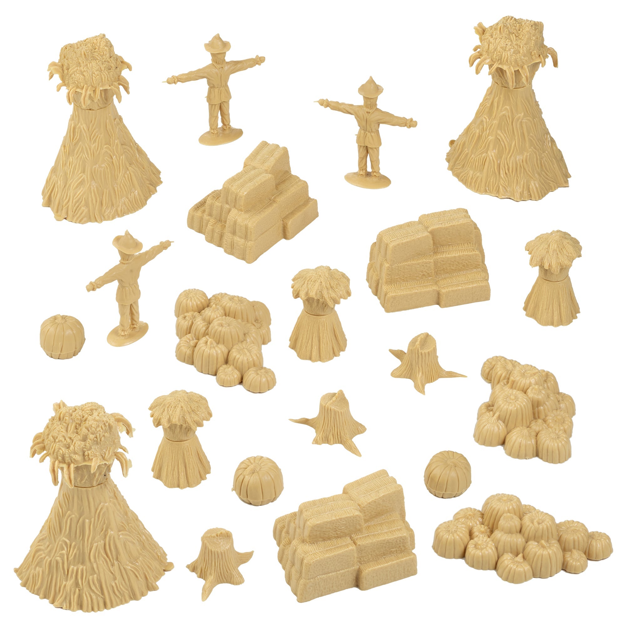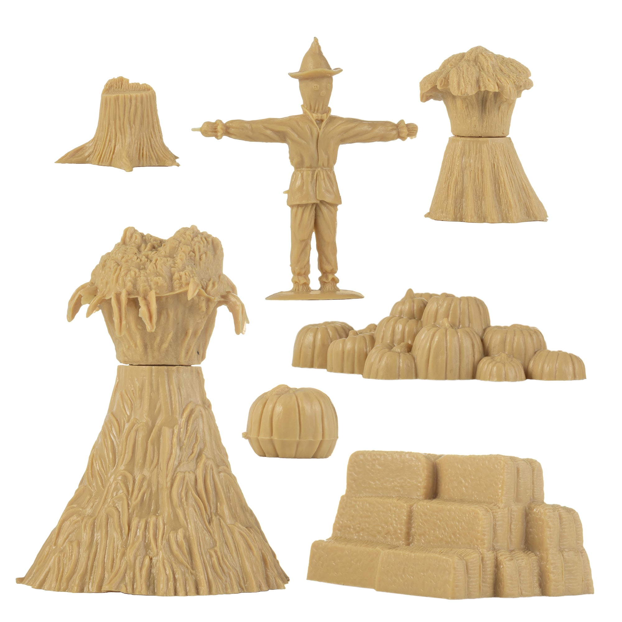 From the Classic Army Men Collector Series, BMC Toys brings more toys from the Golden Age of American Made Playsets. This 21 piece Playset includes 3 each of these favorite fall harvest pieces: Corn Shock, Wheat Shock, Hay-bale Stack, Pumpkin patch, Big Pumpkin, Tree Stump & Scarecrow figure All parts are made from slightly stiff Tan color HDPE plastic and will work well with scales from 1:35 to 1:24.
