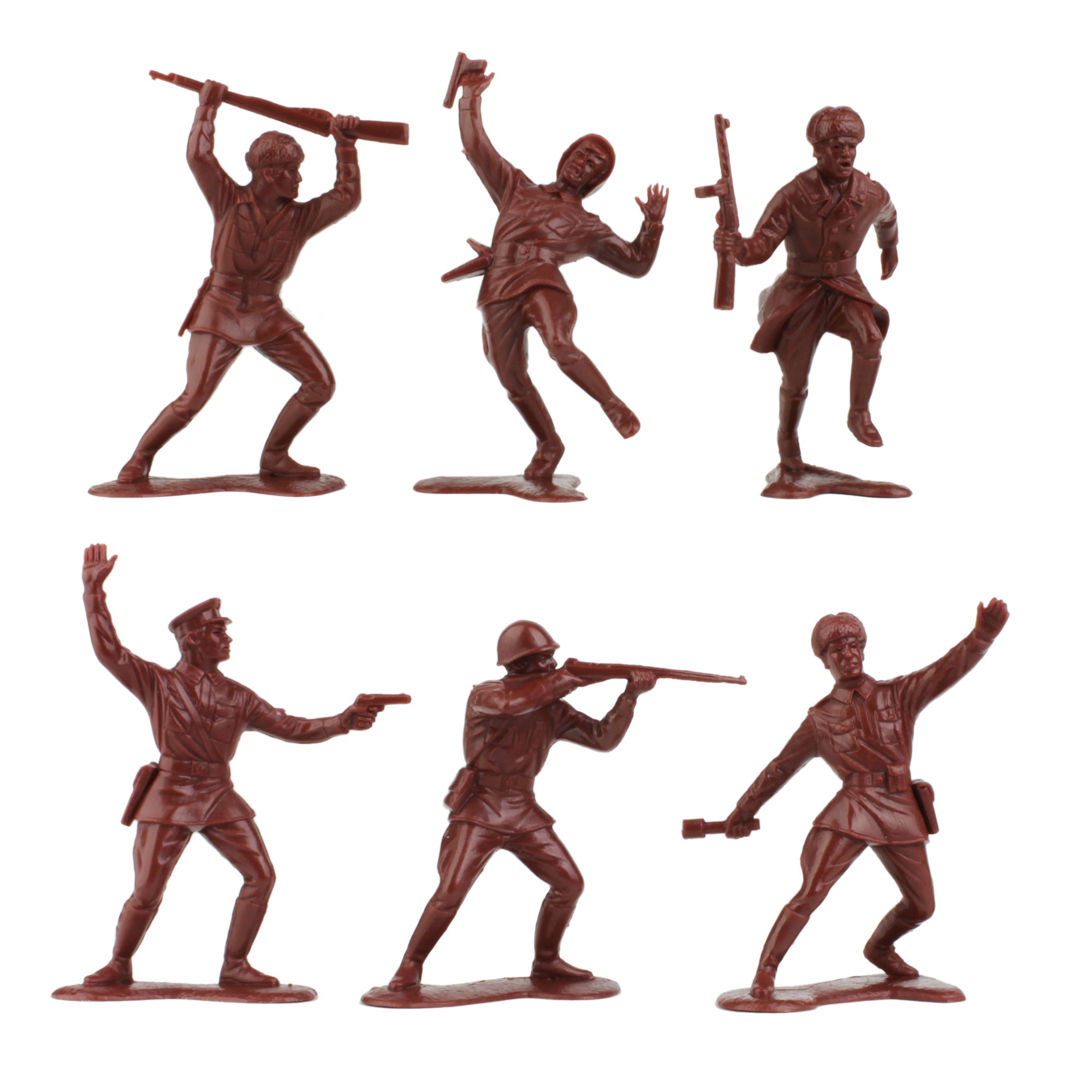 From the Classic Army Men Collector Series, BMC Toys brings back another classic Set of figures from the golden age of Army Men Playsets. This bag of 36 Rust-Brown Russian Plastic Army Men is proudly manufactured in the United States and features 6 different figures. Troops are approximately 1:32 scale and stand up to 2.25 inches tall. Made from slightly flexible LDPE plastic with fine details and almost no flashing. Includes approximately 4 each of the standing riflemen, shot soldier, officer, and about 8 each of figures running with burp SMG, throwing grenade, and butting with rifle. These USSR Soldiers were originally introduced in the 1960s by Louis Marx Company as Allies in some of their famous WW2 Battleground Playsets. They were later produced by other companies (possibly HG TOYS) and did duty as stand-ins for Korean and even Iraqi forces in some later Playsets. They were later produced in hard plastic for the hobby market. These will make excellent troops for a variety of set ups from Western Front in WW2 to Cold War conflicts with Russia, the Soviet Union communists, or generic bad-guys for your regular Green Army men. This is a Set of real American Made plastic toys, meant to be set up, knocked down, picked up and played with for many years to come. Little Green Army Men have even been inducted into the National Toy Hall of Fame. Packed in clear bag with insert card and recommended for ages 5 and up.