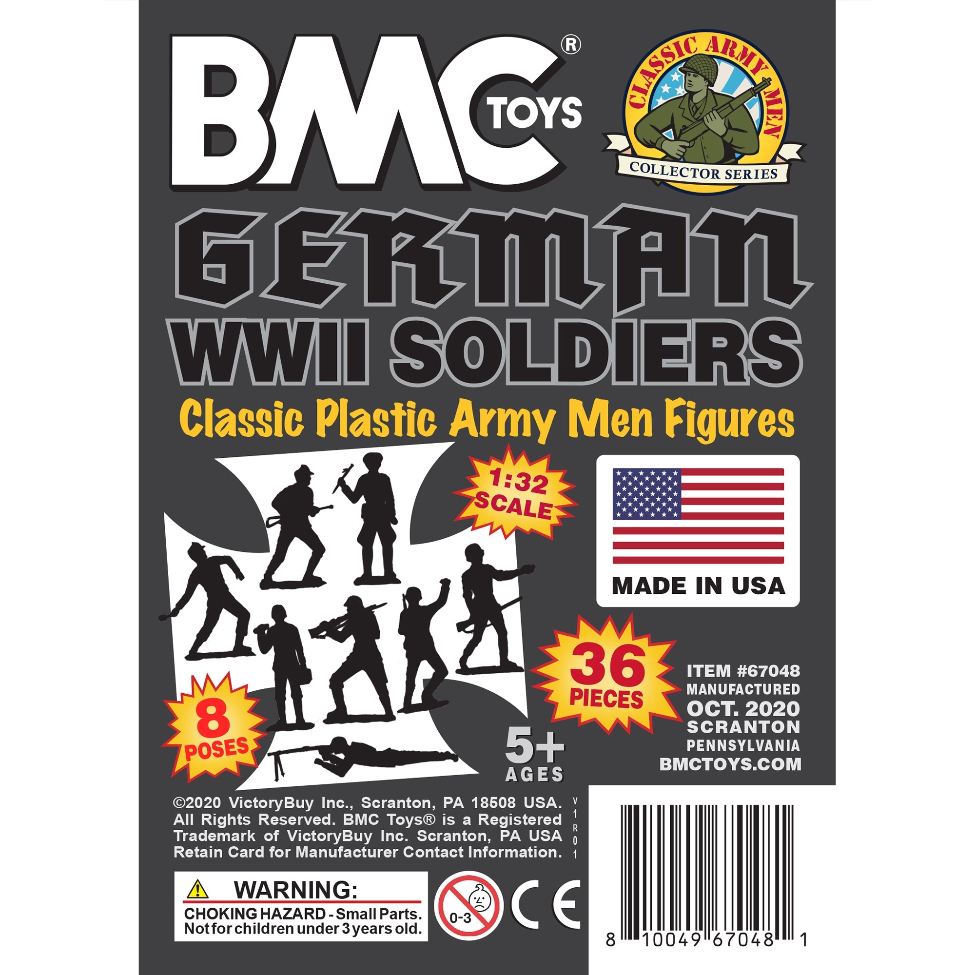 From the Classic Army Men Collector Series, BMC Toys brings back another classic Set of figures from the golden age of Army men. This bag of 36 Coal-Black German Plastic Army Men is proudly manufactured in the United States and features 8 different figures. The quantity of each figure pose will vary, but each package includes at least 2 of each figure. Troops are approximately 1:32 scale and stand up to 2.4 inches tall. Made from slightly flexible LDPE plastic with good details and some figures may have flashing due to the age of this plastic injection tool. These troops were originally introduced in the 1960s by MPC, also known as Multiple Toymakers, Multiple Products Corporation and Miner Industries. The figures originally had 1/4 inch holes in the bases that would plug into various accessories. For this reissue the holes have been closed up so they match other figures better. These were later produced by other companies and even included in a Marx Battleground Playset revival in the 1990s. These will make excellent troops for a variety of set ups for your WW2 Green Army men. This is a Set of real American Made plastic toys, meant to be set up, knocked down, picked up and played with for many years to come. Little Green Army Men have even been inducted into the National Toy Hall of Fame. Packed in clear bag with insert card and recommended for ages 5 and up.
