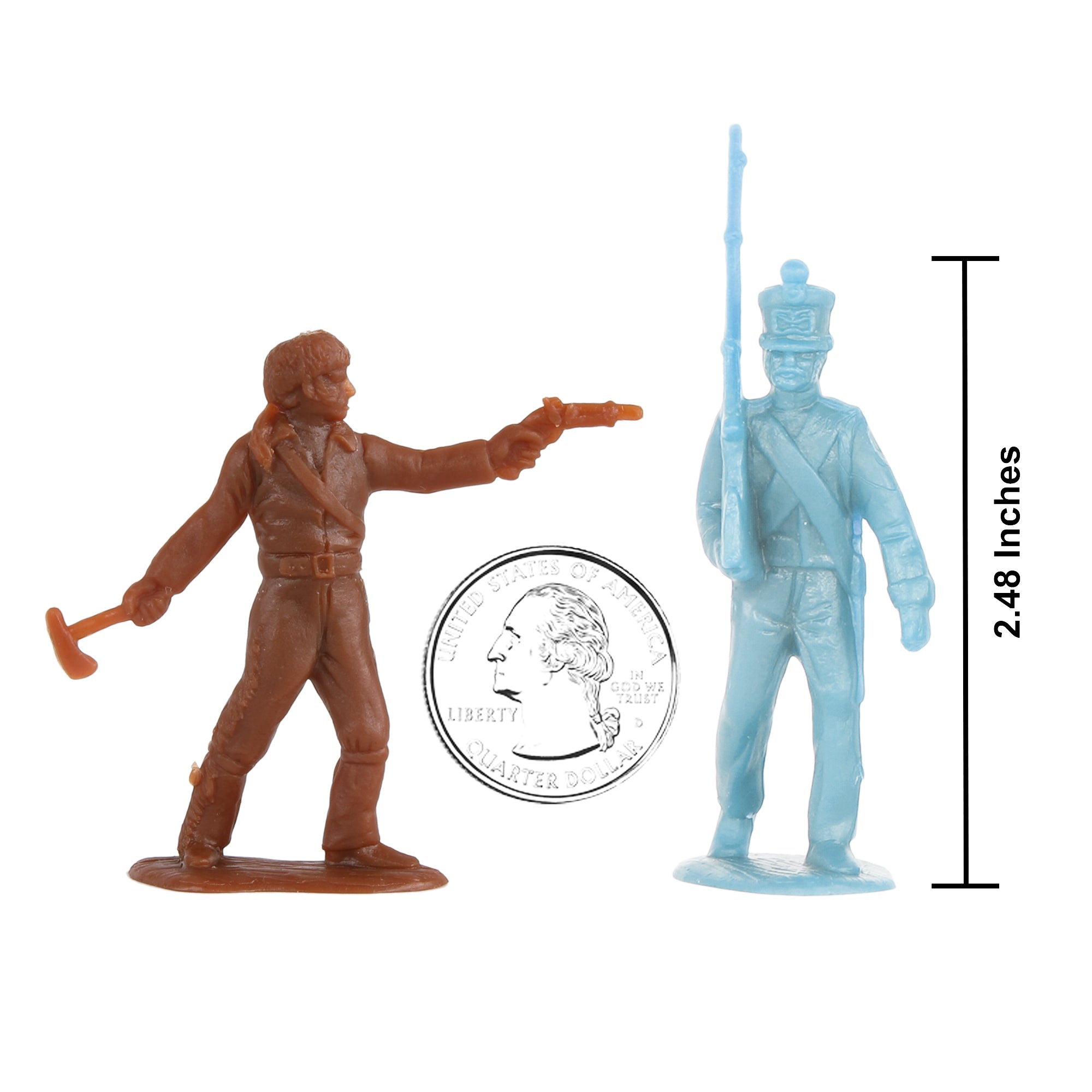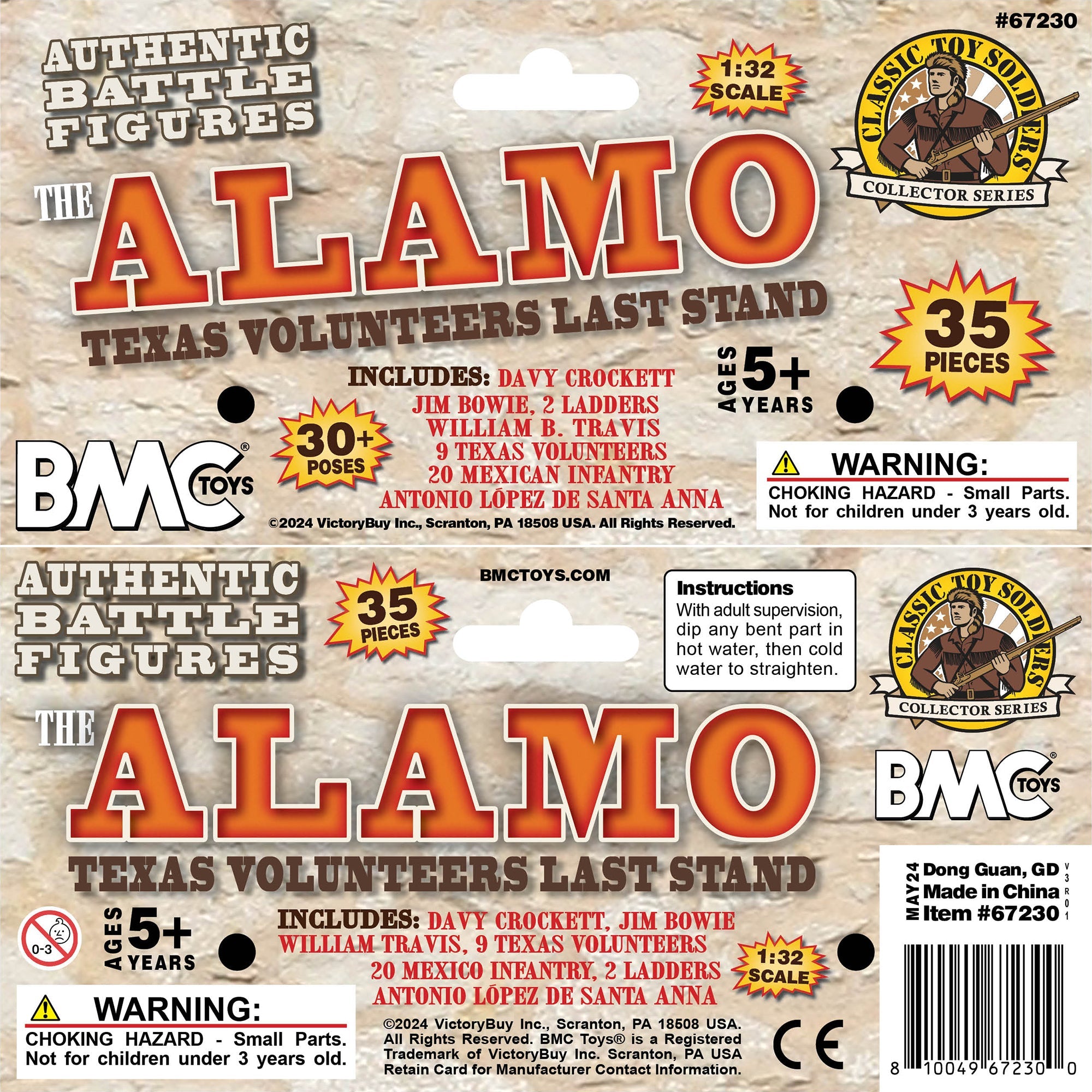 From the BMC Toys Classic Toy Soldier Collector Series, the Battle Texas never forgets. The Alamo Texan's Last Stand 35 piece Plastic Army Men Set features 12 Brown color Texas Volunteers including Davy Crockett, Jim Bowie, and William B. Travis. Powder-blue Mexican Soldiers include riflemen, bugler, officer, flag bearer, and Antonio López de Santa Anna. Set features 6 inch ladder, 5.5 inch pole ladder, a climbing figure, and 2 ladder carrying figures. Figures are made of LDPE plastic with medium detail and very little flashing, ladders are brown color stiff ABS plastic. Figures stand up to 2.48 inches tall and are approximately 1:32 scale. These figures were initially offered to hobby collectors by Classic Toy Soldiers Company in the 1990s. Classic Toy Soldiers Co. worked with BMC Toys to make them available to today's youngsters. BMC Toys was founded by Bill McMaster in 1991 and specializes in producing historically accurate Plastic Army Men figures and Playsets in the classic realistic classic realistic miniature style of the 1950s and 1960s. Instructions: With adult supervision, dip any bent part in hot water, then cold water to straighten. These figures are a perfect addition to any 18th century and Revolutionary War Playsets or school project diorama. Packaged in clear bag with header card and recommended for ages 5 and up.
