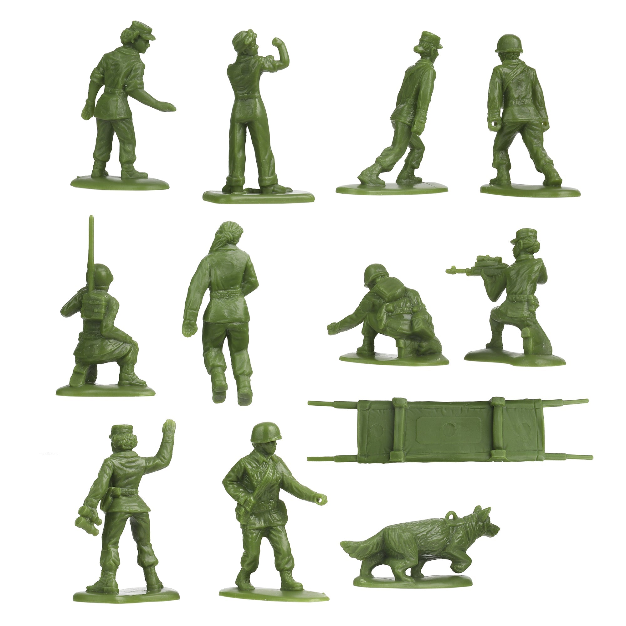 Introducing the Plastic Army Women Collector Series from BMC Toys. This all new Set of female figures is designed in the classic style of the best Plastic Army Men of the mid-20th century. This Set includes 24 pieces in 10 different poses along with a working dog with leash and stretcher accessories. The poses include Pathfinder Captain, Kneeling Sharpshooter, Combat Medic, Radio Operator, Wounded Soldier, Nurse, Corpsman, Mechanic, Military Working Dog, MWD Handler, and stretcher accessory.