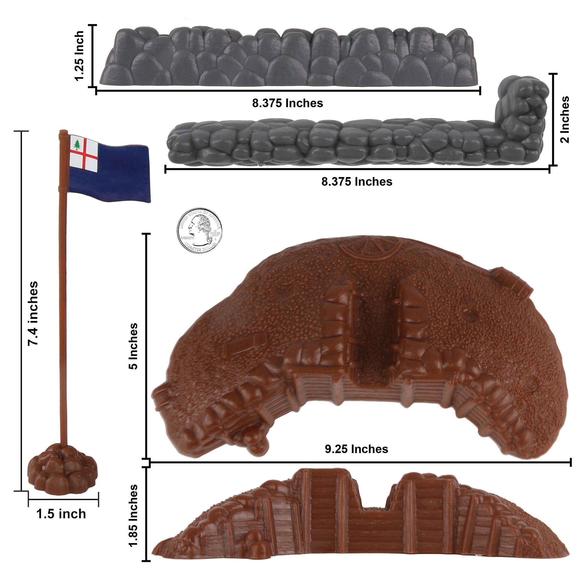 From the BMC Toys American Hero Collector Series, an early defeat for the Americans and costly victory for the British. The American Revolutionary War Battle of Bunker Hill 115 piece Plastic Army Men Playset features 22 different figures and includes 33 blue Colonial Americans and 33 British Empire Redcoats. Also includes character figure of General George Washington astride his horse 'Blueskin'. Set includes 4 cannon with rolling wheels, 4 mortar, and lots of terrain and camp accessories. Supplies include a large crate, small crate, supply stack, camp supplies terrain piece, camp fire, wooden wheel cart, and 2 farm horses. Terrain pieces include 3 redoubt positions, 4 stone walls, 3 leafy green trees, 6 rustic fences, 12 spike barricades, 2 brown rocks, and 2 flags.