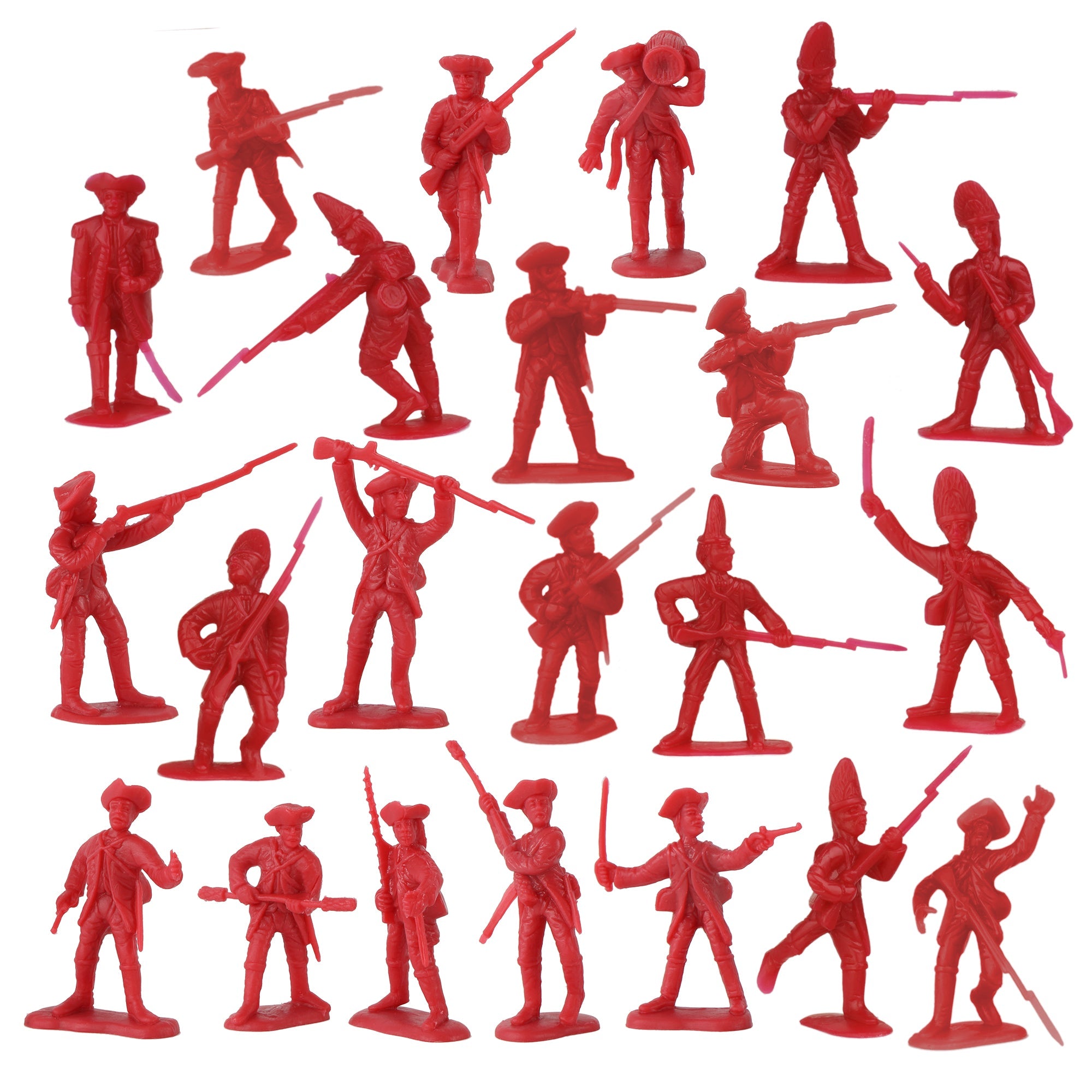From the BMC Toys American Hero Collector Series a decisive victory for the Americans that changed the course of history. The American Revolutionary War Battle of Yorktown 208 piece Plastic Army Men Playset features 30 different figures and includes 42 blue Colonial Americans, 42 British Empire Redcoats, 23 antique-white French, and 25 coal-black Hessian troops. Also includes character figures of General Charles Cornwallis, General Marquis de Lafayette and General George Washington astride his horse 'Blueskin'. Set includes 8 cannon with rolling wheels 8 mortar, and lots of terrain and camp accessories. Supplies include 3 large crates, 3 small crates, 2 supply stacks, camp supply terrain piece, 3 camp fires, hanging pot, table and 4 stools, 2 wooden wheel carts, and 2 farm horses. Terrain pieces include 4 large redoubt positions, 2 split rail and stone fences, 3 leafy green trees, 2 bare trees, 6 rustic fences, 12 spike barricades, 2 brown rocks, and 2 flags. All pieces are approximately 1:32 scale. Figures stand up to 2.3 inches tall and are made from soft flexible plastic with medium detail and very little flashing. Accessories are made from slightly to very stiff plastic. BMC Toys was founded by Bill McMaster in 1991 and specializes in producing historically accurate Plastic Army Men figures and Playsets in the classic realistic classic realistic miniature style of the 1950s and 1960s. Instructions: With adult supervision, dip any bent part in hot water, then cold water to straighten. These miniature figures are a perfect addition to any American War for Independence Playset or school project diorama. Packaged in a full color box featuring a history of the battle story. Recommended for ages 5 and up