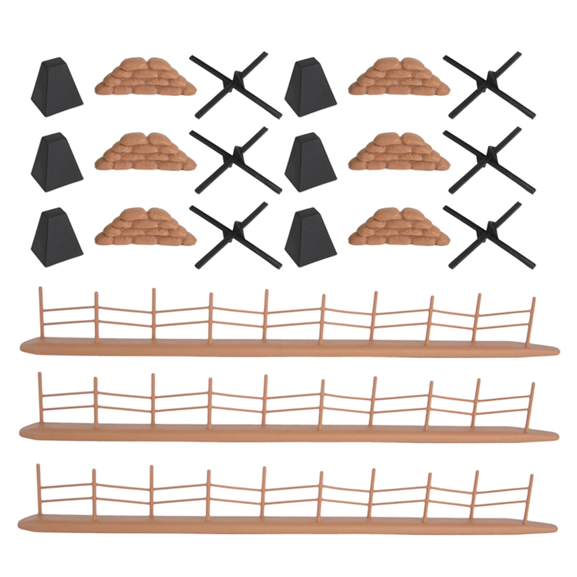 From the BMC Toys American Hero Collector Series, one of the greatest fortifications in military history: The D-Day Atlantic Wall 21 piece accessory Set features 3 Barbed Wire Fence sections, 6 Sandbag Stacks, 6 Dragon's Teeth Tank Traps, and 6 Czech Hedgehog Tank Traps. Made from fairly stiff, very durable, polypropylene plastic with almost no flashing. The fence measures 12.25 inches long. Dragon's teeth 1 inch tall, czech hedgehogs are 2 inches square, and sandbags 2.5x.8x.44 inches. All pieces are about 1:32nd (54mm) scale, but they will work well with many other scales. BMC Toys was founded by Bill McMaster in 1991 and specializes in producing historically accurate Plastic Army Men figures and Playsets in the classic realsitic style of the 1950s and 1960s. Packaged in clear bag with header card and recommended for ages 5 and up. This is a new assortment for 2017 and features all new header card art.