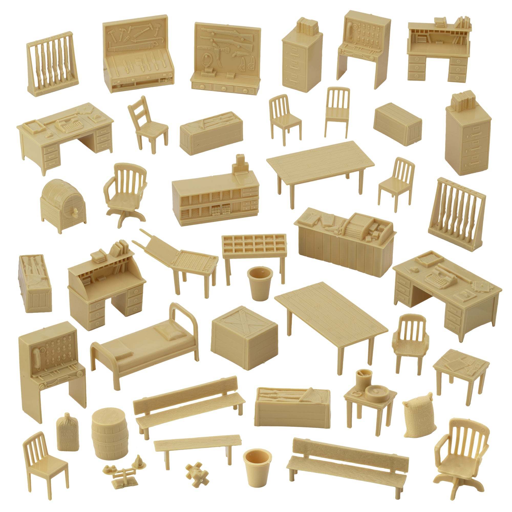 From the Classic Army Men Collector Series, BMC Toys brings back more classic toys from yesteryear. This 44 piece Set includes a wide variety of furniture and accessories made from slightly stiff tan color HDPE plastic with a little flashing. Pieces include desks, chairs. file cabinets, waste paper baskets, communications switchboards, benches, tables, bed, barrels, crates, rilfe crates, racks of rifles, barber chair, roll of Barbed Wire, PX store counters and displays, sacks of feed and flour, printing press and letter bench, and barrel with tap. Parts included can be used to outfit the camp offices, mess hall, barracks, recreation hall, workshops, PX, and armory.