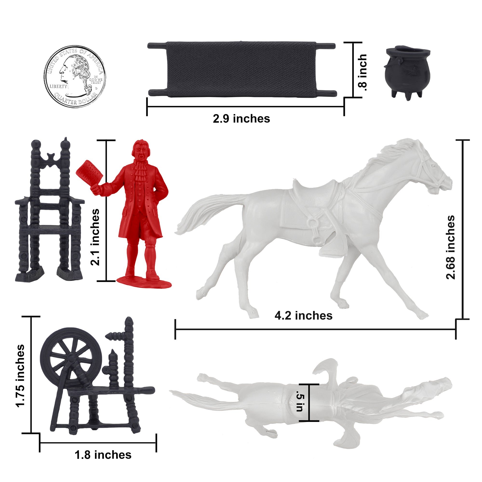 From the Classic Army Men Collector Series, BMC Toys brings the American Revolution to life. This 21 piece Set includes a Rider and horse, 5 Colonial Loyalist Civilians, 2 lanterns, and a variety of furniture and accessories. Figures stand up to 2.2 inches tall and are made from flexible LDPE Red color plastic with very little flashing and lots of detail. The riding horse is made from Polypropylene Soft-White color plastic with just a little flashing. Accessories are made from slightly stiff Coal-Black color HDPE plastic. Pieces include chair. rocker, 3 stools, 2 benches, table, 2 lanterns, spinning wheel, musket stack, cast iron kettle, and horse hitching post. This Set includes what are often referred to as 'Colonial Characters' and 'Revolutionary War Accessory Group' They were first offered in the 1950s by Louis Marx and Co. and were included in a number of their legendary Playsets spanning many years including several Revolutionary War theme Sets. This new production is manufactured using the original plastic injection tools. Perfect for a historical diorama, as a stand alone miniature Set, or a welcome addition to any 1:32 scale American War for Independence Playset. This is a Set of real American Made toys, meant to be set up, knocked over, picked up, and played with for many years to come. An original story about the 'real' history of this famous 'The Midnight Ride of Paul Revere' is included on the back of the package insert. Packed in clear bag with insert card and recommended for ages 5 and up.
