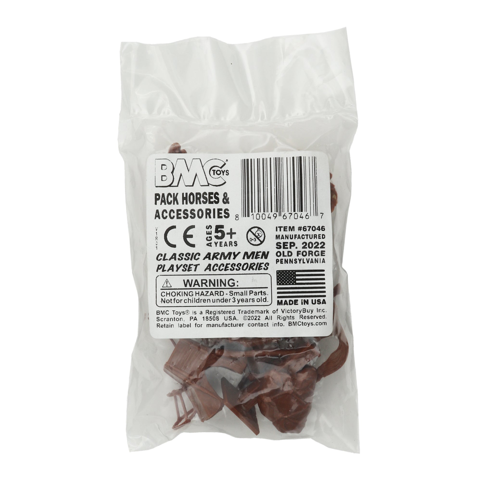 From the Classic Army Men Collector Series, BMC Toys brings back more classic accessories from yesteryear. This 5 piece Set includes 2 horses with some old-timey accessories. Each horse is identical and includes removable bridle leads and packs. The other accessories are a water pump, water trough, and butter churn. Pieces are made from slightly stiff brown color HDPE plastic and are approximately 1:32 scale. These horses were first offered around 1962 by Louis Marx and Co. and were included in a number of their legendary Playsets spanning many years including some Fort Apache boxed Sets. This new production is manufactured using the original plastic injection tools. Perfect to add to Playsets, dioramas and suitable for 18th century and Old West through early and mid-20th century time periods and beyond. This is a Set of real American Made toys, meant to be set up, knocked over, picked up, and played with for many years to come. Packed in clear bag bag with label and recommended for ages 5 and up.