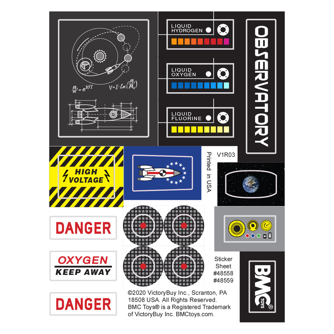 From the Classic Army Men Collector Series, BMC Toys brings back more classic toys from yesteryear. This 24 piece Set of includes a variety of space themed accessories and furniture. The following pieces are made from slightly stiff Stainless-Steel color HDPE plastic: Gravity Chamber, Observatory Dome with skylight, 3 chamber Fuel Tank, Radar Antenna, Supply Cabinet, Speaker Tower, Laser on Stand, Searchlight on base, Camera on stand, Telescope on stand, and Disc Antenna. These pieces are made from slightly stiff red HDPE plastic: Teacher Desk, Chair, Easel, Ladder, 2 Student Desks, 4 Student Benches, Control Chair, and Control Console. These accessories were first offered in the 1950s by Louis Marx and Co. and were included in a number of their legendary Playsets spanning many years including Tom Corbett Space Academy, Space Patrol, Rex Mars, Captain Space, Cape Canaveral, Operation Moonbase, Martian Landing and even the 1979 Galaxy Command Playset during the Star Wars craze. This new production is manufactured using the original plastic injection tools. This is a Set of real American Made plastic toys, meant to be set up, knocked over, picked up, and played with for many years to come. Packed in clear bag bag with insert card and recommended for ages 5 and up.
