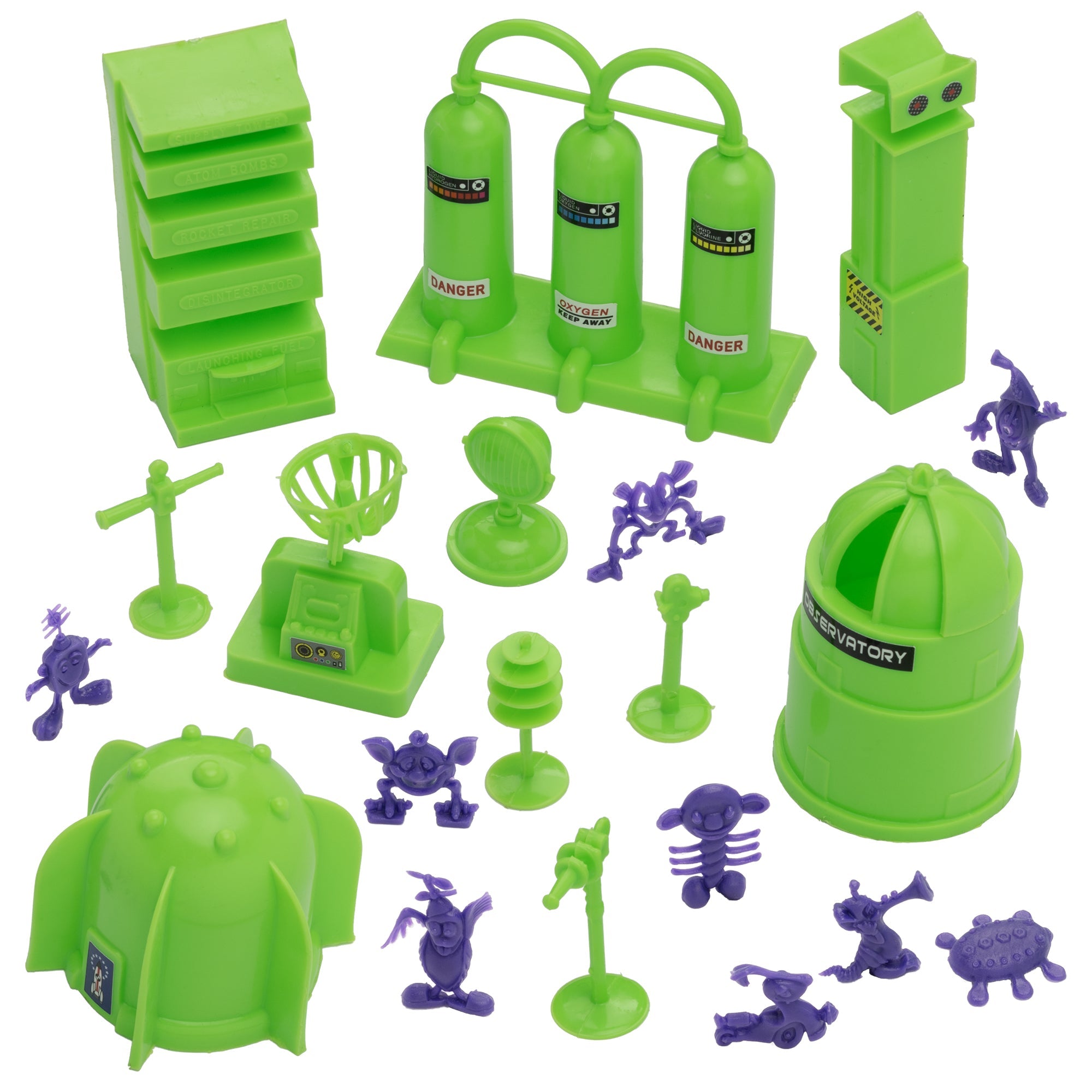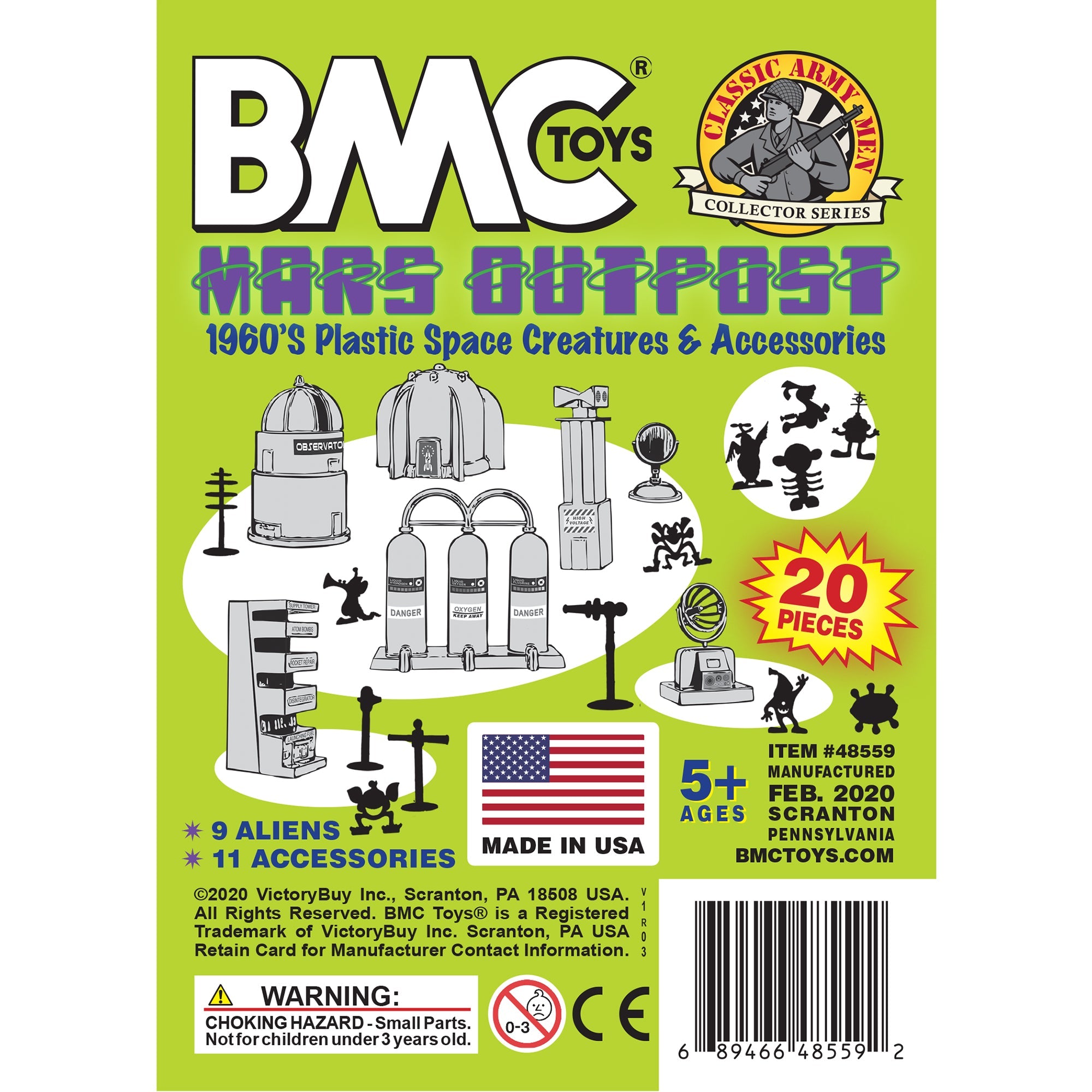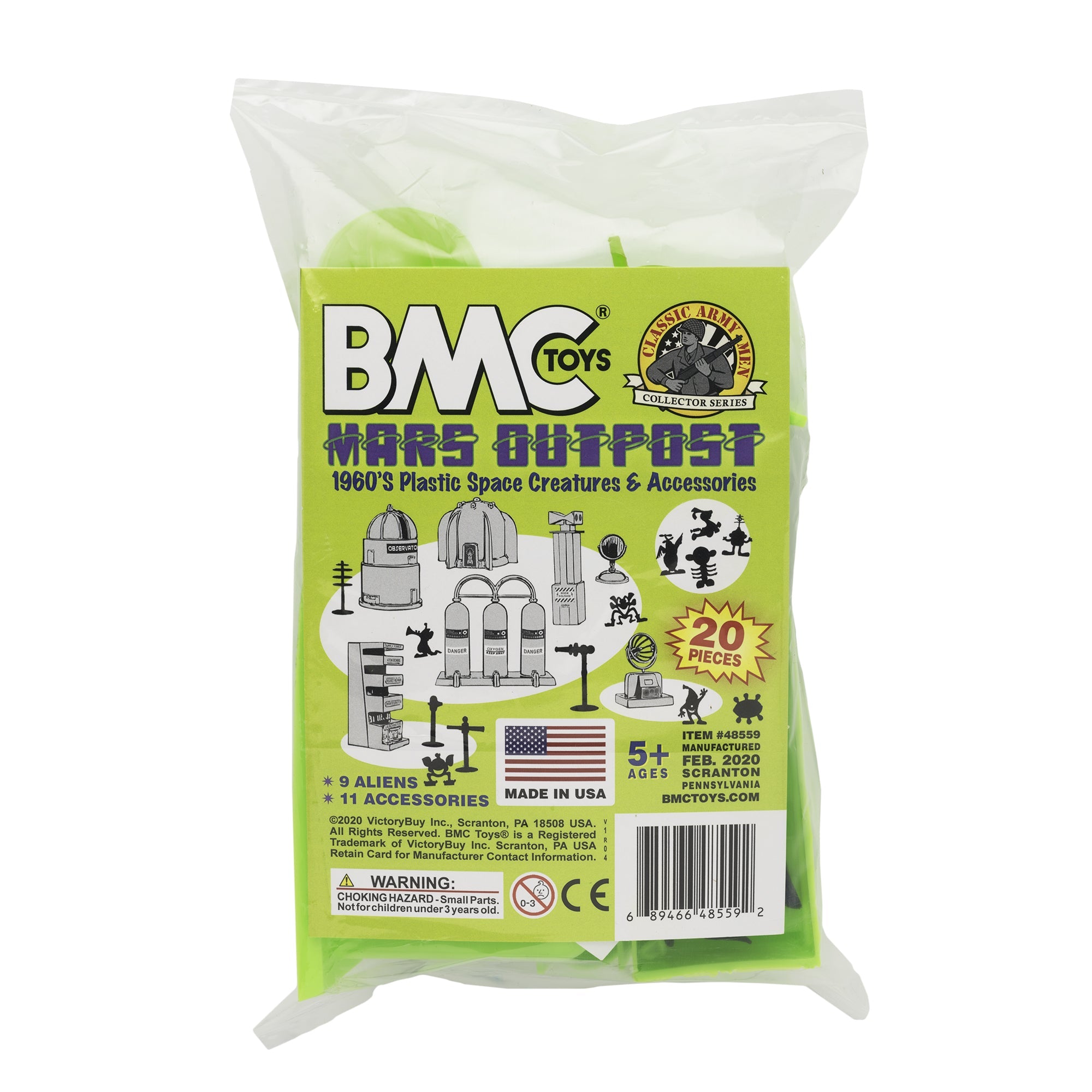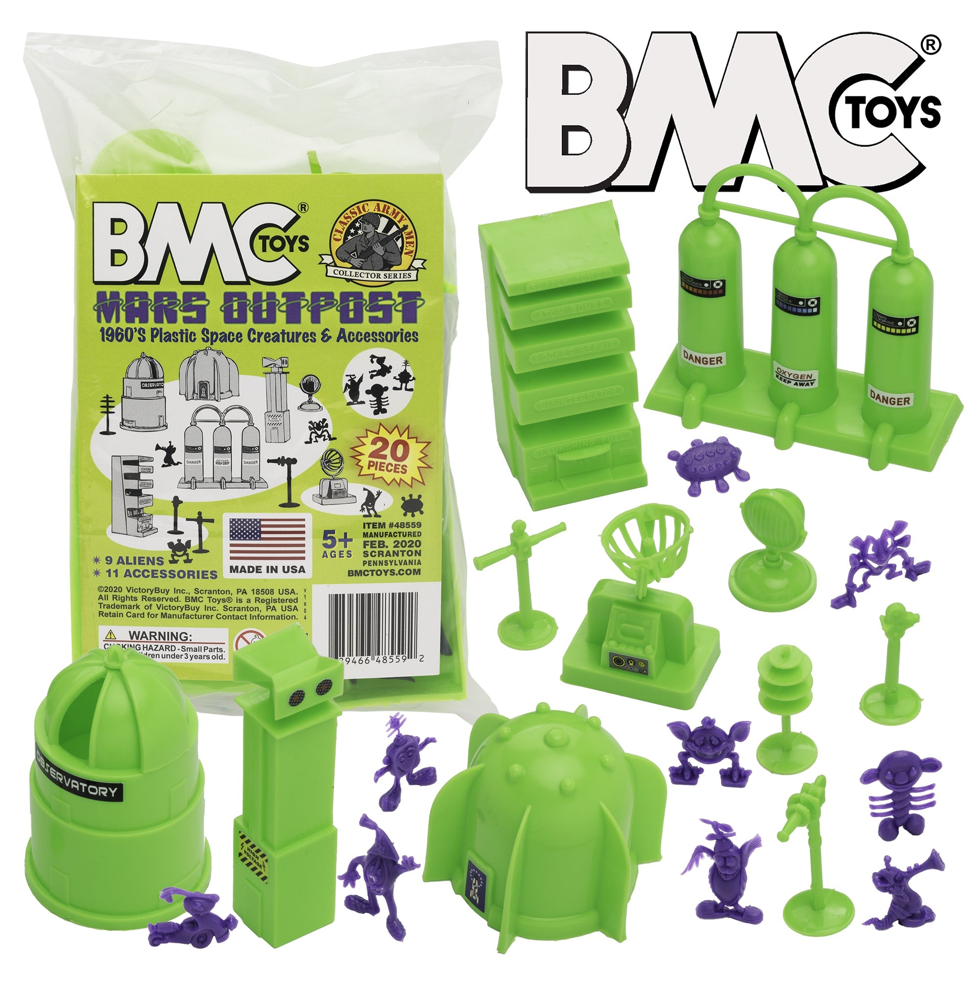 From the Classic Army Men Collector Series, BMC Toys brings back more classic toys from yesteryear. This 20 piece Set of includes a variety of space themed accessories and space aliens. The aliens are made from purple color flexible LDPE plastic and stand up to 1.5 inches tall with some flashing. Most will stand on their own but in general they are tippy and some have hollow backs. The accessories are made from slightly stiff Lime-Green color HDPE plastic inc include the following pieces: Gravity Chamber, Observatory Dome with skylight, 3 chamber Fuel Tank, Radar Antenna, Supply Cabinet, Speaker Tower, Laser on Stand, Searchlight on base, Camera on stand, Telescope on stand, and Disc Antenna. The alien figures were named Astro-Nits and first produced in the late 1960s by R&L Company of Australia. They were offered as cereal premiums and Cracker Jacks prizes. The accessories were first offered in the 1950s by Louis Marx and Co. and were included in a number of their legendary Playsets spanning many years including Tom Corbett Space Academy, Space Patrol, Rex Mars, Captain Space, Cape Canaveral, Operation Moonbase, Martian Landing and even the 1979 Galaxy Command Playset during the Star Wars craze. This new production is manufactured using the original plastic injection tools. This is a Set of real American Made plastic toys, meant to be set up, knocked over, picked up, and played with for many years to come. Packed in clear bag bag with insert card and recommended for ages 5 and up.