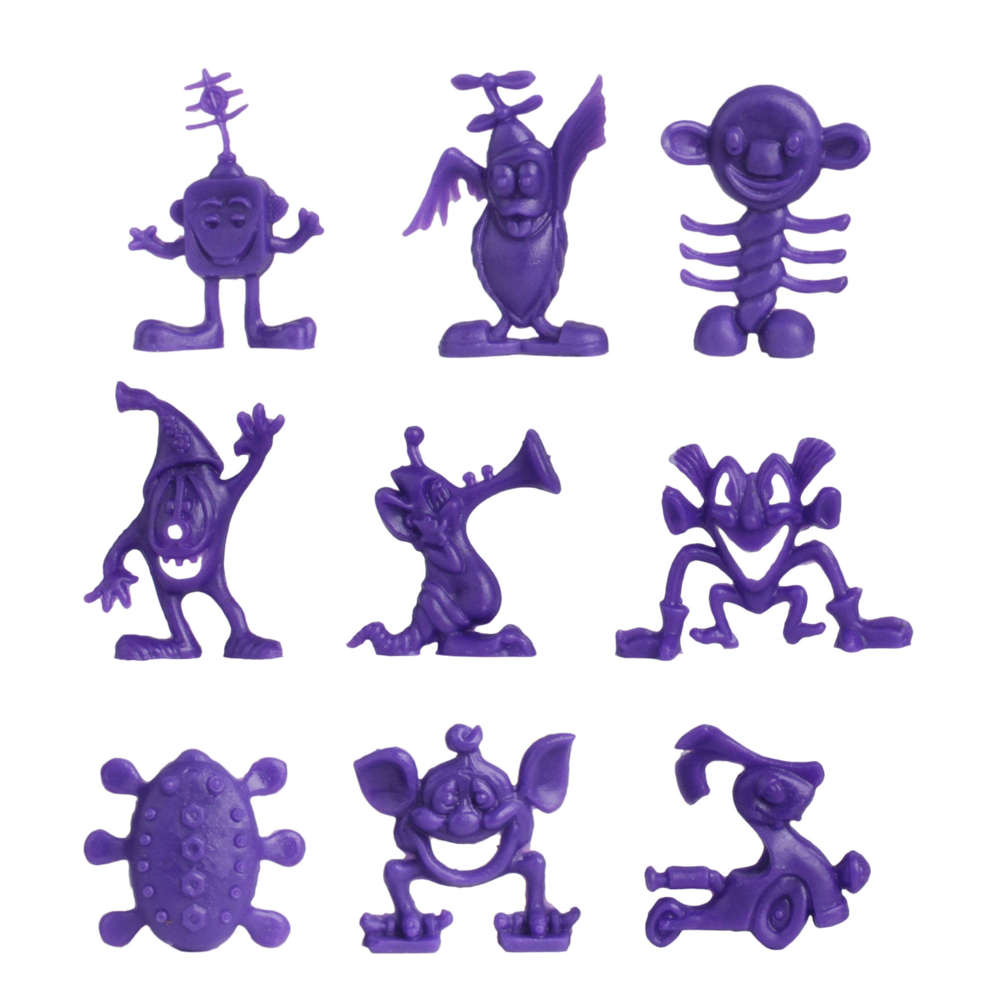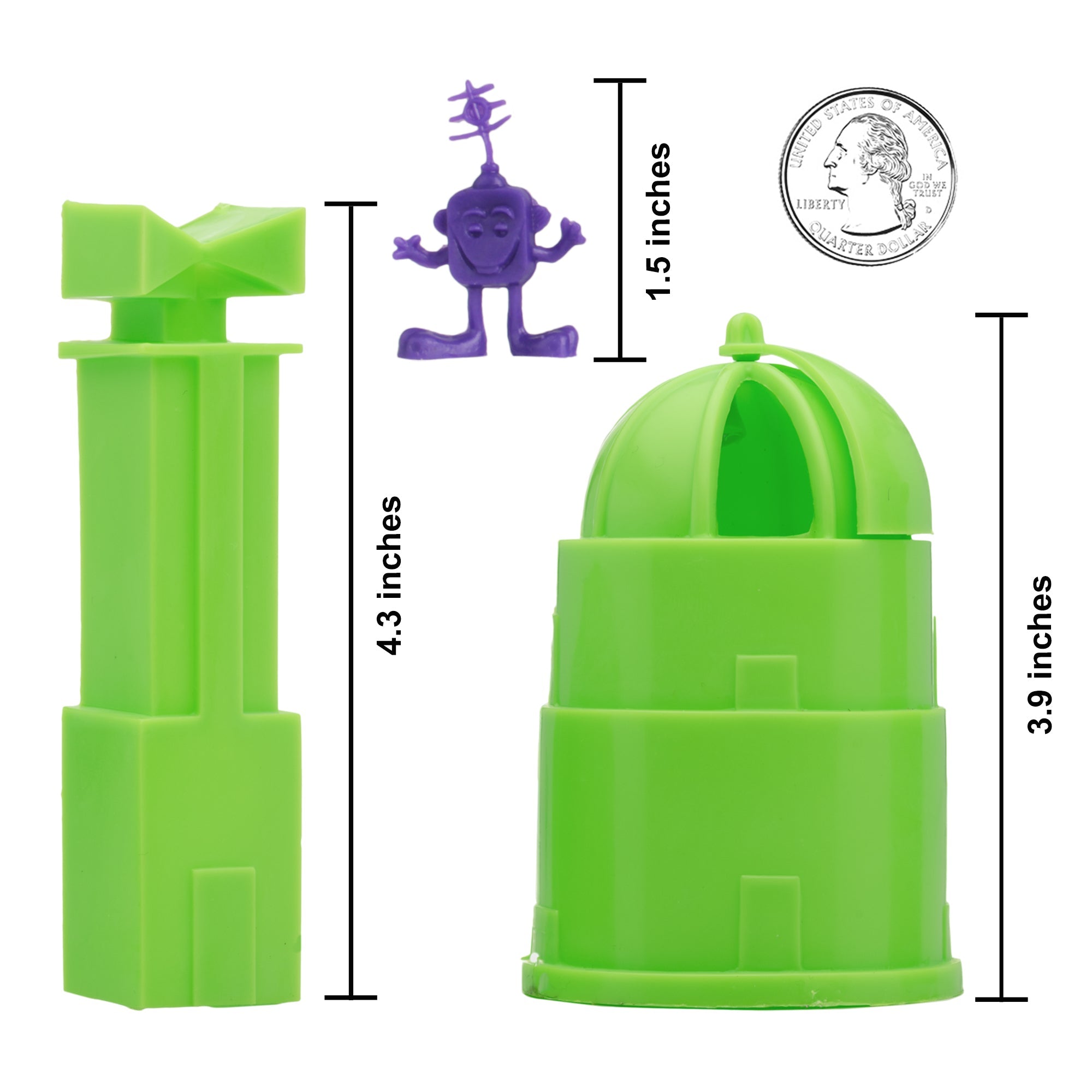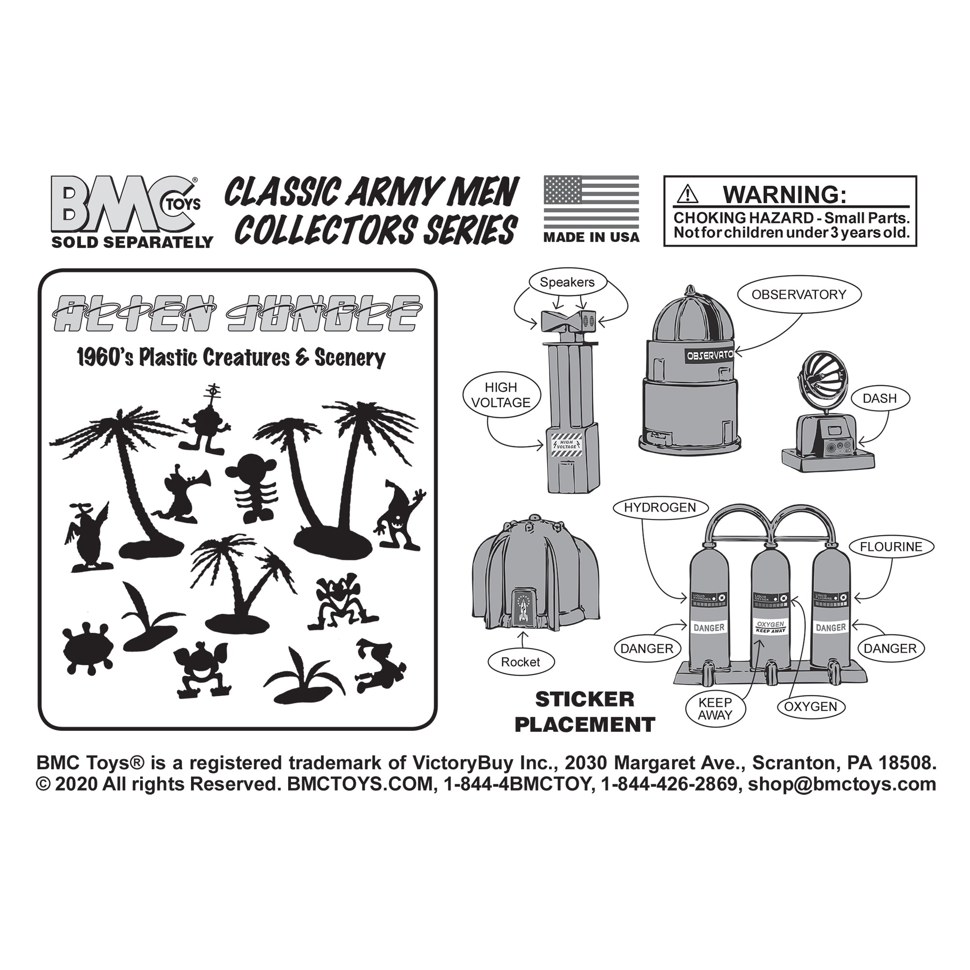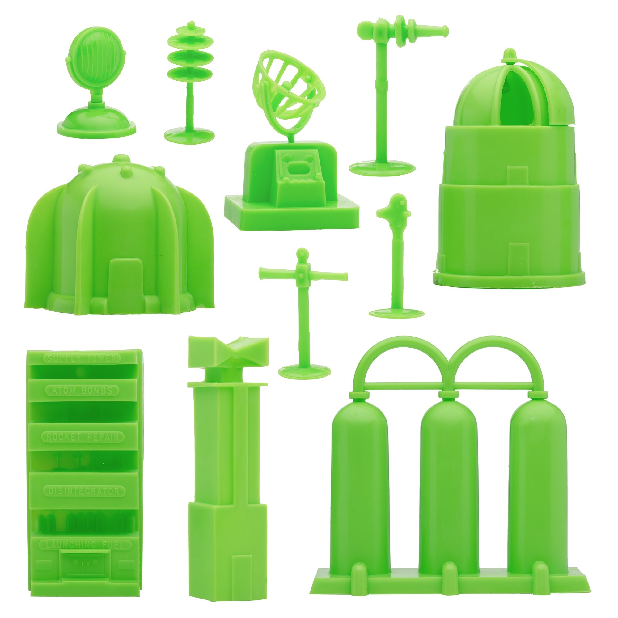 From the Classic Army Men Collector Series, BMC Toys brings back more classic toys from yesteryear. This 20 piece Set of includes a variety of space themed accessories and space aliens. The aliens are made from purple color flexible LDPE plastic and stand up to 1.5 inches tall with some flashing. Most will stand on their own but in general they are tippy and some have hollow backs. The accessories are made from slightly stiff Lime-Green color HDPE plastic inc include the following pieces: Gravity Chamber, Observatory Dome with skylight, 3 chamber Fuel Tank, Radar Antenna, Supply Cabinet, Speaker Tower, Laser on Stand, Searchlight on base, Camera on stand, Telescope on stand, and Disc Antenna. The alien figures were named Astro-Nits and first produced in the late 1960s by R&L Company of Australia. They were offered as cereal premiums and Cracker Jacks prizes. The accessories were first offered in the 1950s by Louis Marx and Co. and were included in a number of their legendary Playsets spanning many years including Tom Corbett Space Academy, Space Patrol, Rex Mars, Captain Space, Cape Canaveral, Operation Moonbase, Martian Landing and even the 1979 Galaxy Command Playset during the Star Wars craze. This new production is manufactured using the original plastic injection tools. This is a Set of real American Made plastic toys, meant to be set up, knocked over, picked up, and played with for many years to come. Packed in clear bag bag with insert card and recommended for ages 5 and up.