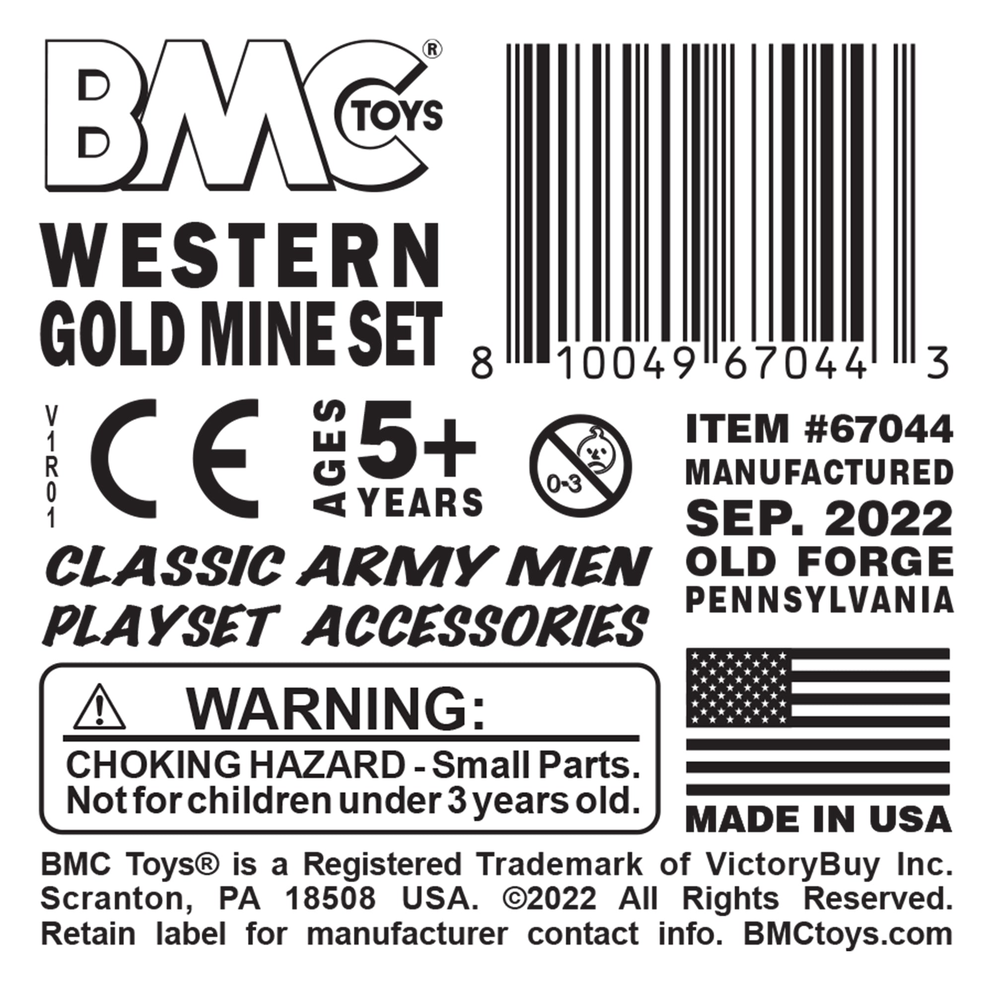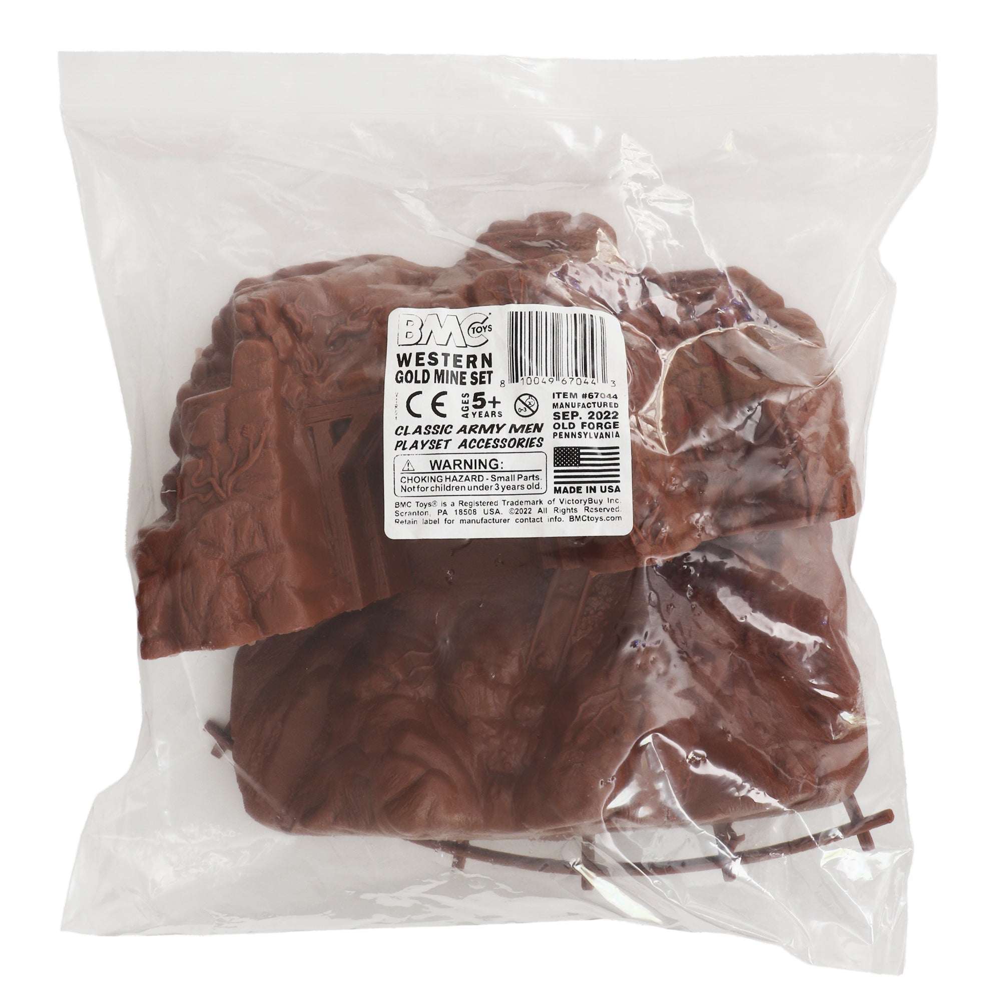 From the Classic Army Men Collector Series, BMC Toys brings back more classic accessories from the Golden Age of boxed Playsets. The Western Gold Mine 6 piece Set includes mine entrance, ore cart, track section, sluice Terrain, tipper and sign. Pieces are made from slightly stiff brown color polypropylene plastic with medium detail and some flashing. The mine entrance measures 9.5 inches across x 4.9 inches tall x 3.25 inches deep and the sluice Terrain is 9 x 6 x 2.5 inches tall. All pieces are approximately 1:32 scale, but work well for several other scales. These accessories were first offered around 1960 by Louis Marx and Co. included in Gunsmoke and Johnny Ringo Playsets, They were later in the 1990s revival Gold Rush boxed Set. This new production is manufactured using the original plastic injection tools. Perfect for many eras from 1800s and Old West through early and mid-20th century time periods and beyond. This is a Set of real American Made toys, meant to be set up, knocked over, picked up, and played with for many years to come. Packed in clear bag bag with insert card and recommended for ages 5 and up.
