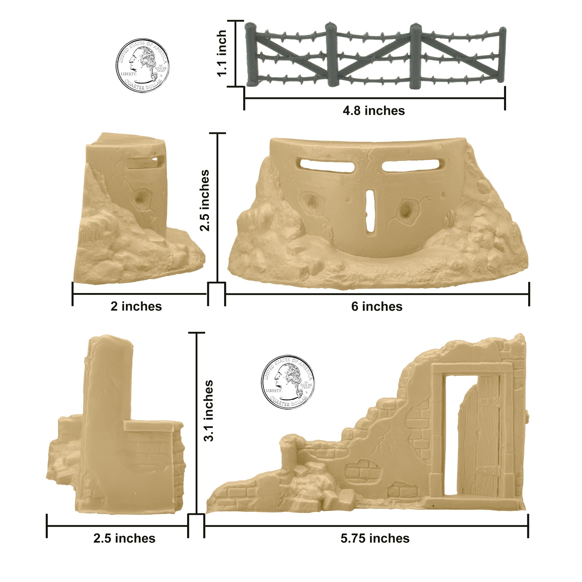 From the Classic Army Men Collector Series, BMC Toys brings back another American toy from yesteryear. This 14 piece of WW2 AXIS AMBUSH accessories includes 3 Pillbox Bunkers, 3 Ruined Building Corners, and 8 Barbed Wire Fence sections. All pieces are made from fairly flexible HDPE plastic and some pieces may have a little flashing. Pillboxes and buildings are tan color, and the barbwire fence sections are charcoal-gray. The fences measure 4.8 inches long by 1.1 inches tall and connect together to make over 3 feet of barricade. Please note the barbs are very pointy and should be handled with caution and kept away from children younger than 5 years of age. The pillboxes measure 6 x 2 x 2.5 inches tall and features 3 open loopholes for Battle hardened firing positions. The building corners measure 5.75 x 2.5 x 3.1 inches tall and features a fixed partial door that offers excellent cover for an ambush. These pieces were first produced in 1958 by Louis Marx and Co. for their legendary Battleground Military Playsets and were included in numerous Sets spanning many years. These are some of the most iconic Plastic Army Men accessories of all time, and this new production is manufactured using the original PL939 and PL-933C plastic injection tools. This is a Set of real American Made plastic toys, meant to be set up, knocked over, picked up, and played with for many years to come. Packed in clear bag bag with insert card and recommended for ages 5 and up.