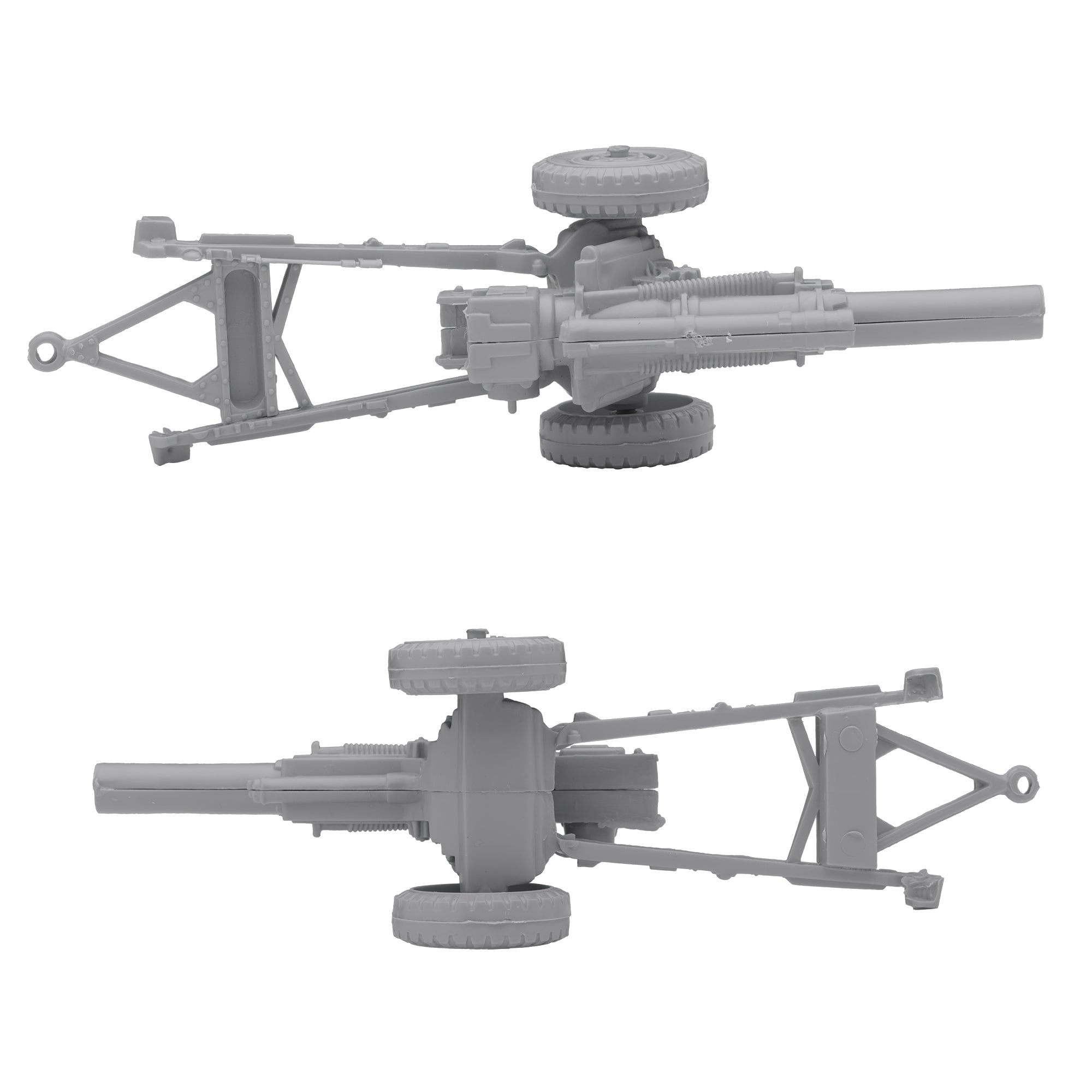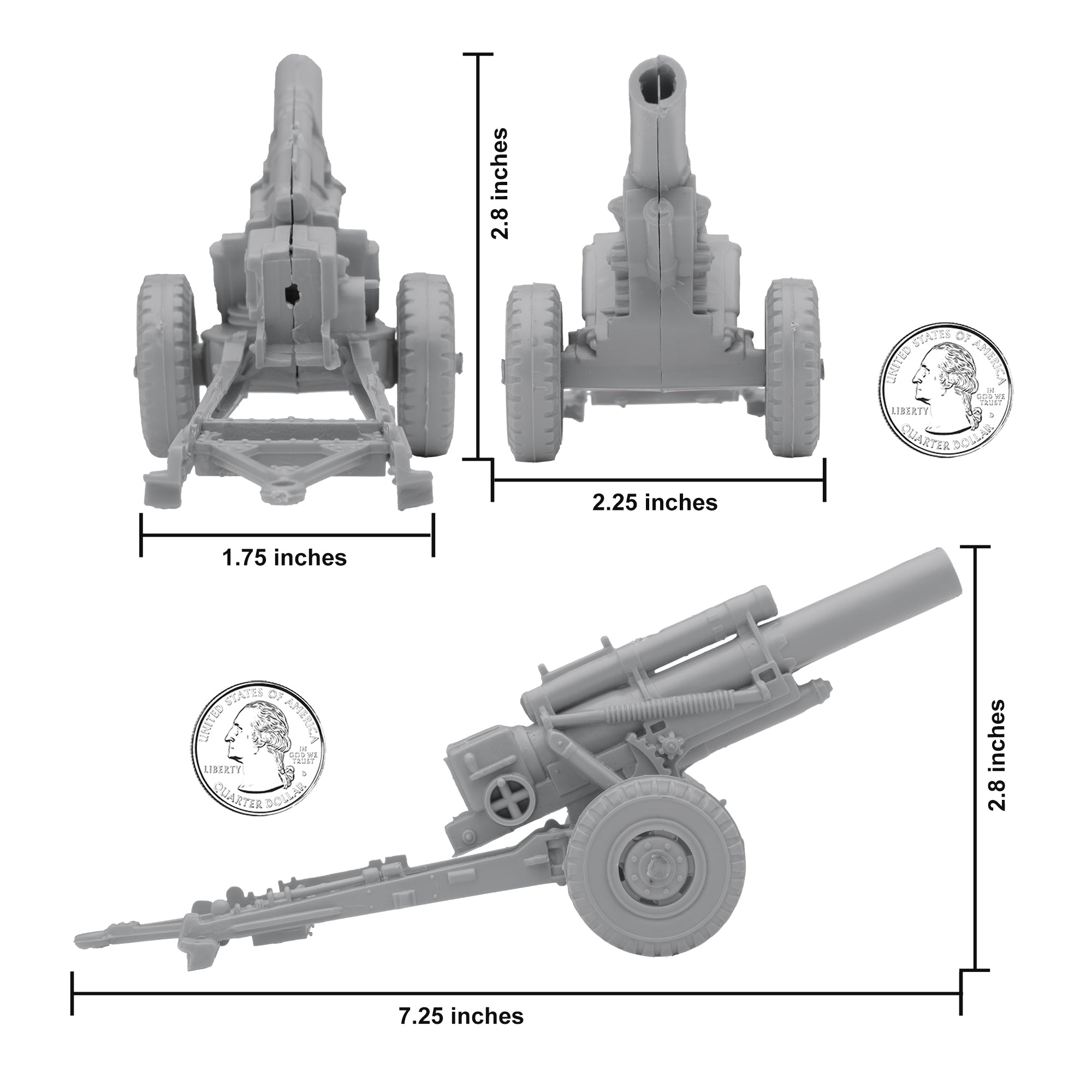 From the Classic Army Men Collector Series, BMC Toys brings back another toy from the Golden Age of Plastic Army men. This field Artillery Set includes 3 Long-barrel Howitzers. Each piece measures 7.25 x 2.25 x 2.8 inches tall and has a a lot of detail with a little bit of flashing. Made from Gray color stiff HIPS plastic and feature rolling wheels. These Plastic Army Men accessories were first produced in 1958 by Louis Marx and Co. for their legendary Battleground Military Playsets and were included in numerous Sets spanning many years. The original version was spring loaded and was changed to a non-firing version later on to comply with safety laws. The axle was also changed at some point from a single metal axle to integrated plastic axles. These are some of the most iconic Plastic Army Men accessories of all time, and this new production is manufactured using the original PL-934 plastic injection tool. This is a Set of real American Made plastic toys, meant to be set up, knocked over, picked up, and played with for many years to come. Packed in clear bag bag with insert card and recommended for ages 5 and up.