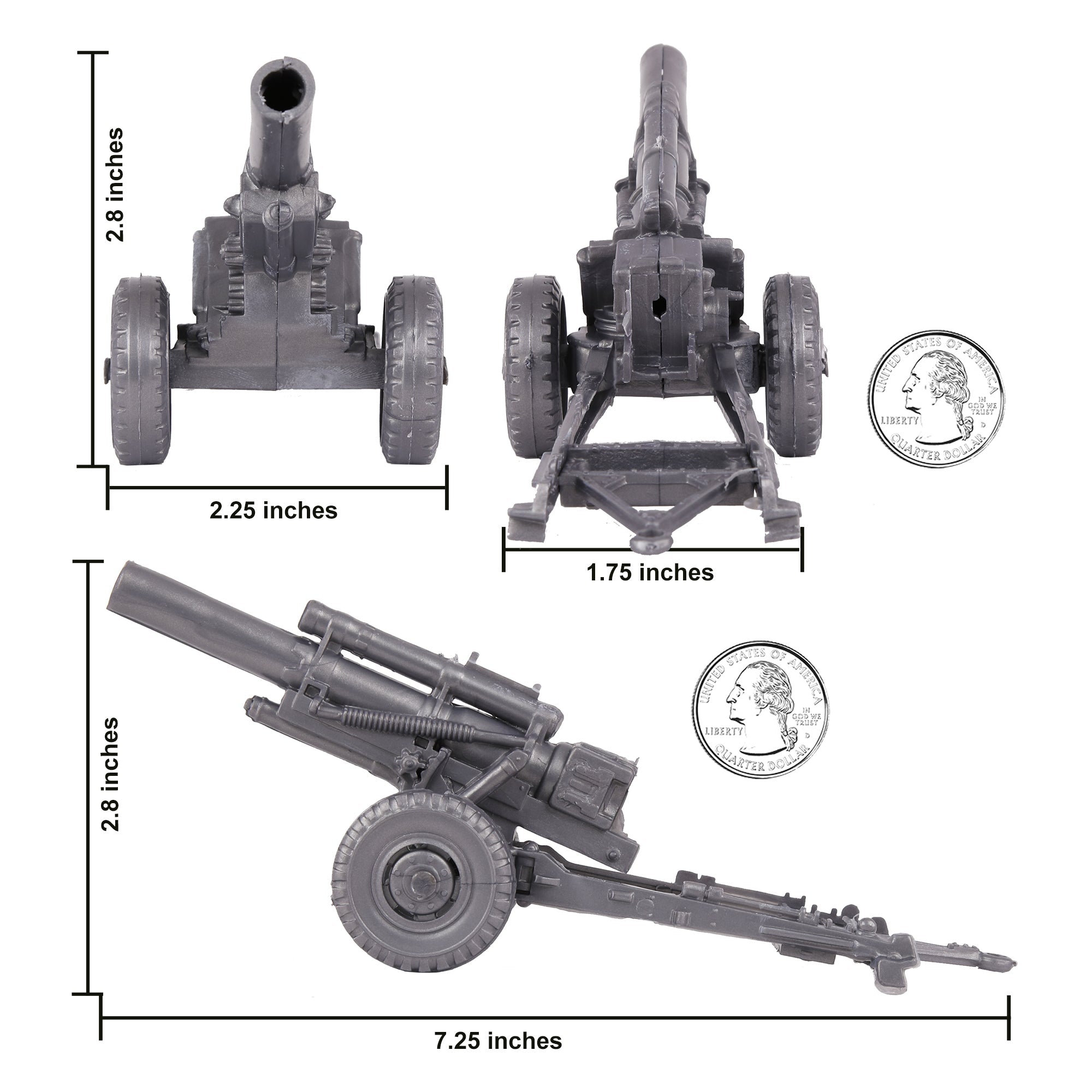 From the Classic Army Men Collector Series, BMC Toys brings back another toy from the Golden Age of Plastic Army men. This field Artillery Set includes 3 Long-barrel Howitzers. Each piece measures 7.25 x 2.25 x 2.8 inches tall and has a a lot of detail with a little bit of flashing. Made from Silver-Gray color stiff HIPS plastic and feature rolling wheels. These Plastic Army Men accessories were first produced in 1958 by Louis Marx and Co. for their legendary Battleground Military Playsets and were included in numerous Sets spanning many years. The original version was spring loaded and was changed to a non-firing version later on to comply with safety laws. The axle was also changed at some point from a single metal axle to integrated plastic axles. These are some of the most iconic Plastic Army Men accessories of all time, and this new production is manufactured using the original PL-934 plastic injection tool. This is a Set of real American Made plastic toys, meant to be set up, knocked over, picked up, and played with for many years to come. Packed in clear bag bag with insert card and recommended for ages 5 and up.
