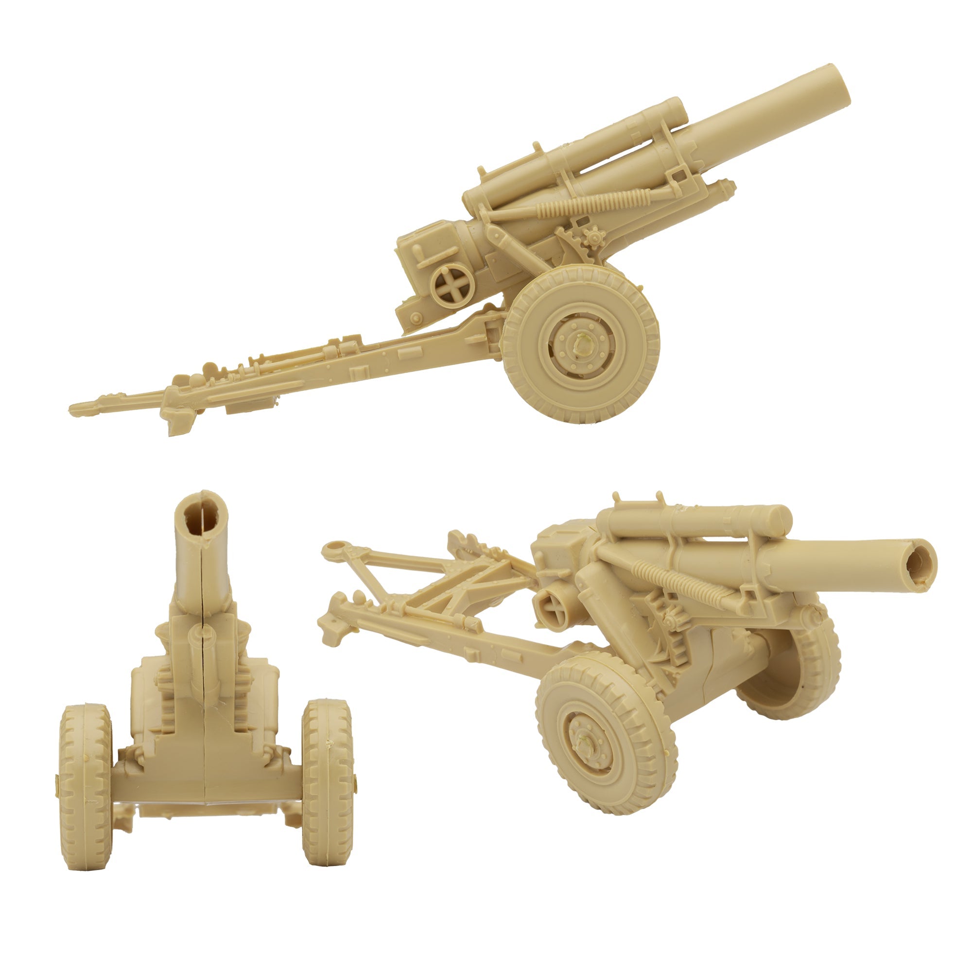 From the Classic Army Men Collector Series, BMC Toys brings back another toy from the Golden Age of Plastic Army men. This field Artillery Set includes 3 Long-barrel Howitzers. Each piece measures 7.25 x 2.25 x 2.8 inches tall and has a a lot of detail with a little bit of flashing. Made from Tan color stiff HIPS plastic and feature rolling wheels. These Plastic Army Men accessories were first produced in 1958 by Louis Marx and Co. for their legendary Battleground Military Playsets and were included in numerous Sets spanning many years. The original version was spring loaded and was changed to a non-firing version later on to comply with safety laws. The axle was also changed at some point from a single metal axle to integrated plastic axles. These are some of the most iconic Plastic Army Men accessories of all time, and this new production is manufactured using the original PL-934 plastic injection tool. This is a Set of real American Made plastic toys, meant to be set up, knocked over, picked up, and played with for many years to come. Packed in clear bag bag with insert card and recommended for ages 5 and up.