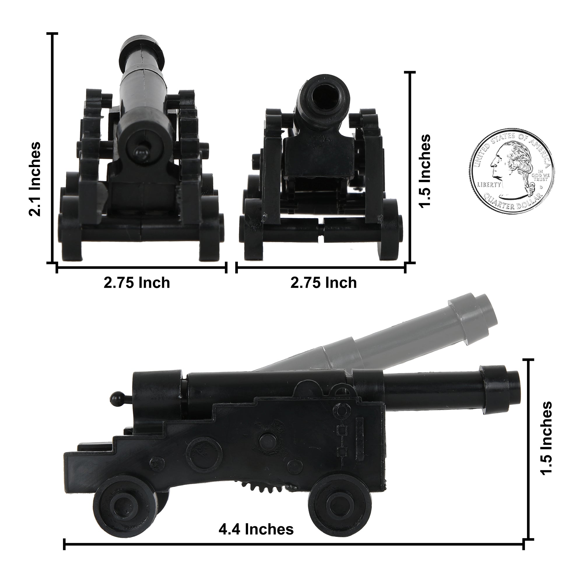 From the BMC Toys Classic Army Men Collector Series, the Naval Cannon 2 piece Set includes one black and one bronze color Artillery featuring elevating barrels. Each cannon measures 1.6 inch x 1.6 inch x 4.5 inches long. Made from slightly stiff polypropylene plastic and compatible with 1:32 as a Large cannon to 1:12 scale as a small 3lb cannon. These accessories were first offered around the 1960s by MPC (Multiple Products Corporation). This new production is manufactured using the original plastic injection tools. Perfect for a historical diorama, as a stand alone miniature Playset, or a welcome addition to any 1:40 scale American War for Independence collection. These accessories are a perfect addition for Playsets and school project dioramas of many eras and conflicts from the 17th to early 20th century including the American Revolutionary War, War of 1812, Napoleonic era Conflicts, Pirates, Battle of The Alamo, and Civil War. Packed in clear bag with insert card and recommended for ages 5 and up.
