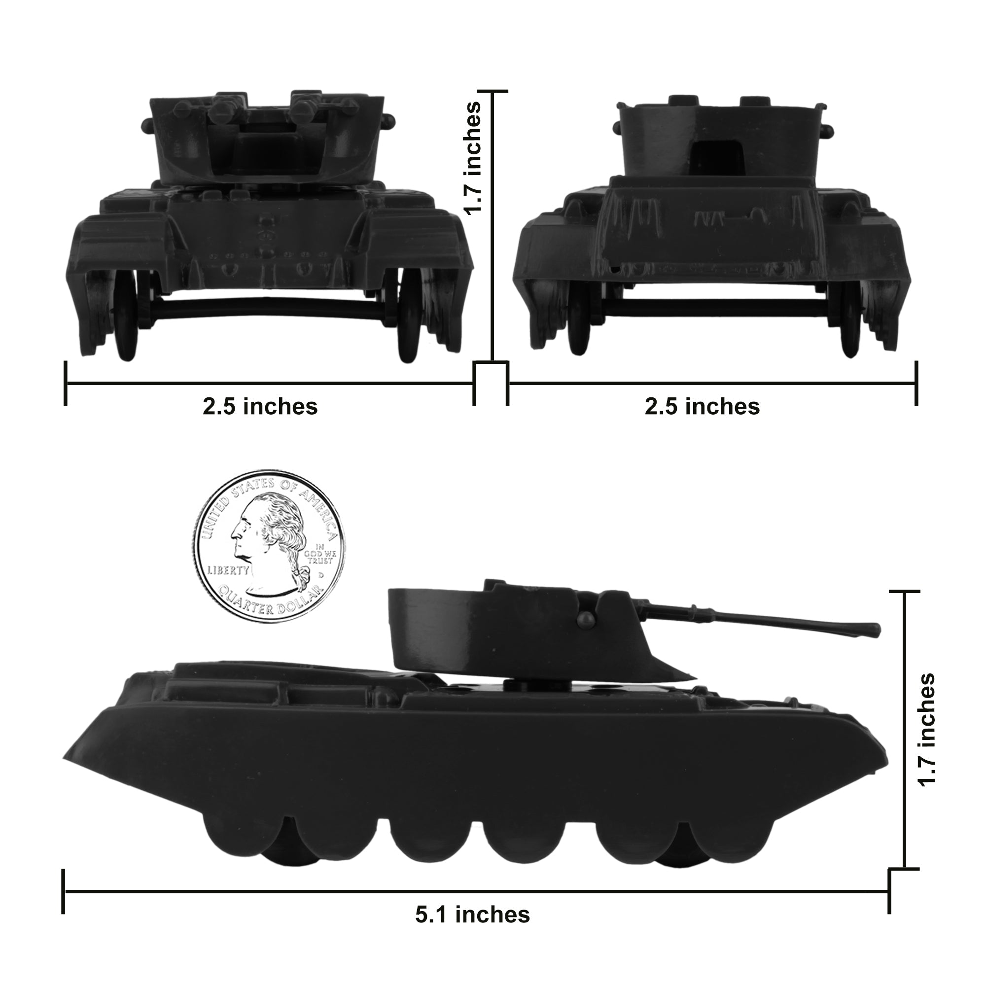 From the Classic Army Men Collector Series, BMC Toys brings back another American toy from yesteryear. This pack of 4 'Duster' Anti-Aircraft Tanks is proudly manufactublack in the United States. The Set includes 4 black vehicles and features barrells that pivot, turrets that rotate, and rolling wheels. Tanks are approximately 1:48 scale and are made from slightly flexible HDPE plastic with medium detail and very little flashing. These Tanks were originally produced in the 1960s by PAYTON and were included in numerous plastic military Playsets from several companies over the years. They were even copied and produced overseas in the 1980s. Even in the 21st century they're still great reinforcements for your Plastic Army Men forces, and also just the right size for O-gauge train flatbed cars. This is a Set of real American Made plastic toys, meant to be rolled around, knocked over, picked up and played with for many years to come. Packed in clear bag bag with insert card and recommended for ages 5 and up.