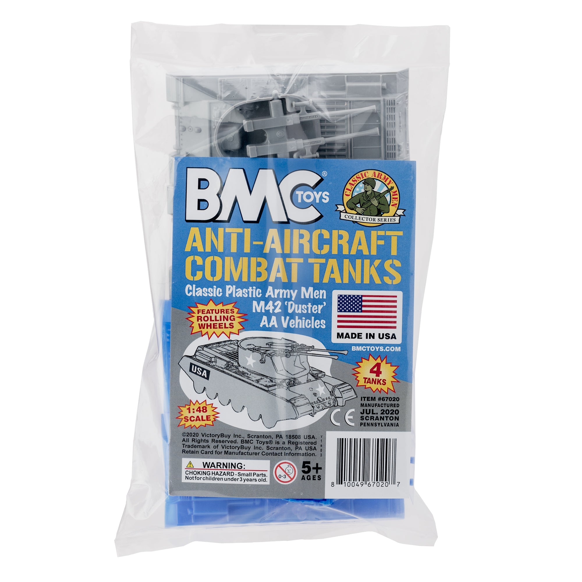 From the Classic Army Men Collector Series, BMC Toys brings back another American toy from yesteryear. This pack of 4 'Duster' Anti-Aircraft Tanks is proudly manufactured in the United States. The Set includes 2 blue and 2 gray vehicles and features barrells that pivot, turrets that rotate, and rolling wheels. Tanks are approximately 1:48 scale and are made from slightly flexible HDPE plastic with medium detail and very little flashing. These Tanks were originally produced in the 1960s by PAYTON and were included in numerous plastic military Playsets from several companies over the years. They were even copied and produced overseas in the 1980s. Even in the 21st century they're still great reinforcements for your Plastic Army Men forces, and also just the right size for O-gauge train flatbed cars. This is a Set of real American Made plastic toys, meant to be rolled around, knocked over, picked up and played with for many years to come. Packed in clear bag bag with insert card and recommended for ages 5 and up.