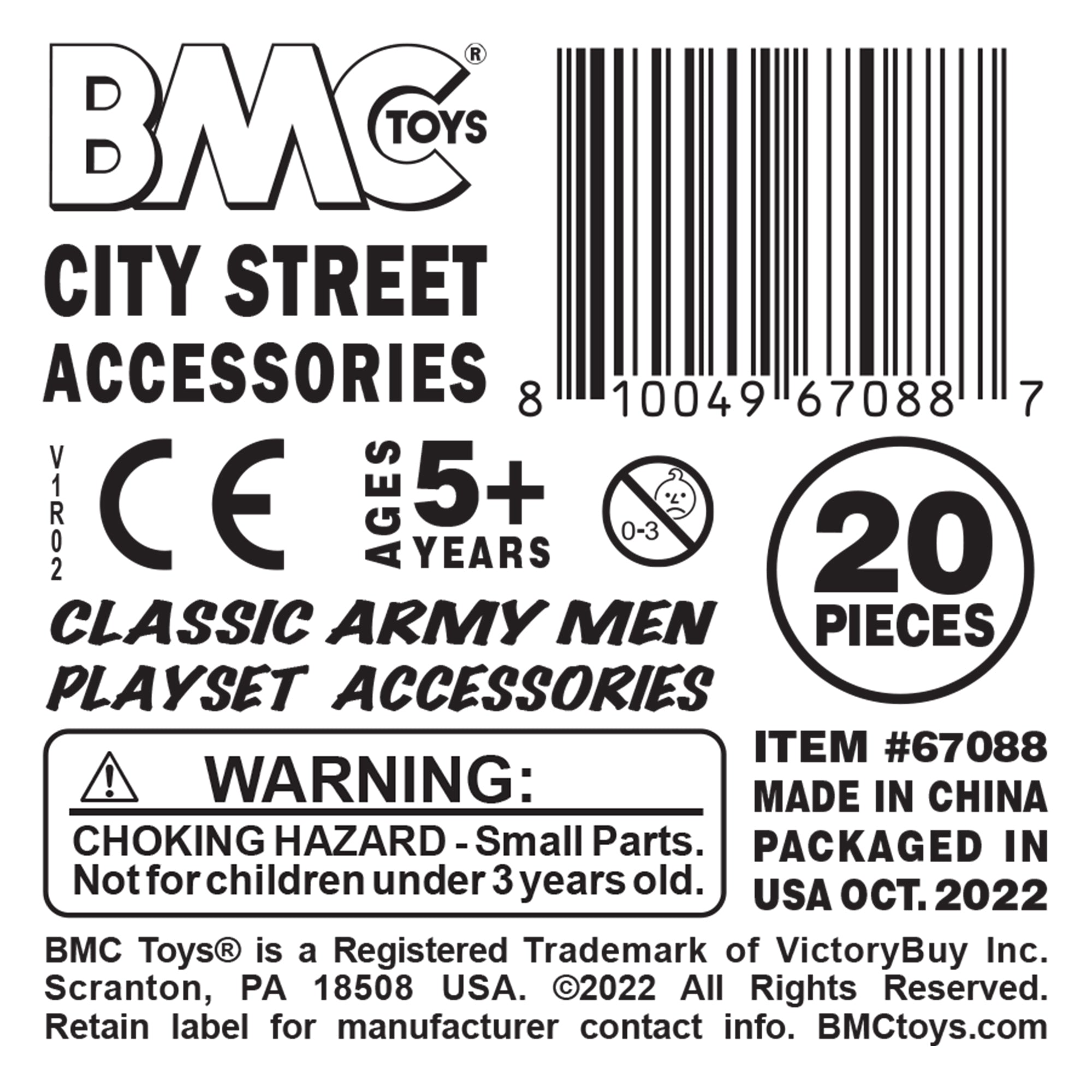 From the BMC Toys Classic Army Men Collector Series. This 20 piece Set includes accessories made from slightly stiff red color polypropylene plastic. Pieces include 4 each fire hydrants, Large crates, and traffic lights along with 8 trash piles. Traffic lights stand 3.5 inches tall and scales vary from approximately 1:18 to 1:48. The fire hydrants are approximately 1:18 scale (action figure size) while the traffic lights are approximately 1:48 scale which is closer to Army Men size. This Set includes parts that were originally imported from China by Processed Plastic Co. (Tim Mee Toy's parent company at the time) to be included in various Firemen Playsets. While best known for manufacturing toys in the United States, Processed Plastic Co. imported some parts in later years to keep costs down. Packed in clear bag bag with label and recommended for ages 5 and up.