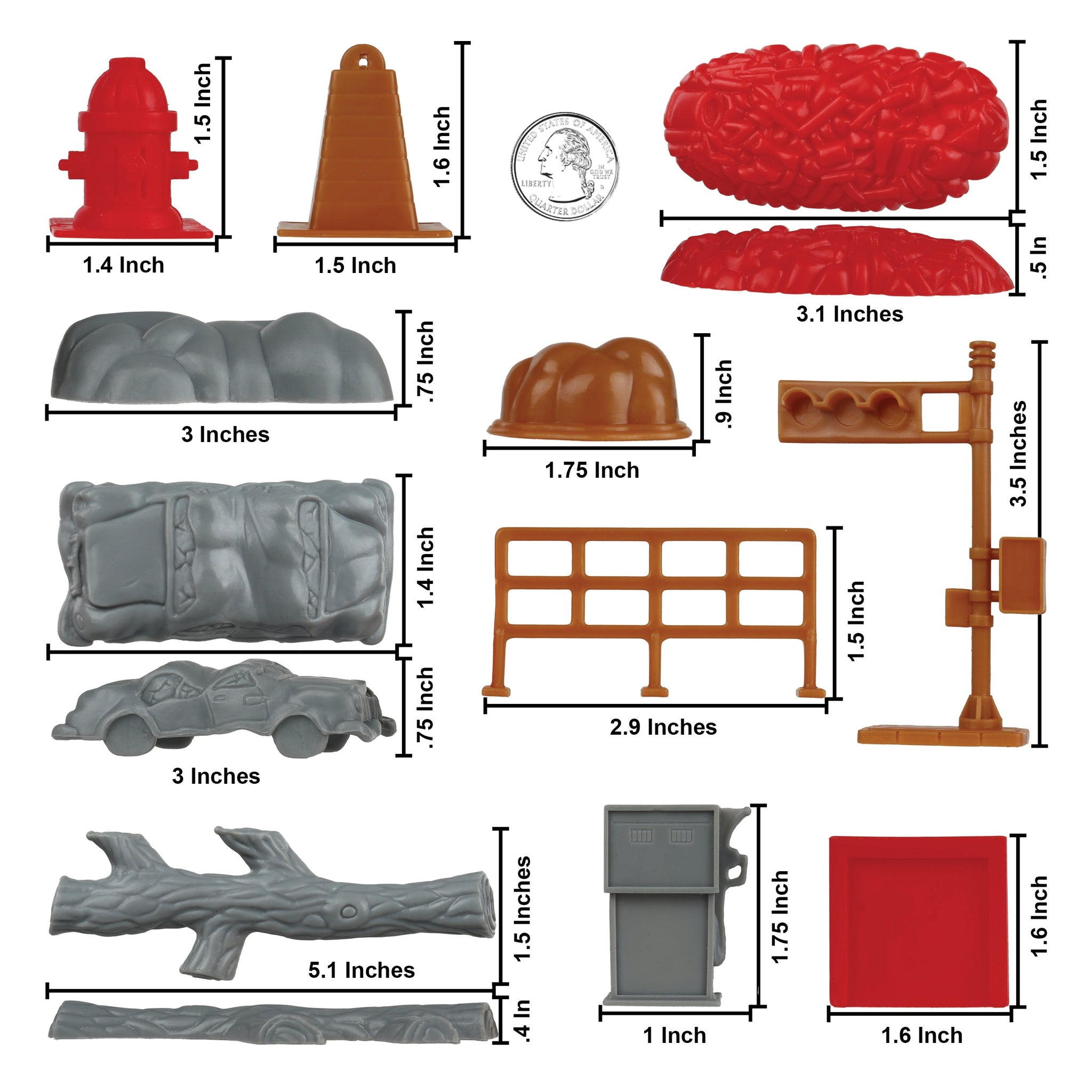 From the BMC Toys Classic Army Men Collector Series. This 30 piece Set includes accessories made from slightly stiff polypropylene plastic. Red color pieces include 2 each traffic lights, fire hydrants, Large crates and 4 trash piles. Gray color pieces includes 2 each gas pumps, crushed cars, logs and 4 rocks. Caramel tan color pieces include 2 each traffic lights, fence barriers, concrete barriers, and 4 small rocks. Traffic lights stand 3.5 inches tall and scales vary from approximately 1:18 to 1:48. This Set includes parts that were originally imported from China by Processed Plastic Co. (Tim Mee Toy's parent company) to be included in various Firemen, Construction, and 4x4 Monster Truck Playsets. While best known for manufacturing toys in the United States, Processed Plastic Co. imported some parts in later years to keep costs down. Packed in clear bag bag with label and recommended for ages 5 and up.