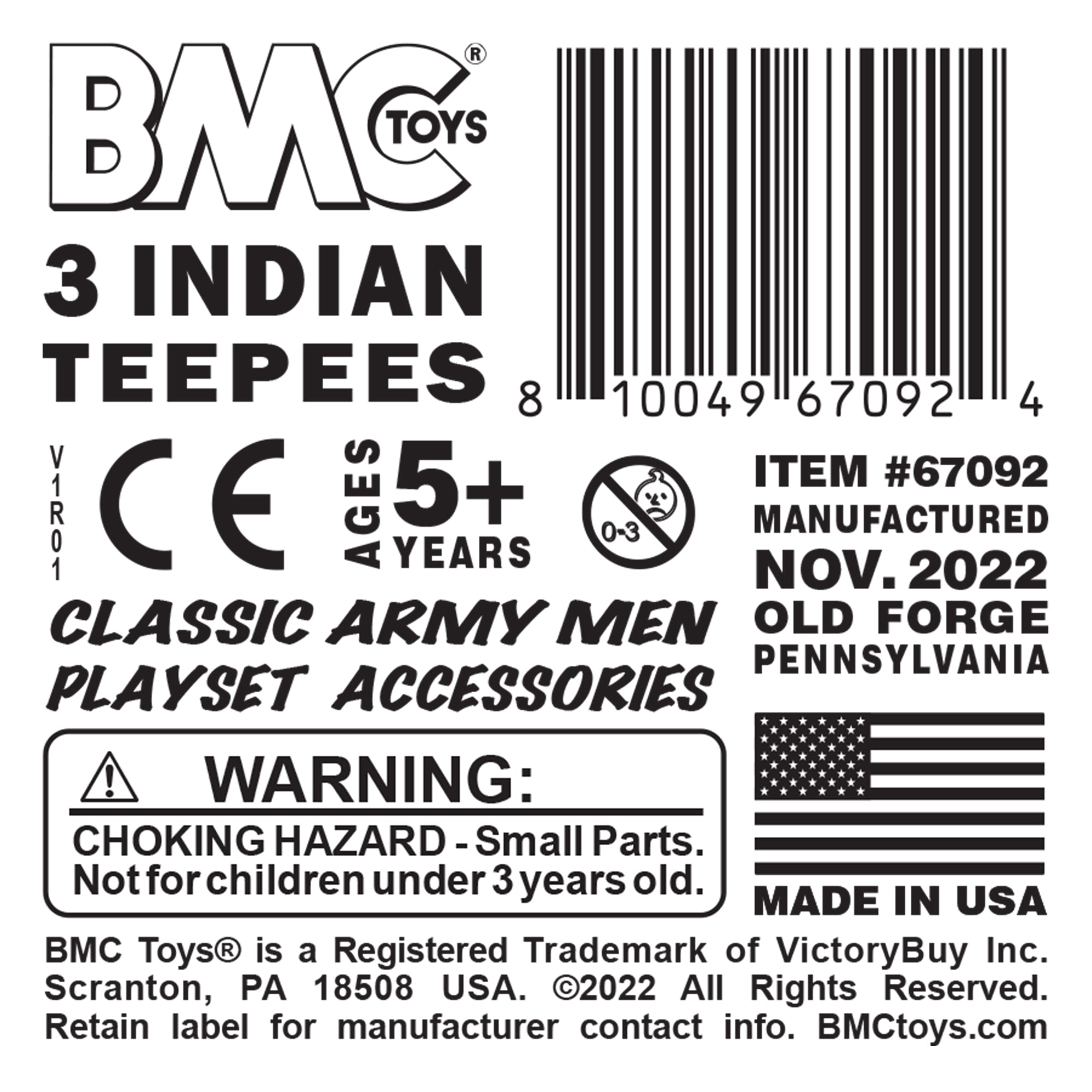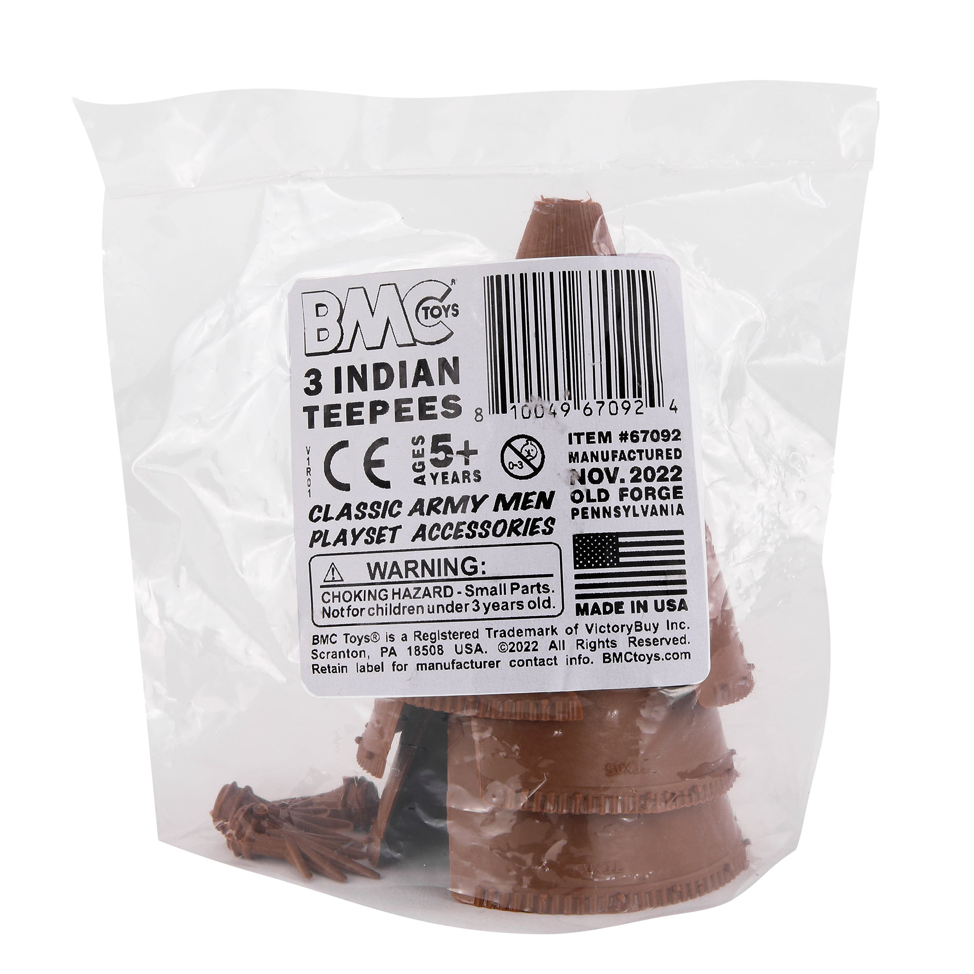 From the Classic Army Men Collector Series, BMC Toys is producing these Spaghetti Western accessories for the first time ever in the USA. This 3 piece Set includes 3 Native American Tipis. Each tepee has a 3 inch bottom diameter and stands 5 inches tall including the removable pole topper piece. The exteriors features a variety of designs including horse and rider, tomahawk, bow, steer skull, buffalo, diamond shapes, and an upside down 'TEXAS' in small print at the bottom. Pieces are made from slightly stiff brown color HDPE plastic, and are approximately 1:32 scale if used as a small teepee or 1:48 if used as a Larger dwelling. These particular western Playset accessories have never been offered in the US before. They were originally made in Italy for a brief time, then produced in South America for a longer stretch. Perfect to add western plains Playsets or dioramas. This is a Set of real American Made toys, meant to be set up, knocked over, picked up, and played with for many years to come. Packed in clear bag bag with label and recommended for ages 5 and up.