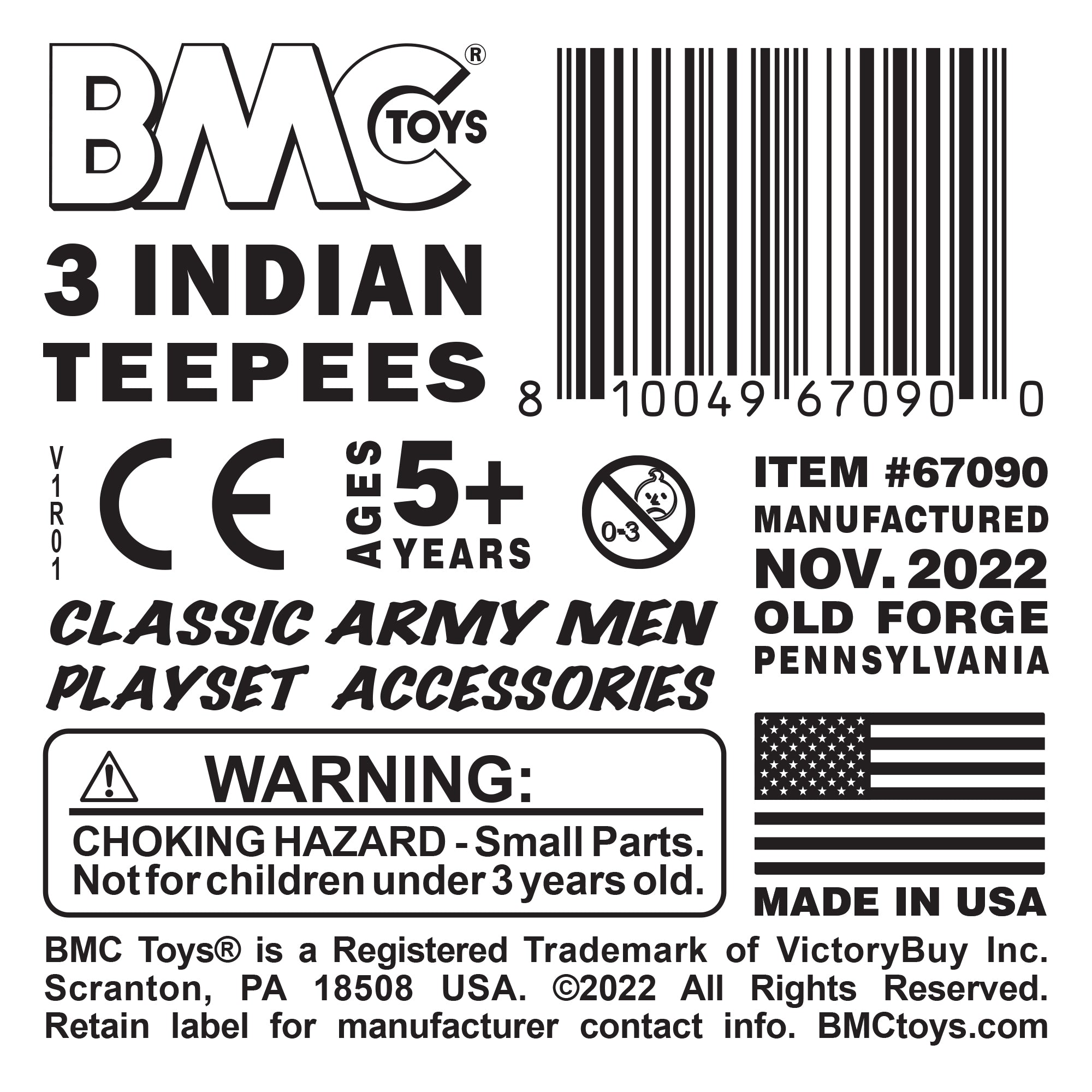 From the Classic Army Men Collector Series, BMC Toys is producing these Spaghetti Western accessories for the first time ever in the USA. This 3 piece Set includes 3 Native American Tipis. Each tepee has a 3 inch bottom diameter and stands 5 inches tall including the removable pole topper piece. The exteriors features a variety of designs including horse and rider, tomahawk, bow, steer skull, buffalo, diamond shapes, and an upside down 'TEXAS' in small print at the bottom. Pieces are made from slightly stiff tan color HDPE plastic, and are approximately 1:32 scale if used as a small teepee or 1:48 if used as a Larger dwelling. These particular western Playset accessories have never been offered in the US before. They were originally made in Italy for a brief time, then produced in South America for a longer stretch. Perfect to add western plains Playsets or dioramas. This is a Set of real American Made toys, meant to be set up, knocked over, picked up, and played with for many years to come. Packed in clear bag bag with label and recommended for ages 5 and up.