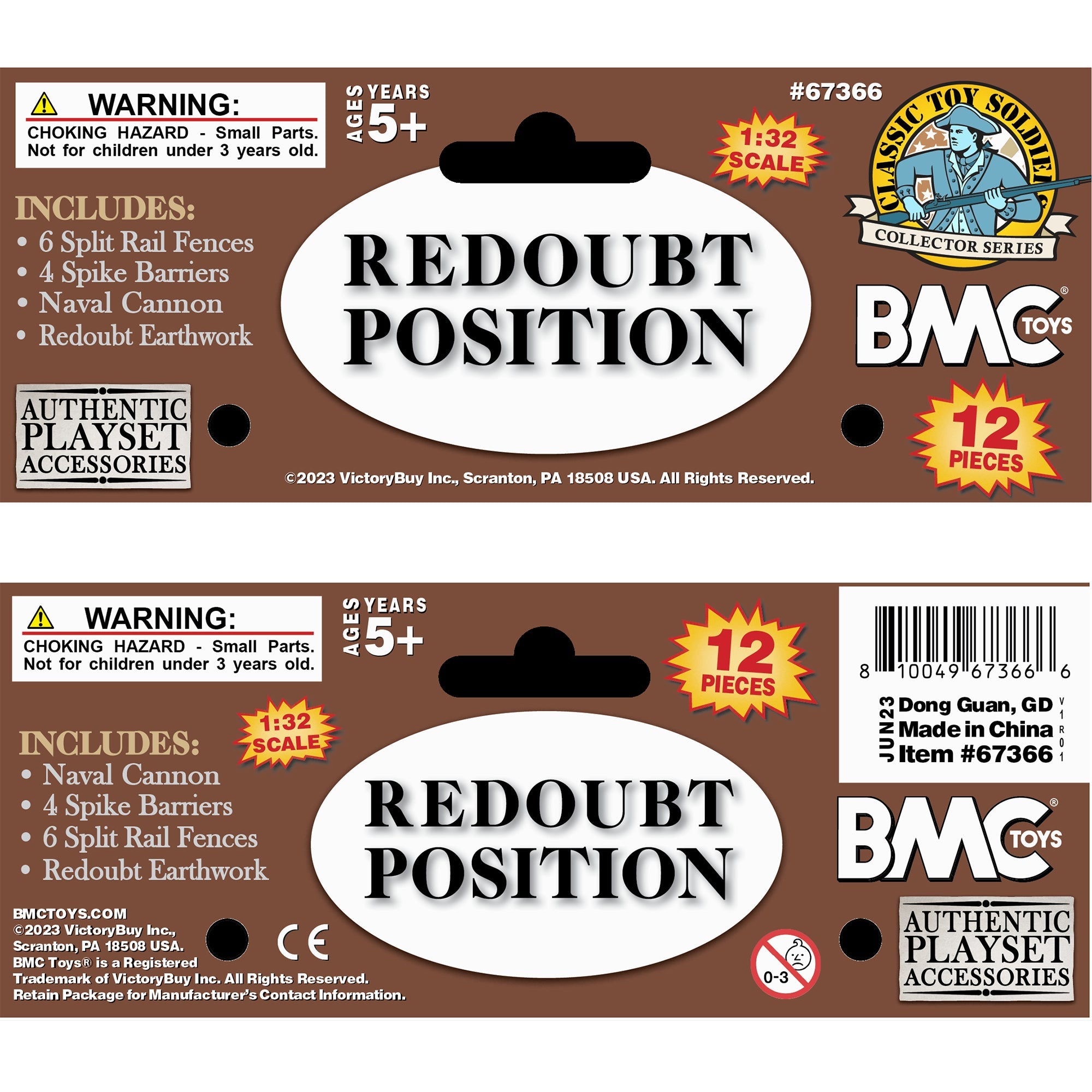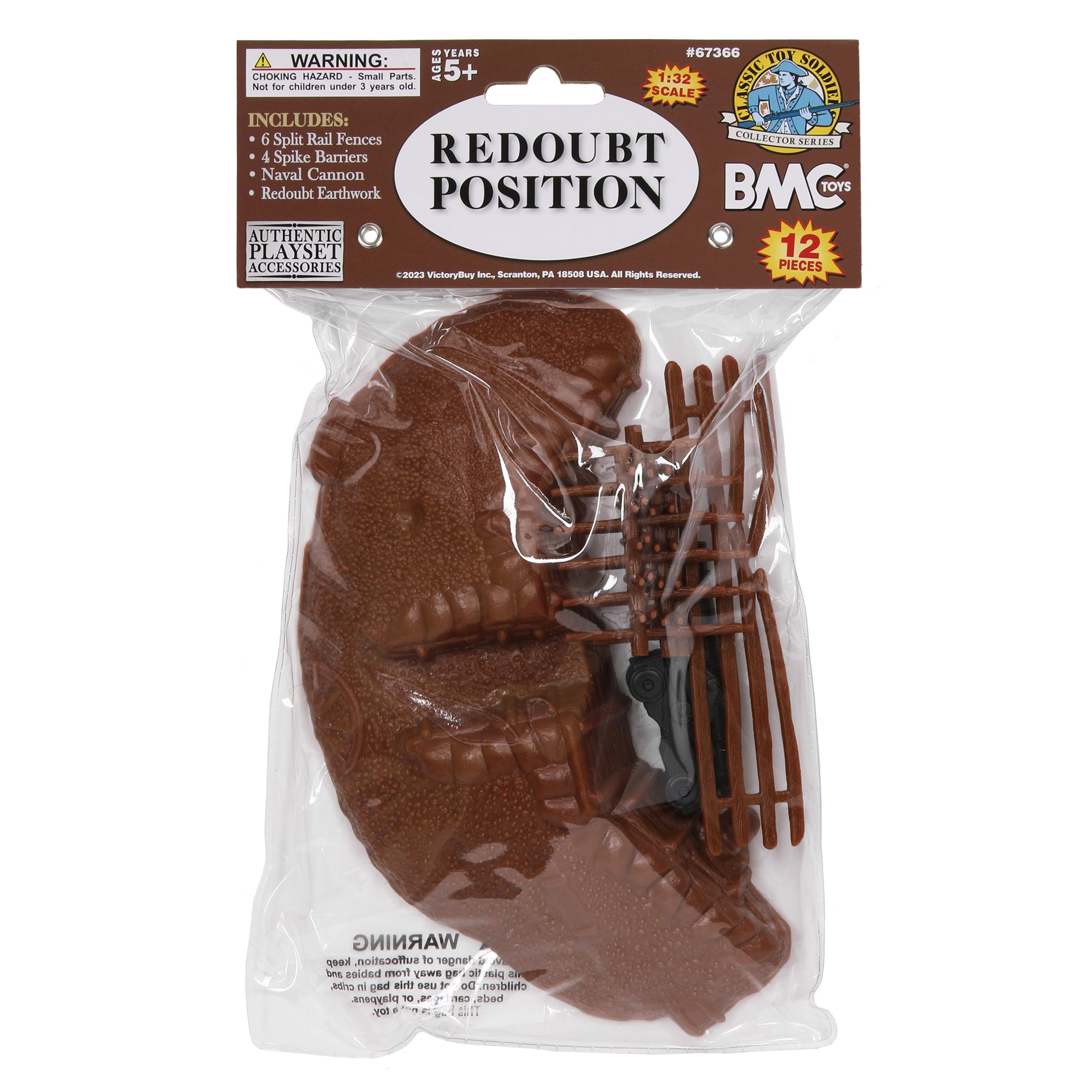 From the BMC Toys Classic Toy Soldier Collector Series, a fortified place for your defenders. The REDOUBT POSITION 12 piece Set includes a timber reinforced earthwork cannon emplacement , 6 brown rustic fence sections, 4 brown spike barricades and a small black naval Cannon. All parts are made from slightly stiff HDPE or stiff ABS with a medium amount of detail. The redoubt measures 9.25 x 5 x 1.85 inches tall, fence sections are 5.95 inches long, spikes are 2.45 long x 1.25 tall and wide, and the cannon is 3 inches long. The fences interlock in a zig-zag pattern and include 4 regular sections and 2 'damaged' looking sections. Parts are approximately 1:32 scale, but work with any 1:35 to 1:29 scale figures. These accessories were initially offered to hobby collectors by Classic Toy Soldiers Company. The pieces were inspired by those in several famous Playsets offered by Louis Marx and Company in the 1960s and 1970s. Classic Toy Soldiers Co. worked with BMC Toys to make them available to today's youngsters. BMC Toys was founded by Bill McMaster in 1991 and specializes in producing historically accurate Plastic Army Men figures and Playsets in the classic realistic classic realistic miniature style of the 1950s and 1960s. These accessories are a perfect addition for Playsets and school project dioramas of many eras and conflicts from the 17th to early 20th century including the American Revolutionary War, War of 1812, Napoleonic era Conflicts, and Civil War. Packaged in clear bag with header card and recommended for ages 5 and up.