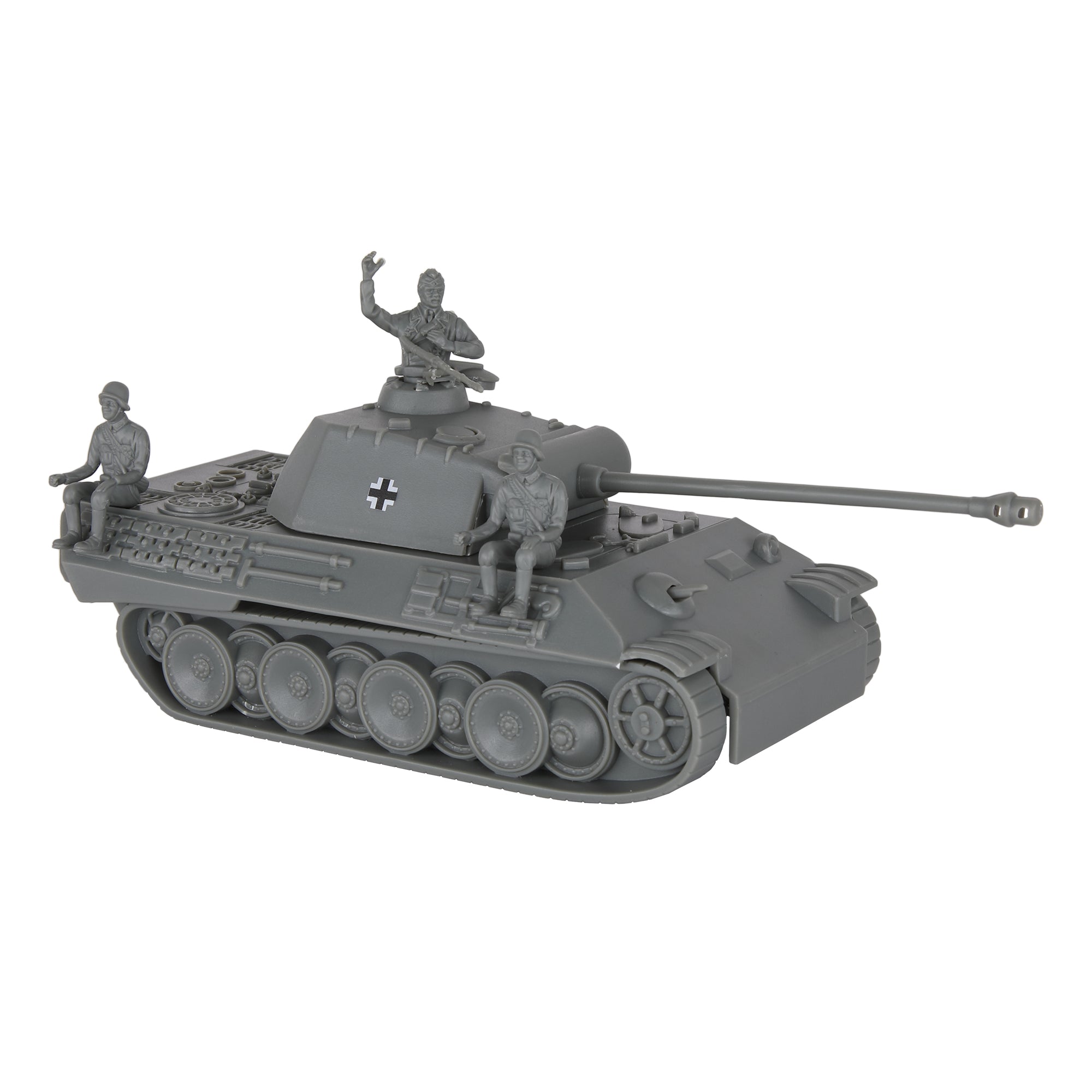 From the BMC Toys Classic Toy Soldier Collector Series, the most widely deployed Tank of the German Army. This WW2 PANTHER V Tank features lots of authentic detail 3 man crew. The turret rotates and has elevating barrel with printed bar cross insignia and LMG mounted on top. Tank is made from stiff charcoal-gray color ABS plastic, measures 3.45 inches wide x 3.1 inches tall x 7.1 inches long (9 including long barrel) and is approximately 1:38 scale. The Tank commander 'half' figure is removable so hatch can be closed. Figures and LMG are made from charcoal-gray soft plastic. This Tank is also known as Panzerkampfwagen V Panther, Pz.Kpfw. V, Mark V, and official designation is Sd.Kfz. 171. Approximately 6,000 were produced from 1943 to 1945. It was deployed on the Eastern and Western fronts of the the European theater. These Tanks were initially offered to hobby collectors by Classic Toy Soldiers Company around 2000. Classic Toy Soldiers Co. worked with BMC Toys to make them available to today's youngsters. BMC Toys was founded by Bill McMaster in 1991 and specializes in producing historically accurate Plastic Army Men figures and Playsets in the classic realistic classic realistic miniature style of the 1950s and 1960s. These vehicles are a perfect addition for WWII Playsets and school project dioramas. Packaged in plain white box with label and recommended for ages 5 and up.