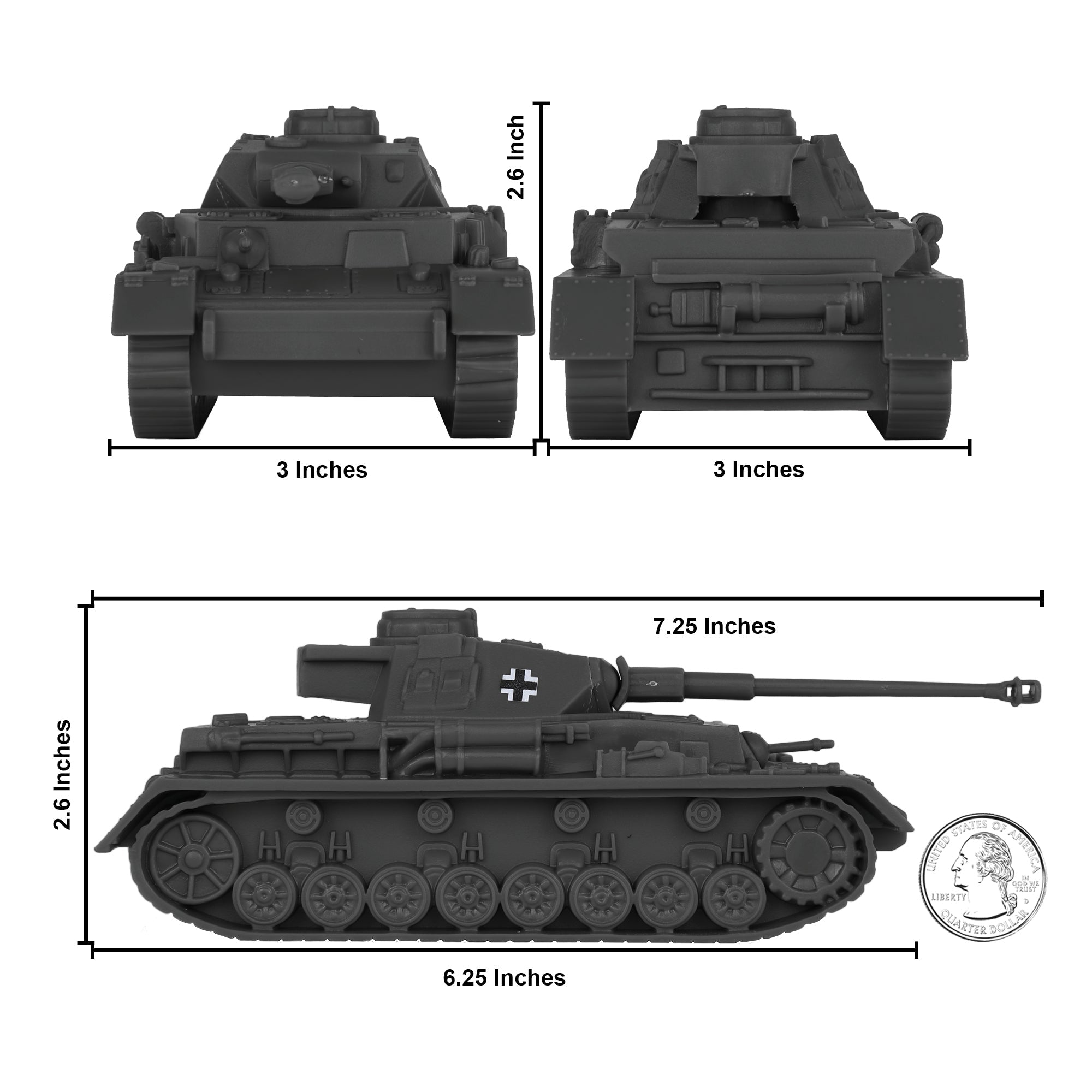 From the BMC Toys Classic Toy Soldier Collector Series, the most widely deployed Tank of the German Army. This WW2 Panzer IV Tank features lots of authentic detail and 2 different turrets. Each turret rotates, has elevating barrel, and printed bar cross insignia. The smaller turret represents the Panzer IV Ausf. A/B/C/D models with 75mm short barrel. The Larger turret is modeled after the Panzer IV Ausf.F2 with 75mm long barrel and features mounted LMG. Tank is made from stiff dark-gray color ABS plastic, measures 3 inches wide x 2.6 inches tall x 6.25 long (7.25 including long barrel) and is approximately 1:38 scale. This Tank is also known as Panzerkampfwagen IV, Pz.Kpfw. IV, and official designation is Sd.Kfz. 161. Approximately 8,500 were produced from 1936 to 1945. It was deployed in every combat theater involving Germany. These Tanks were initially offered to hobby collectors by Classic Toy Soldiers Company around 1998. Classic Toy Soldiers Co. worked with BMC Toys to make them available to today's youngsters. BMC Toys was founded by Bill McMaster in 1991 and specializes in producing historically accurate Plastic Army Men figures and Playsets in the classic realistic classic realistic miniature style of the 1950s and 1960s. These vehicles are a perfect addition for WW2 Playsets and school project dioramas. Packaged in plain white box with label and recommended for ages 5 and up.