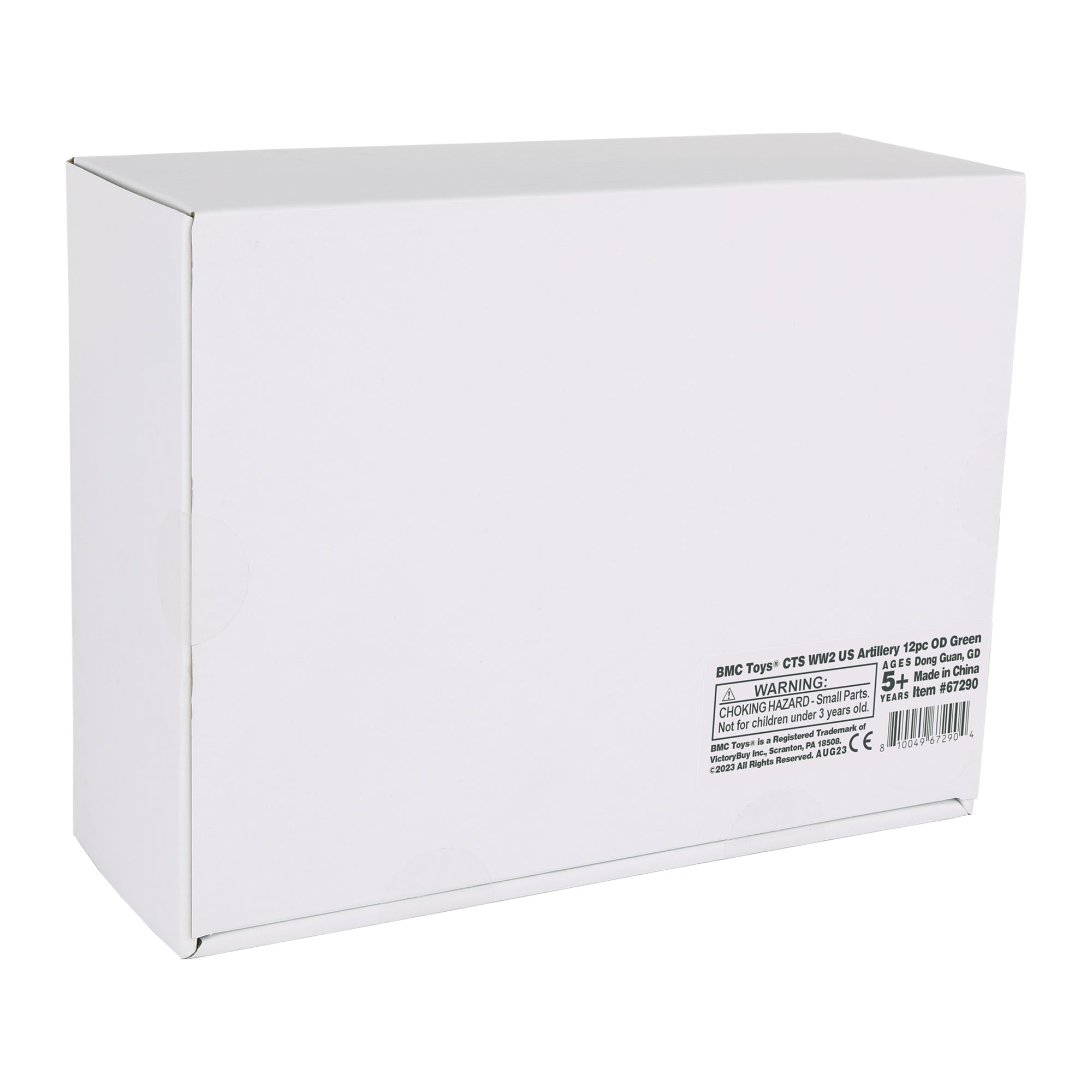 From the BMC Toys Classic Toy Soldier Collector Series, small field Artillery that packed a big punch. The WW2 US Artillery 12 piece Plastic Army Men Set features a long barrel howitzer, 2 short barrel howitzers, and 9 crew figures in 3 different poses. Both Artillery models have rolling wheels with metal axles, and the short barrel cannon feature barrels that elevate and movable trailing arms. Soldiers include 3 man Artillery crew. Figures are made from OD-Green color soft plastic with lots of detail and stand up to 2.4 inches tall. Artillery is made from OD-Green hard plastic and measure up to 2.8 inches tall and 7.5 inches long. All pieces are approximately 1:32 scale. The short barrel Howitzer was initially offered to hobby collectors by Classic Toy Soldiers Company around the late 1990s, and the Artillery crew figures around 2010. The long barrel Howitzer was originally made for hobby collectors by The Toy Soldier Company and modeled after the version that was included in many famous Louis Marx & Company Battleground Playsets from the 1950s and 1960s. Classic Toy Soldiers Co. and Toy Soldiers Co. worked with BMC Toys to make these figures and accessories available to today's youngsters. BMC Toys was founded by Bill McMaster in 1991 and specializes in producing historically accurate Plastic Army Men figures, accessories, and Playsets in the classic realistic classic realistic miniature style of the 1950s and 1960s. These figures and accessories are the perfect addition to any WWII, Korean War, and Cold War era Playset or school project diorama. Packaged in plain white box with label and recommended for ages 5 and up.