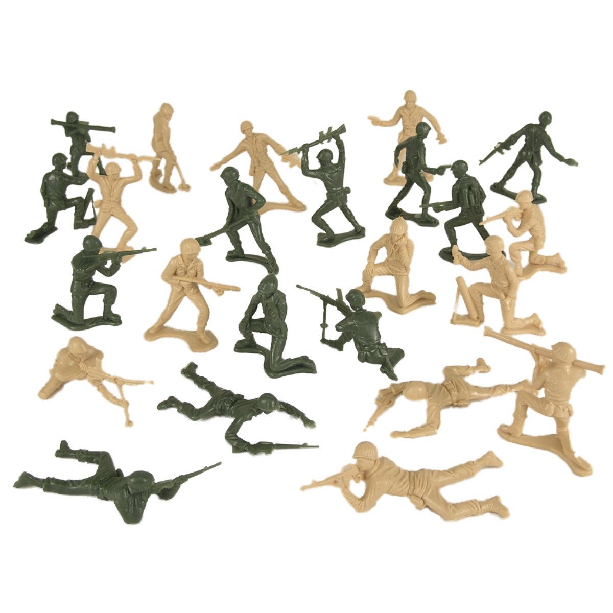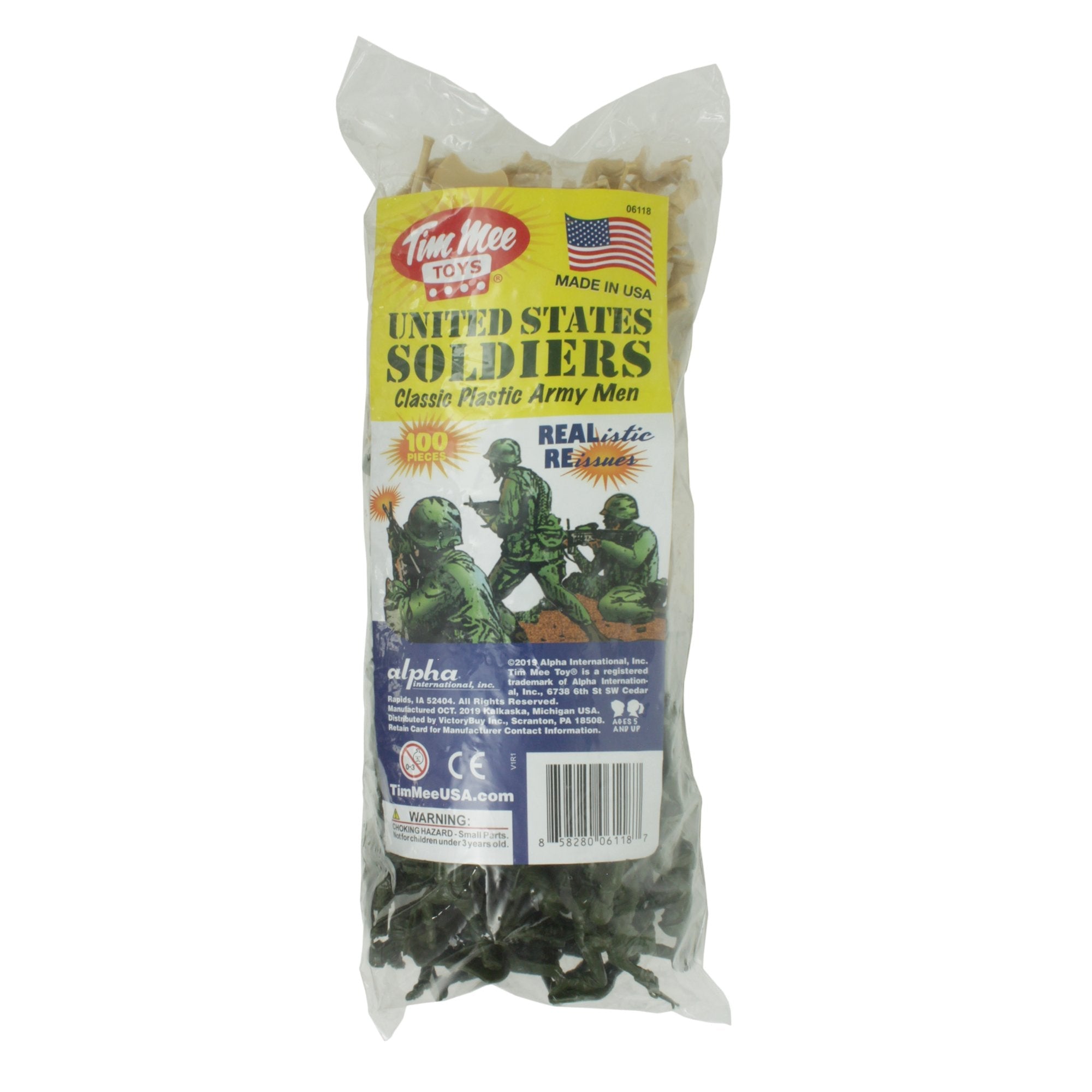 An American Classic is back in action. This pack of 100 Tim Mee Toy Plastic Army Men is proudly manufactured in the United States, and includes 50 tan and 50 Olive-Green troops for maximum play value. There's about 12 different figures and all your old favorites are here, including minesweeper, bazookaman, radio operator, 60mm mortar, light MGner, kneeling rifleman, flame thrower, crawling rifleman, prone rifleman, bayonet fighter, and officer with binoculars. Figures stand up to 2.1 inches tall and are approximately 1:35 scale. Made from slightly flexible LDPE plastic with medium detail, and very little flashing. Originally produced by Processed Plastic Co. (Tim Mee Toy's parent company at the time) around 1968, these figures were probably the first to depict US Infantry troops of the Cold War era with contemporary equipment. These are real plastic heroes, meant to be set up, knocked down, picked up and played with for years to come. Little Green Army Men have even been inducted into the National Toy Hall of Fame. Packed in clear bag with insert card and recommended for ages 5 and up.