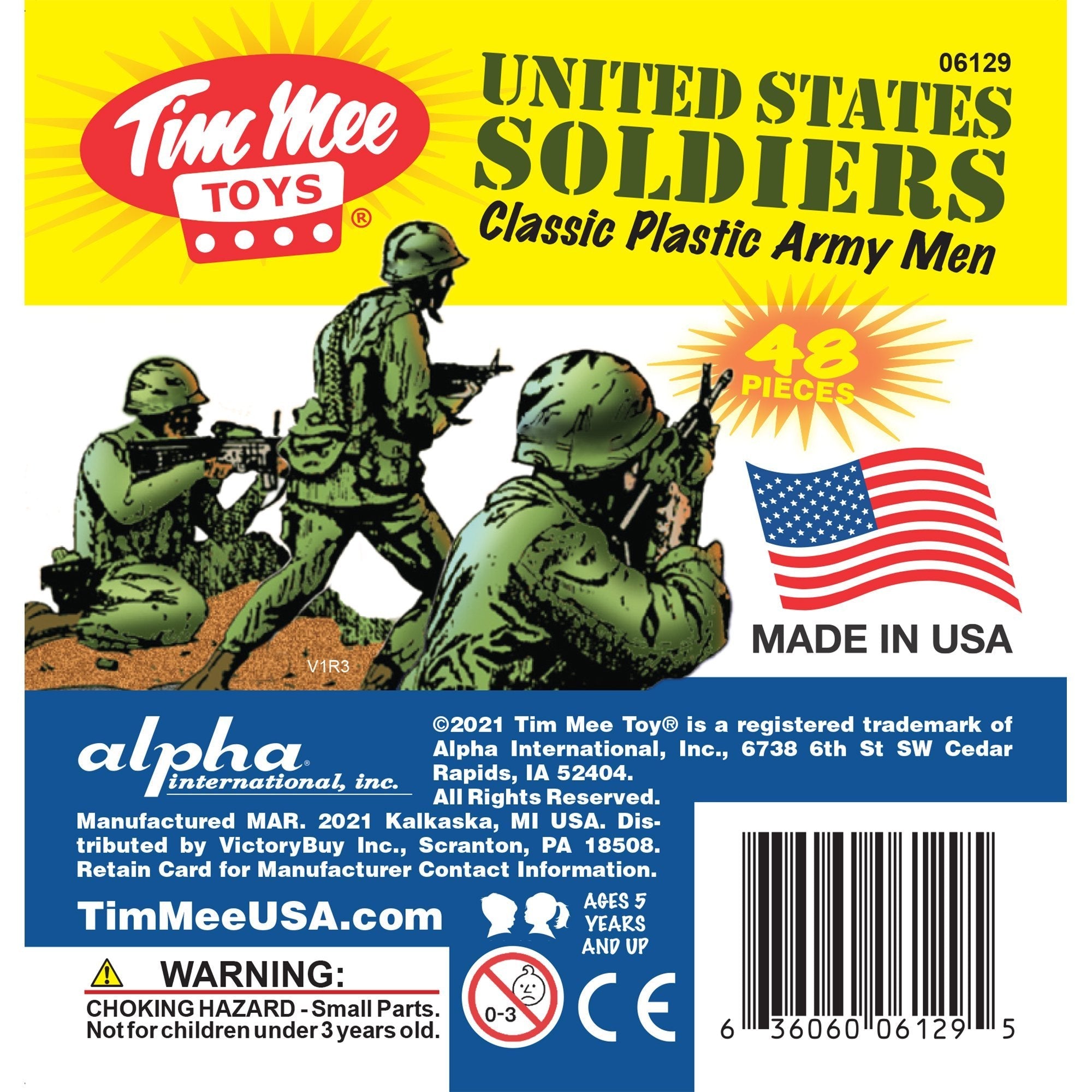 An American Classic for generations. This bag of 48 Tim Mee Toy Plastic Army Men is proudly manufactured in the United States, and includes 24 Desert-Tan and 24 Olive-Green troops for maximum play value. There's about 12 different figures and all your old favorites are here, including minesweeper, bazookaman, radio operator, 60mm mortar, LMG operator, kneeling rifleman, flame thrower, crawling rifleman, prone rifleman, bayonet fighter, and officer with binoculars. Figures stand up to 2.1 inches tall and are approximately 1:35 scale. Made from slightly flexible LDPE plastic with medium detail, and very little flashing. Originally produced by Processed Plastic Co. (Tim Mee Toy's parent company at the time) around 1968, these figures were probably the first to depict US Infantry troops of the Cold War era with contemporary equipment. These are real plastic heroes, meant to be set up, knocked down, picked up and played with for years to come. Little Green Army Men have even been inducted into the National Toy Hall of Fame. Packed in clear bag with insert card and recommended for ages 5 and up.