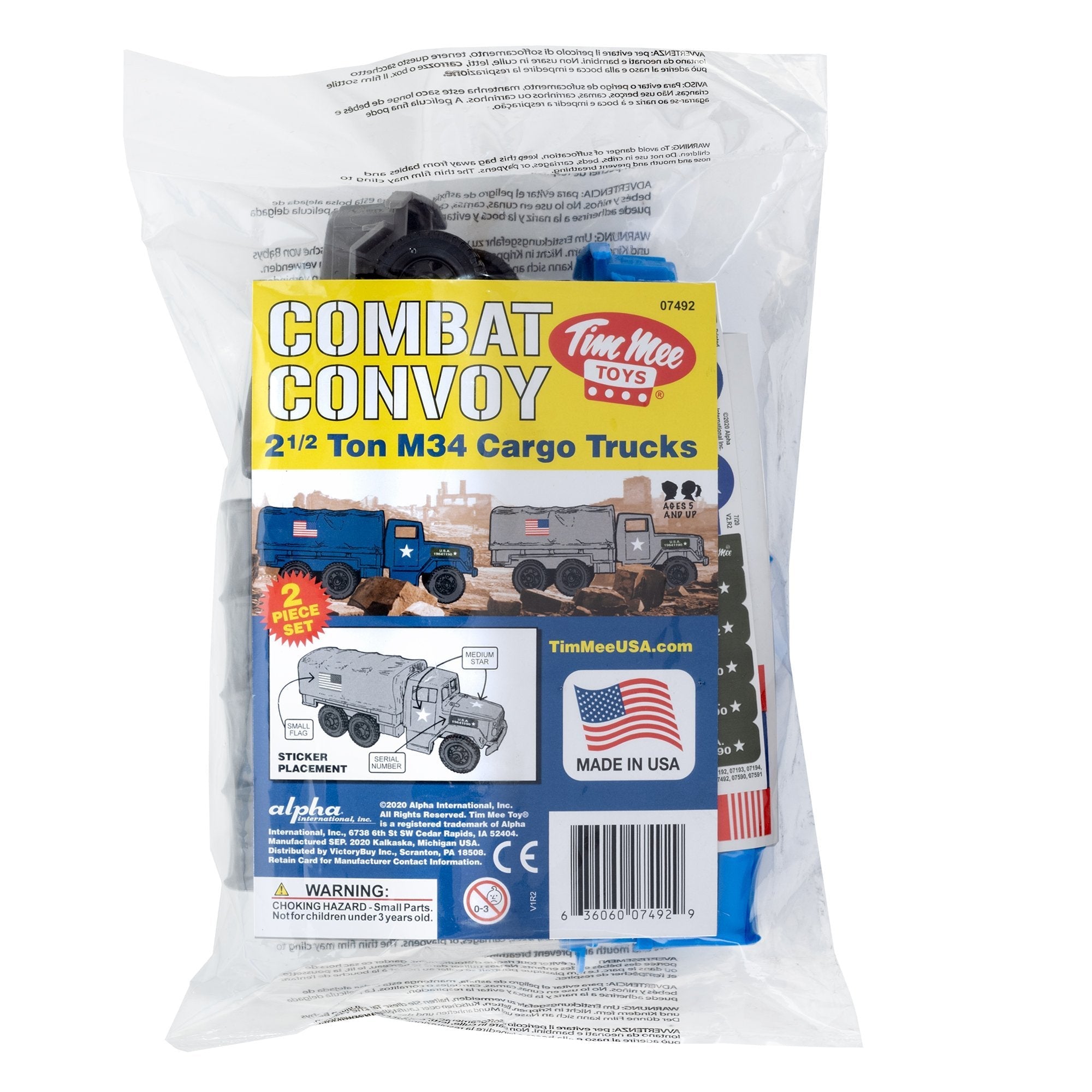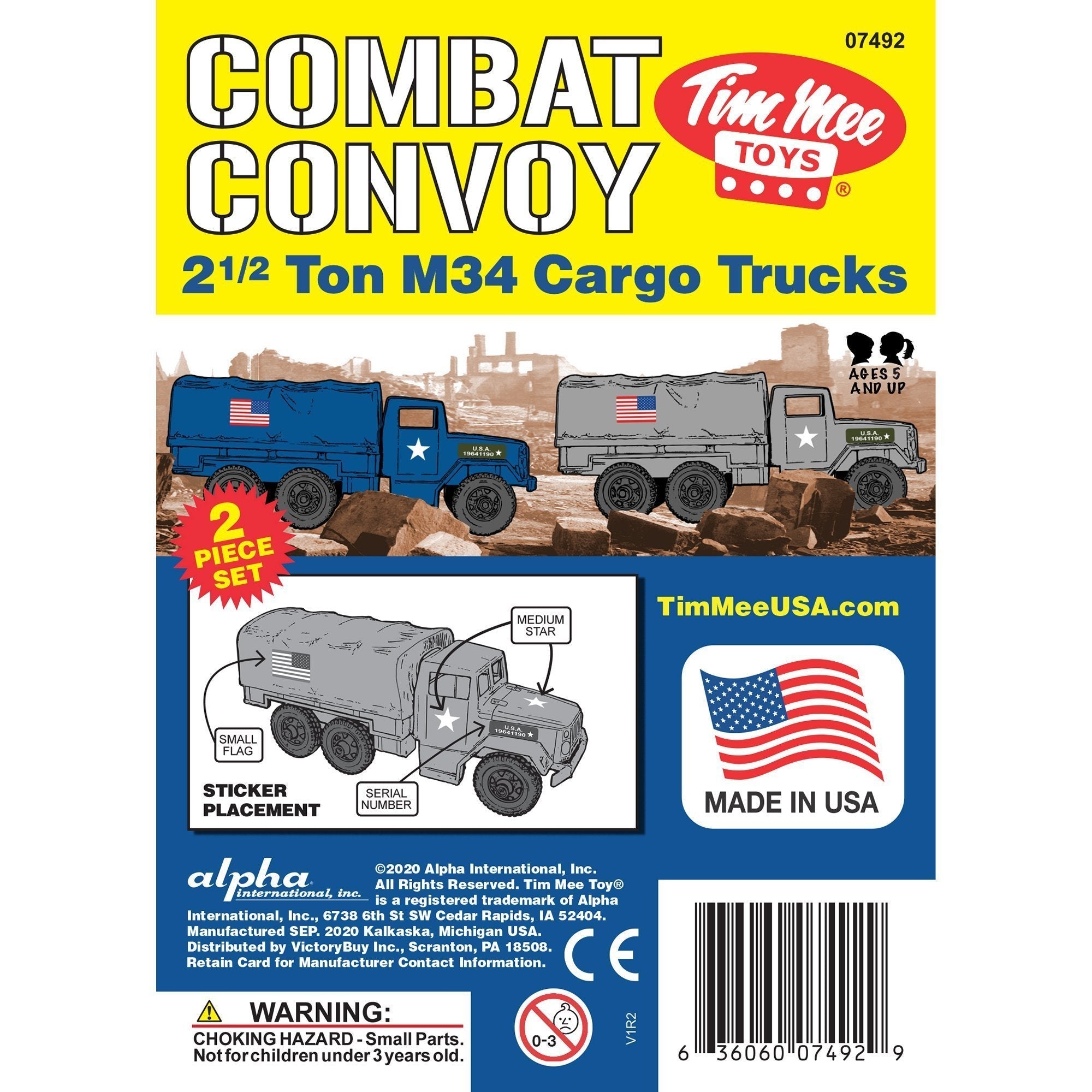 An American classic rides again. These Tim Mee Toy Deuce-and-a-Half 2-1/2 Ton Cargo Trucks are proudly manufactured in the United States and available as this 2 piece Set that includes 1 blue and 1 gray vehicle. Trucks feature removable canvas cover and rolling wheels with real metal axles. Each truck is approximately 1:35 scale and measures 8 inches long. Made from slightly stiff HDPE plastic with medium detail and very little flashing. This is likely the most iconic and popular Army Men Truck of all time and was originally produced from 1964 through 1990 by Processed Plastic Co. (Tim Mee Toy's parent company at the time). Modeled after the M34 or M35 built by REO, it is THE most requested Tim Mee Toy item since the Tim Mee Toy M16 Soldiers were reissued back in 2011. The location of the original plastic injection tool is not known, so a reproduction plastic injection tool was made to bring this classic toy back to life. The only change to the design is the rear hitch has been updated to match the current Tim Mee Toy Combat Patrol Artillery for compatibility. These are real American made toys, meant to be rolled around, knocked over, picked up and played with for years to come. Recommended for ages 5 and up.