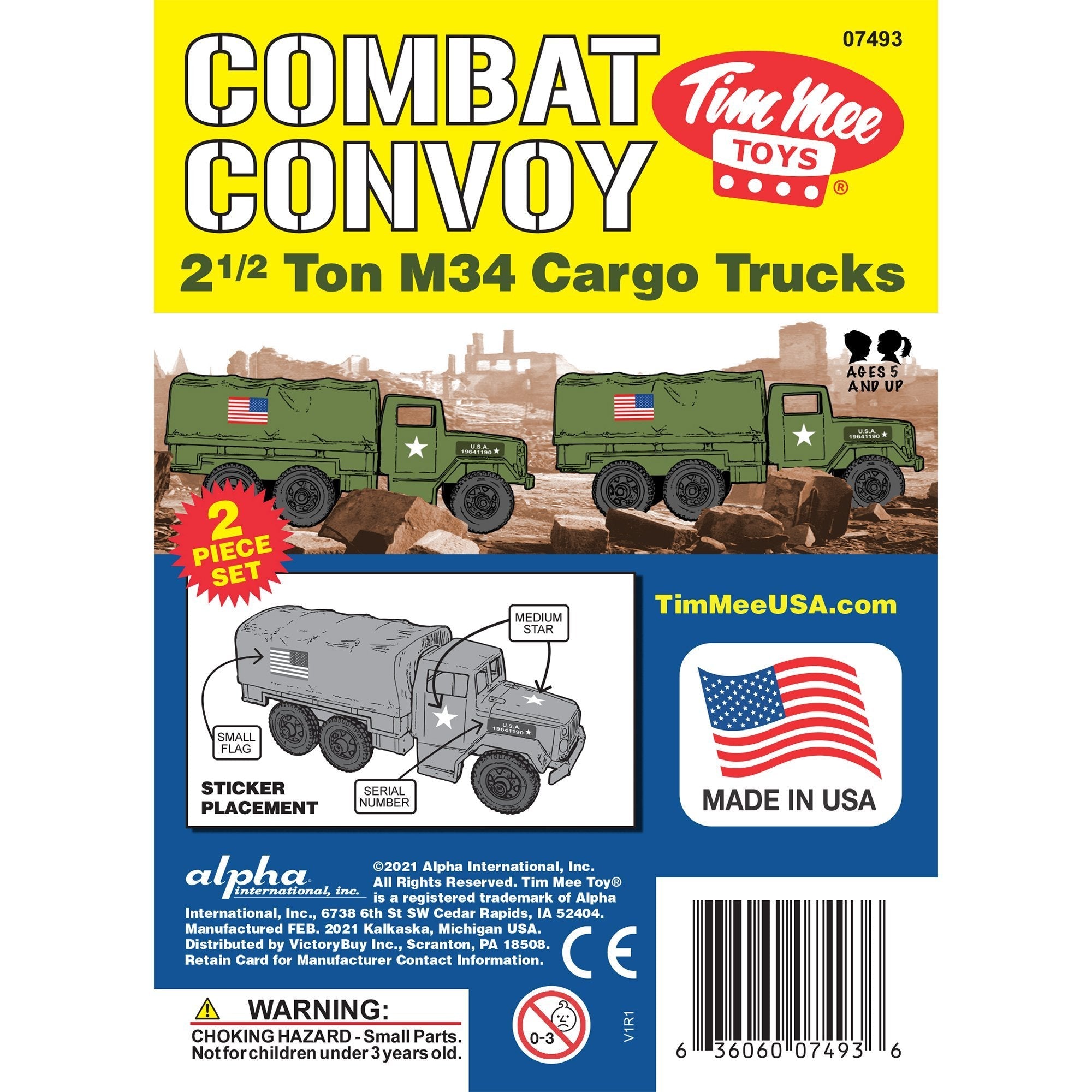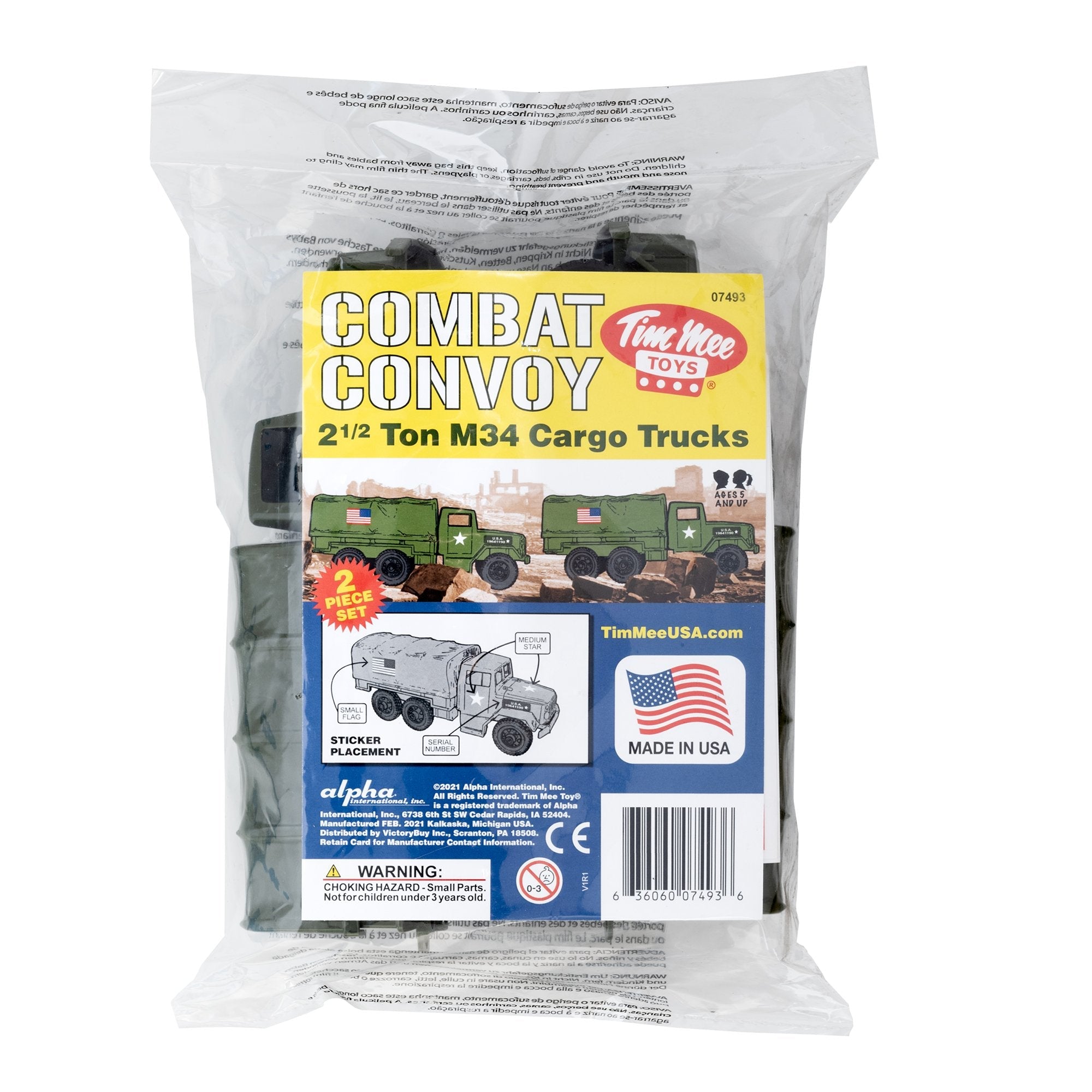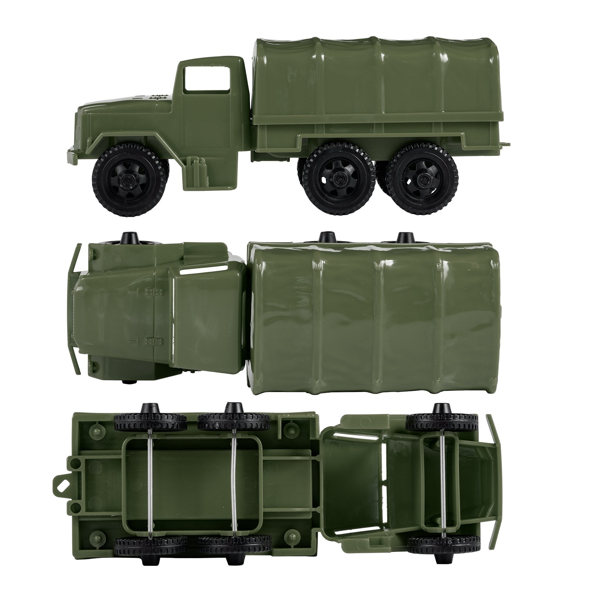 An American classic rides again. These Tim Mee Toy Deuce-and-a-Half 2-1/2 Ton Cargo Trucks are proudly manufactured in the United States and available as this 2 piece Set that includes 2 Olive-Green vehicles. Trucks feature removable canvas cover and rolling wheels with real metal axles. Each truck is approximately 1:35 scale and measures 8 inches long. Made from slightly stiff HDPE plastic with medium detail and very little flashing. This is likely the most iconic and popular Army Men Truck of all time and was originally produced from 1964 through 1990 by Processed Plastic Co. (Tim Mee Toy's parent company at the time). Modeled after the M34 or M35 built by REO, it is THE most requested Tim Mee Toy item since the Tim Mee Toy M16 Soldiers were reissued back in 2011. The location of the original plastic injection tool is not known, so a reproduction plastic injection tool was made to bring this classic toy back to life. The only change to the design is the rear hitch has been updated to match the current Tim Mee Toy Combat Patrol Artillery for compatibility. These are real American made toys, meant to be rolled around, knocked over, picked up and played with for years to come. Recommended for ages 5 and up.