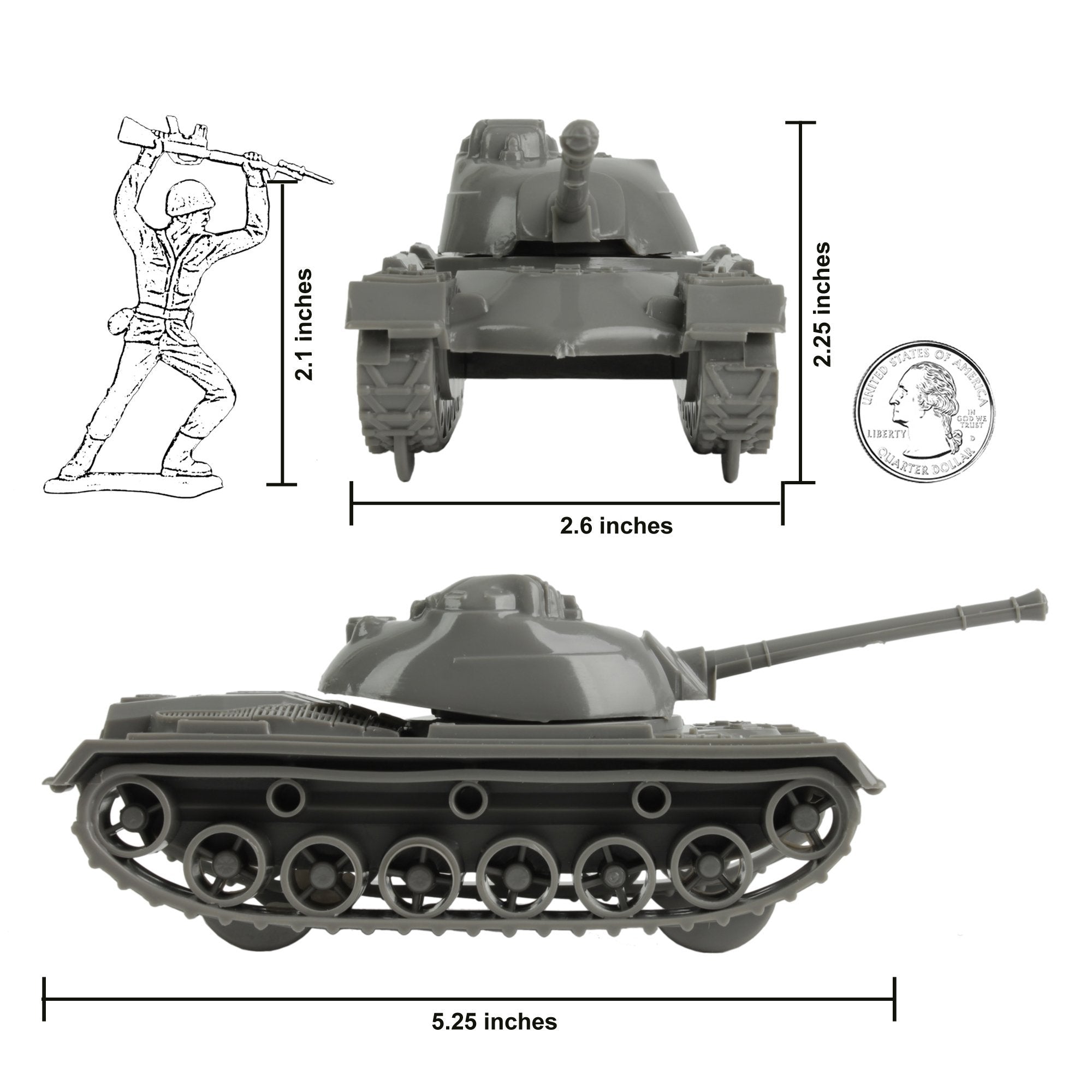 The Tim Mee Toy Patton Platoon Tank Division is ready for deployment in your Plastic Army. These #729 M48 Patton Tanks are proudly manufactured in the United States and available as this 3 piece Set. Each Tank features a turret that rotates, measures 6.5 inches long and is approximately 1:48 scale. Made from slightly stiff gray color HDPE plastic with lots of crisp detail and very little flashing. Modeled after the M48A2 Patton Tank, Tim Mee Toy first produced this toy in 1964 and modified the tooling several times over the decades until the final version seen here. This is the first time this Tank has been manufactured in a Charcoal-Gray color, and we're pleased to include a classic stars and serial number sticker sheet. As an extra bonus, stickers include mini-stars and a Tim Mee Toy logo that can be used to identify your favorite hero vehicle. This is likely the most popular and widely copied Army Men Tank of all time. These are real American Made toys, meant to be set up, knocked over, picked up and played with for years to come. Recommended for ages 5 and up.