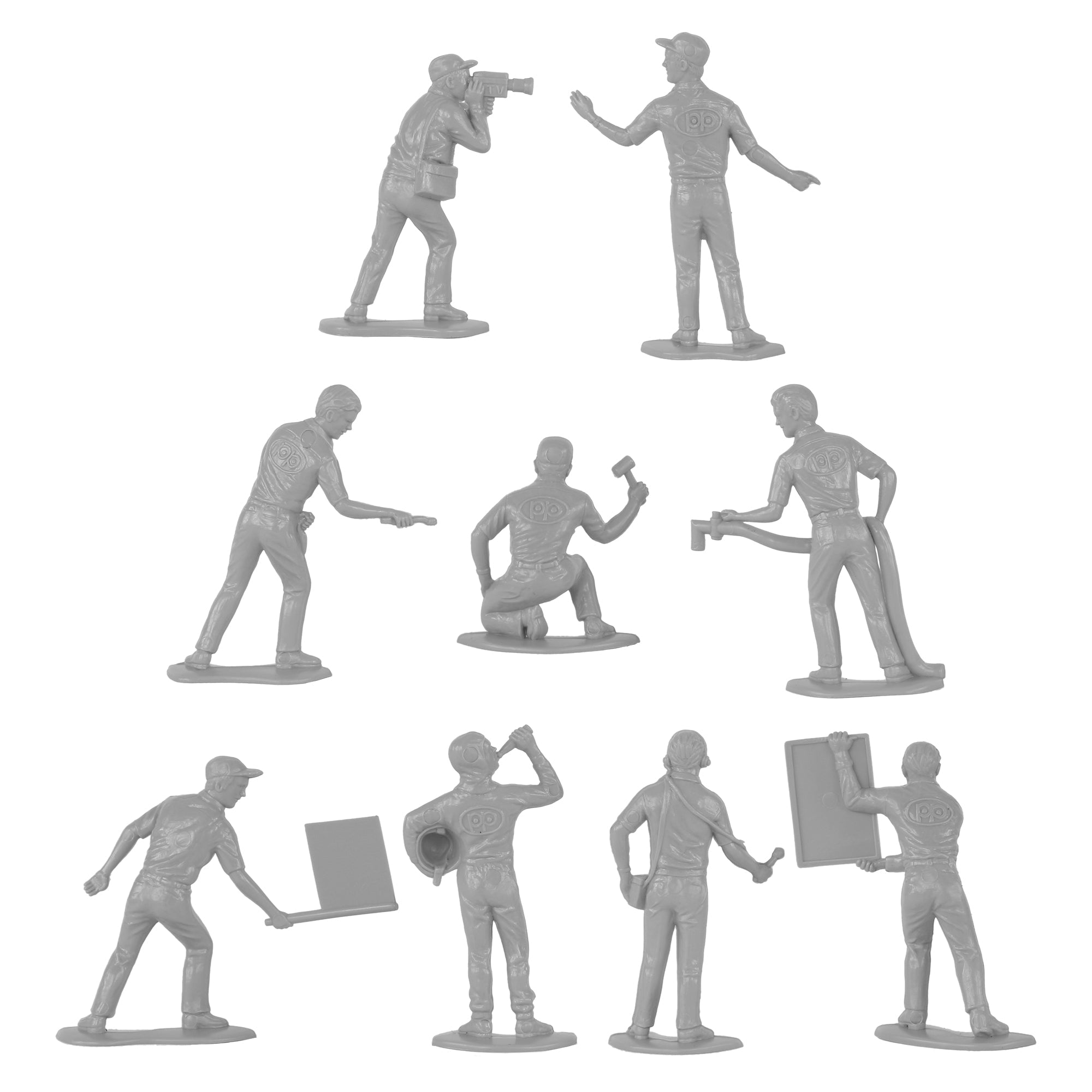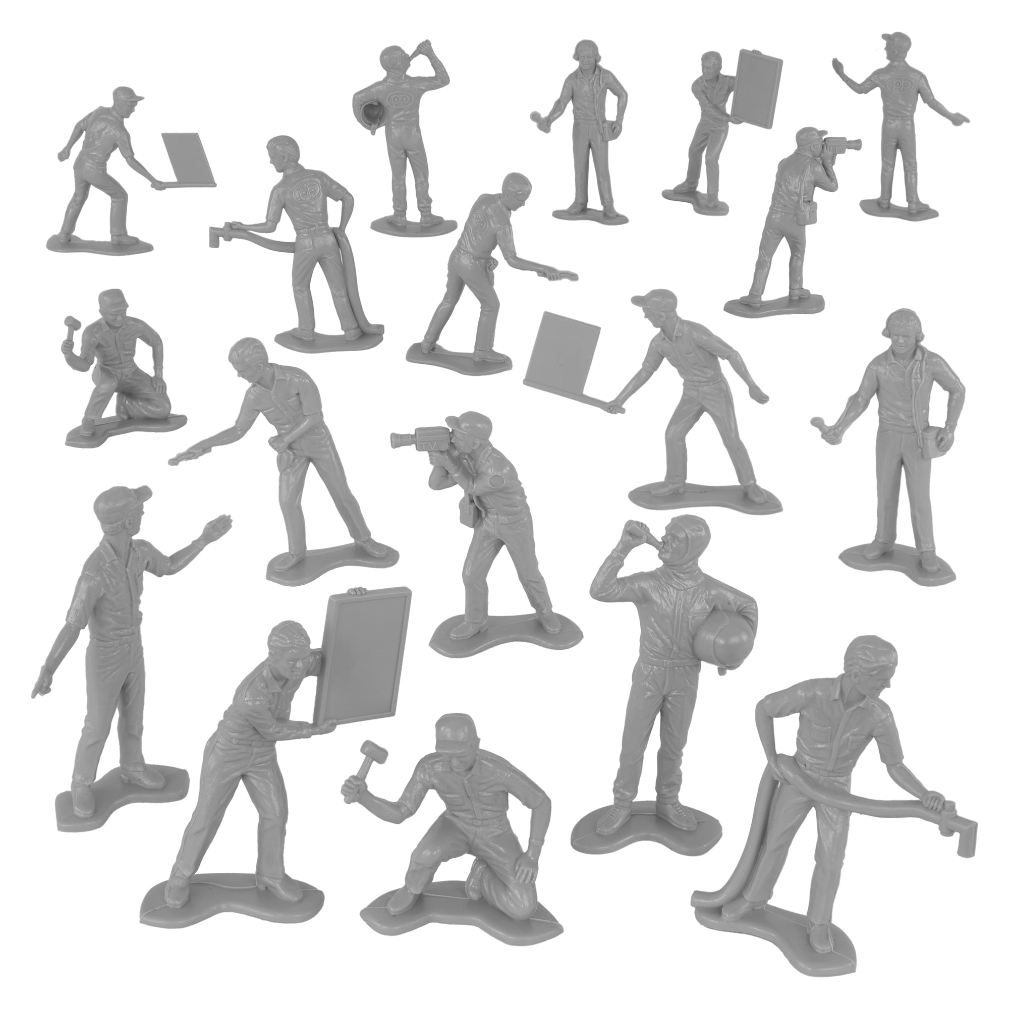 Specialists and Support Crews for your Plastic Army are ready for action. This Set of 18 Tim Mee Toy Plastic Army Men is proudly manufactured in the United States, and includes gray troops in 9 poses for maximum play value. Features test pilot, mechanics, ground crew, and even a film and sound crew. Figures stand up to 2.5 inches tall and are approximately 1:32 scale. Made from slightly flexible LDPE plastic with medium detail, and a little flashing. Originally produced around 1966 by Processed Plastic Co. (Tim Mee Toy's parent company at the time). These figures were initially offered as Speedway Pit Stop Indy Car Racing and later branded as NASCAR. They were usually plastic injection tooled in Red, White and Blue colors and often included with race cars as well as separately in a bag with a traffic cone. These are real plastic heroes, meant to be set up, knocked down, picked up and played with for years to come. Little Green Army Men have even been inducted into the National Toy Hall of Fame. Packed in clear bag with insert card and recommended for ages 5 and up.
