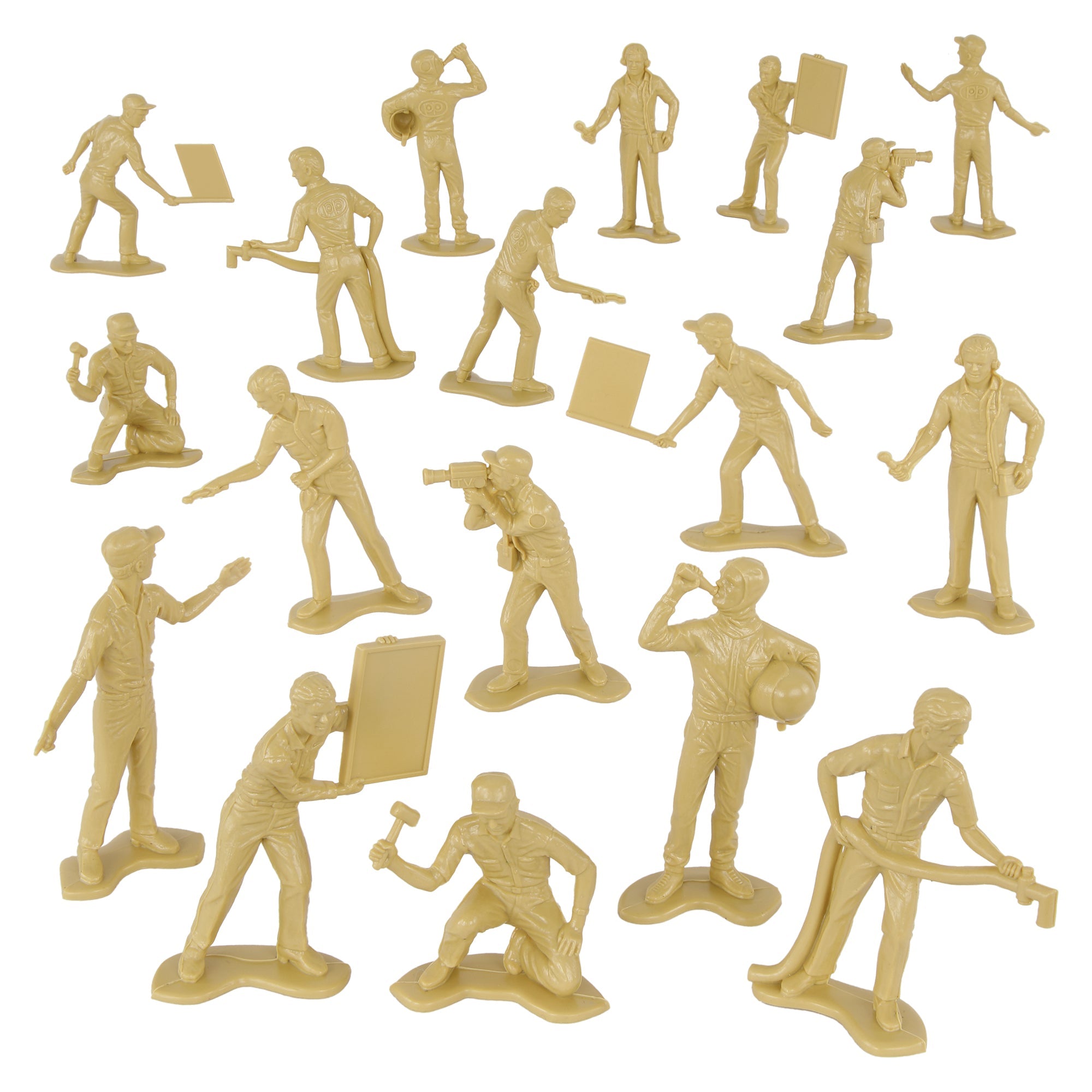 Specialists and Support Crews for your Plastic Army are ready for action. This Set of 18 Tim Mee Toy Plastic Army Men is proudly manufactured in the United States, and includes tan troops in 9 poses for maximum play value. Features test pilot, mechanics, ground crew, and even a film and sound crew. Figures stand up to 2.5 inches tall and are approximately 1:32 scale. Made from slightly flexible LDPE plastic with medium detail, and a little flashing. Originally produced around 1966 by Processed Plastic Co. (Tim Mee Toy's parent company at the time). These figures were initially offered as Speedway Pit Stop Indy Car Racing and later branded as NASCAR. They were usually plastic injection tooled in Red, White and Blue colors and often included with race cars as well as separately in a bag with a traffic cone. These are real plastic heroes, meant to be set up, knocked down, picked up and played with for years to come. Little Green Army Men have even been inducted into the National Toy Hall of Fame. Packed in clear bag with insert card and recommended for ages 5 and up.