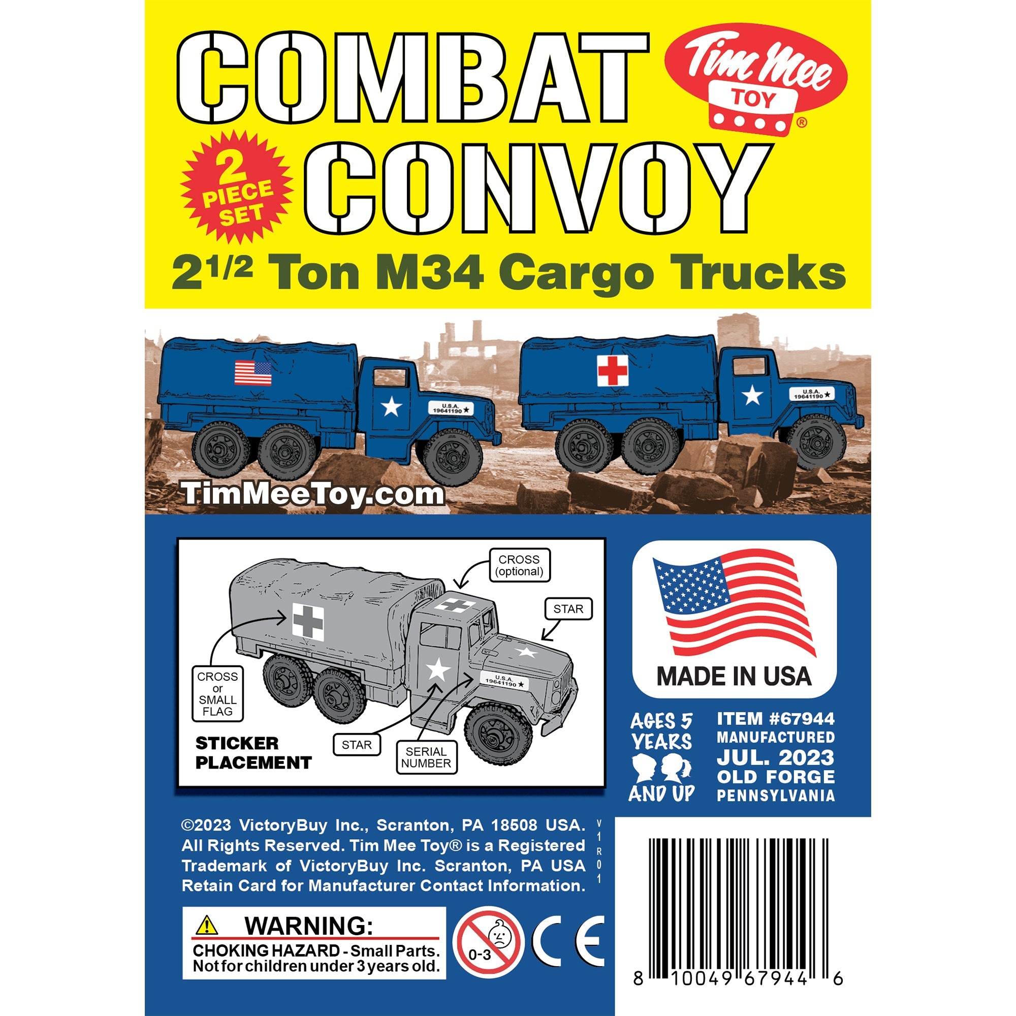 An American classic rides again. These Tim Mee Toy Deuce-and-a-Half 2-1/2 Ton Cargo Trucks are proudly manufactured in the United States and available as this 2 piece Set that includes Blue vehicles. Trucks feature removable canvas cover and rolling wheels with real metal axles. Each truck is approximately 1:35 scale and measures 8 inches long. Made from slightly stiff HDPE plastic with medium detail and very little flashing. This is likely the most iconic and popular Army Men Truck of all time and was originally produced from 1964 through 1990 by Processed Plastic Co. (Tim Mee Toy's Parent Company at the time). Modeled after the M34 or M35 built by REO, it is THE most requested Tim Mee Toy item since the Tim Mee Toy M16 Soldiers were reissued back in 2011. The location of the original plastic injection tool is not known, so a reproduction plastic injection tool was made to bring this classic toy back to life. The only change to the design is the rear hitch has been updated to match the current Tim Mee Toy Combat Patrol Artillery for compatibility. Includes sticker sheet with military and medical marking options. These are real American made toys, meant to be rolled around, knocked over, picked up and played with for years to come. Recommended for ages 5 and up.