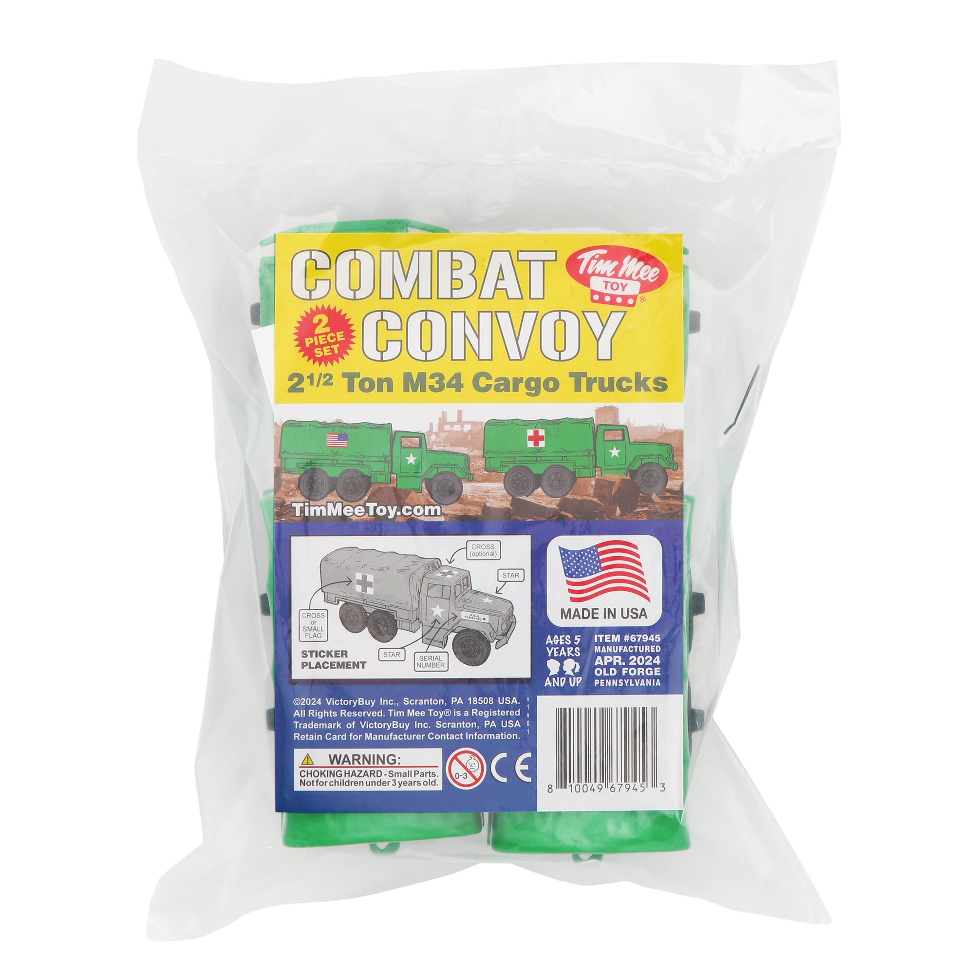 An American classic rides again. These Tim Mee Toy Deuce-and-a-Half 2-1/2 Ton Cargo Trucks are proudly manufactured in the United States and available as this 2 piece Set that includes 2 Medium-Green vehicles. Trucks feature removable canvas cover and rolling wheels with real metal axles. Each truck is approximately 1:35 scale and measures 8 inches long. Made from slightly stiff HDPE plastic with medium detail and very little flashing. This is likely the most iconic and popular Army Men Truck of all time and was originally produced from 1964 through 1990 by Processed Plastic Co. (Tim Mee Toy's Parent Company at the time). Modeled after the M34 or M35 built by REO, it is THE most requested Tim Mee Toy item since the Tim Mee Toy M16 Soldiers were reissued back in 2011. The location of the original plastic injection tool is not known, so a reproduction plastic injection tool was made to bring this classic toy back to life. The only change to the design is the rear hitch has been updated to match the current Tim Mee Toy Combat Patrol Artillery for compatibility. Includes sticker sheet with military and medical marking options. These are real American made toys, meant to be rolled around, knocked over, picked up and played with for years to come. Recommended for ages 5 and up.