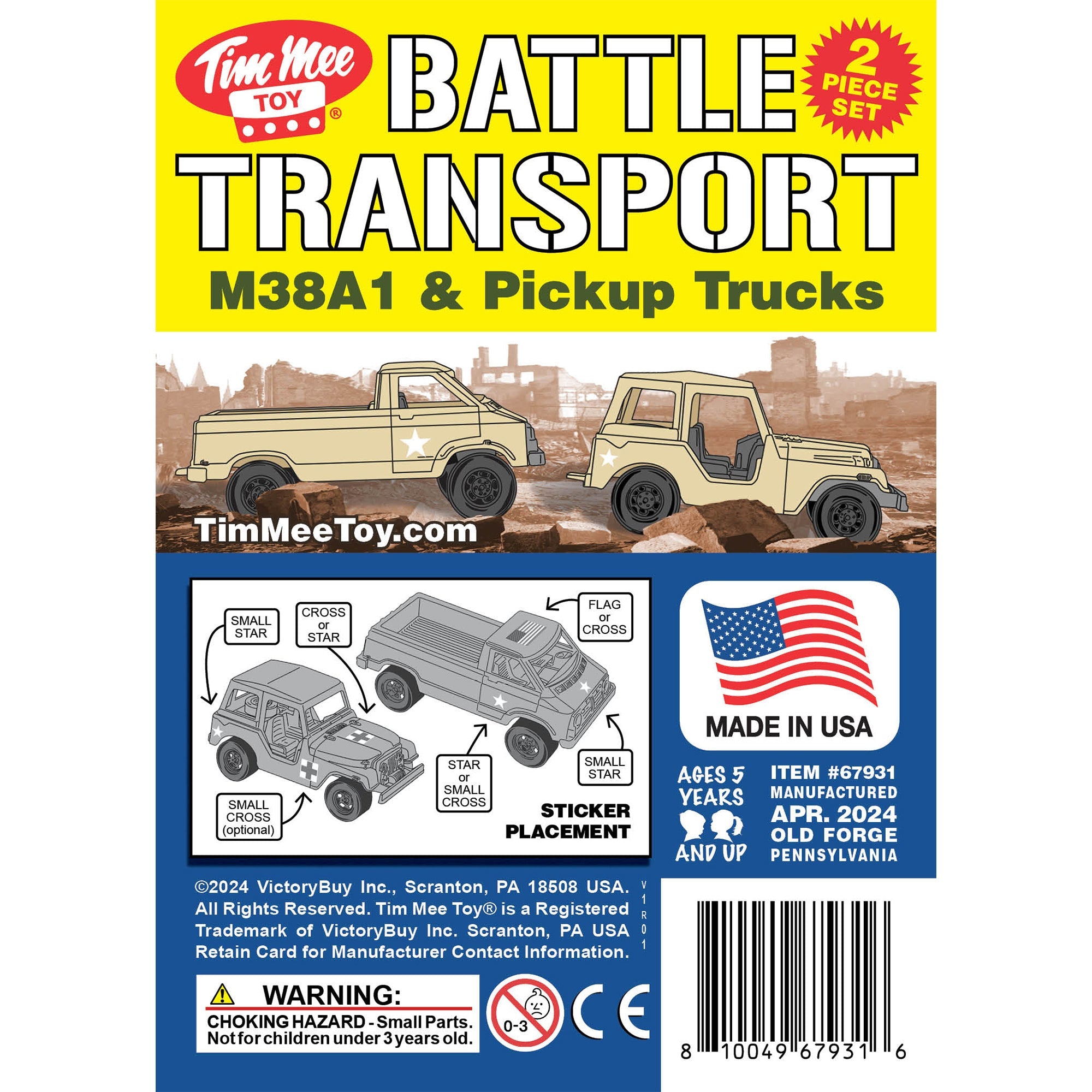 The Tim Mee Toy Battle Transport Vehicles are ready to roll out with your Plastic Army men. These Willys 1/4 ton and Light Pickup Trucks are proudly manufactured in the United States and available as this 2 piece. They feature smooth rolling wheels with metal axles, measure over 5 inches long and are approximately 1:32 scale. Made from slightly stiff Tan color HDPE plastic with crisp detail and very little flashing. These toy vehicles were originally produced around the 1970s by Strombecker Corporation and later offered under the Tootsietoy brand. The 2024 reissue features revised hitch that is compatible with the Tim Mee Toy M3 Artillery. Vehicles are also compatible in size and scale with the vintage Strombecker and Tootsietoy jeeps and trucks since they are manufactured with the original tooling. Most likely modeled after the Willys MD (M38A1) military vehicle and a custom or concept forward control pickup truck. Includes an optional sticker sheet with military and medical marking options. These are sturdy real American Made toys, meant to be rolled around, knocked over, picked up and played with for years to come. Packed in clear bag with insert. Recommended for ages 5 and up.