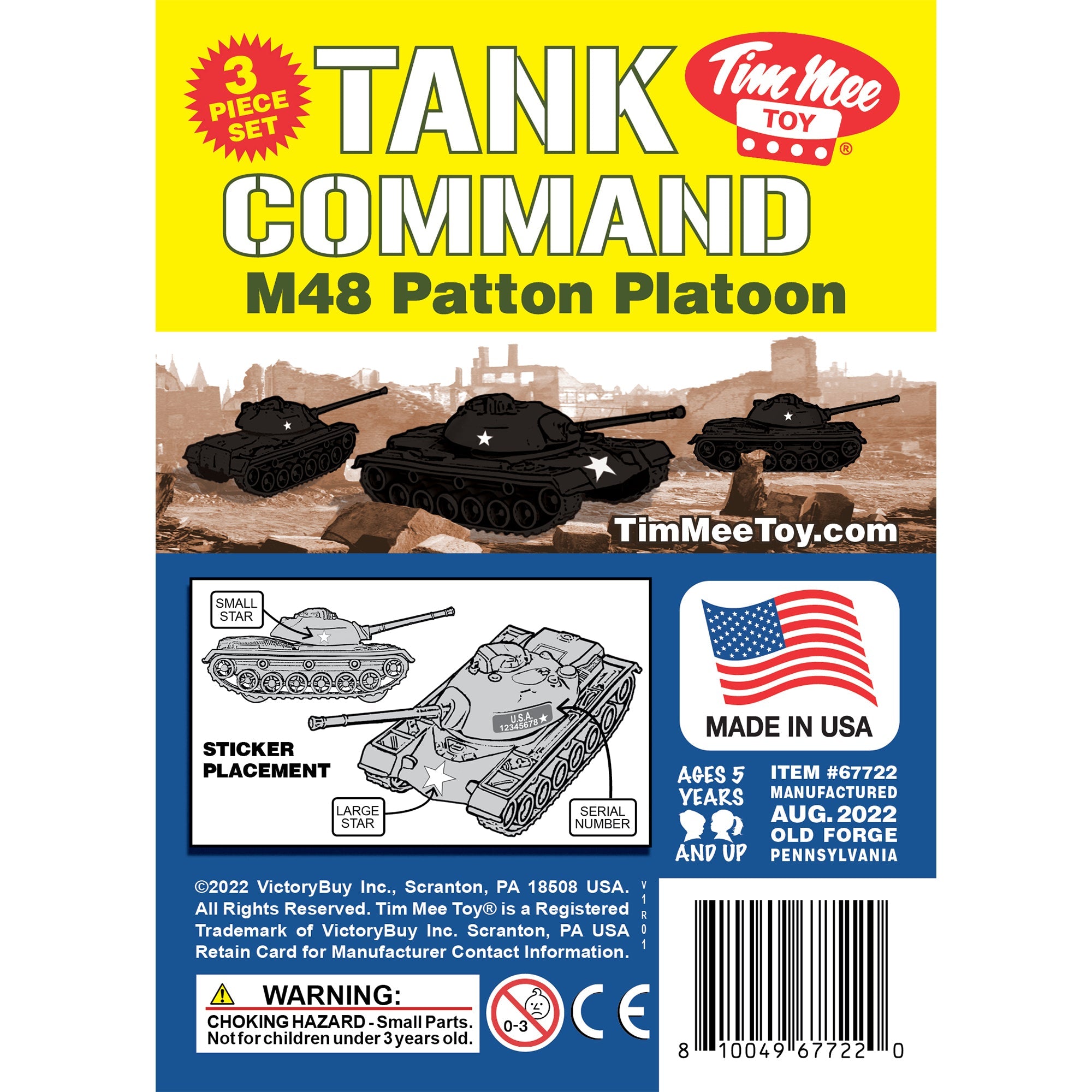 The Tim Mee Toy Patton PlatoonTank Division is ready for back yard deployment. These #729 M48 Patton Tanks are proudly manufactured in the United States and available in this 3 piece Set. Each Tank features a turret that rotates, measures 6.5 inches long and is approximately 1:48 scale. Made from slightly stiff black color HDPE plastic with lots of crisp detail and very little flashing. Modeled after the M48A2 Patton Tank, Tim Mee Toy first produced this toy in 1964 and modified the tooling several times over the decades until the final version seen here. Pack includes optional sticker sheet with the classic stars and serial numbers and bonus mini-stars and Tim Mee Toy logo. This is likely the most popular and widely copied toy Tank of all time. These are real toys, meant to be set up, knocked over, picked up and played with for years to come. Recommended for ages 5 and up.