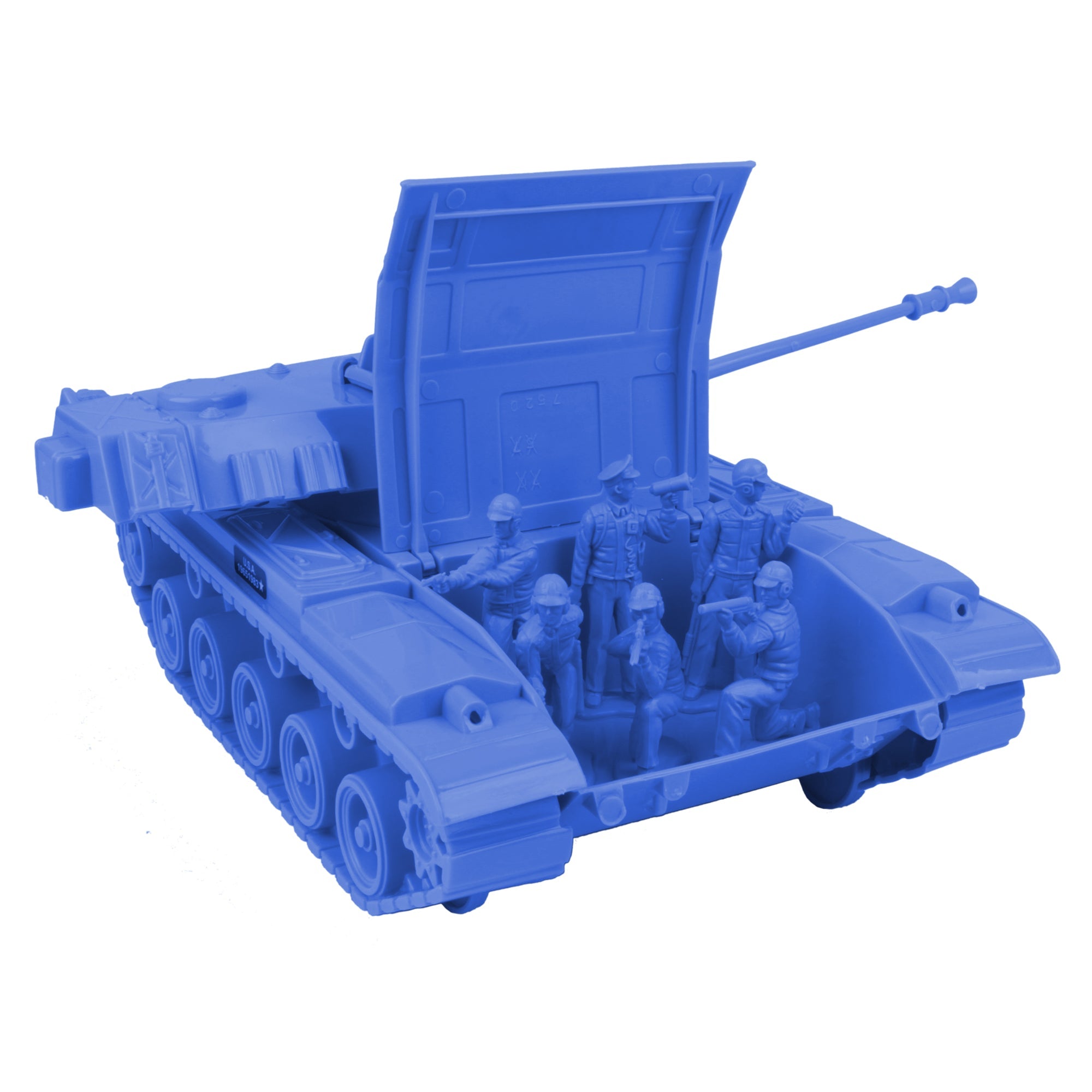 The Tim Mee Toy Walker Bulldog M48 Tank 13 piece Playset is ready for your next backyard battle. This #7520 Tanks is proudly manufactured in the United States and includes 12 tactical soldier figures. The Tank features an elevating barrel, turret that rotates, hatch that opens to reveal a fixed Tank commander, rolling wheels, and a storage compartment in the back. It measures 10.25 inches long (14 inches including barrel), 6 inches wide and is approximately 1:24 scale. Made from slightly stiff Blue color HDPE plastic with lots of crisp detail. The figures are made from slightly flexible LDPE plastic and feature a high level of detail with very little flashing. Figures stand up to 2.6 inches tall, are approximately 1:30 scale. This Tank was first produced around 1983 by Processed Plastic Co. (Tim Mee Toy's parent company at the time). Modeled after the M41 Walker Bulldog Light-Tank, and often described it as an M60 Tank. The figures were first produced as S.W.A.T. police in the late 1970's. As an extra bonus, a sticker sheet is included with stars, flags and the classic Tim Mee Toy serial numbers. This is one of the Largest Army Men type Tanks ever made and dwarfs the 1:48 scale Tim Mee Toy Patton Tanks. These are real toys, meant to be set up, knocked over, picked up and played with for years to come. Packaged in a plain clear bag and recommended for ages 5 and up.