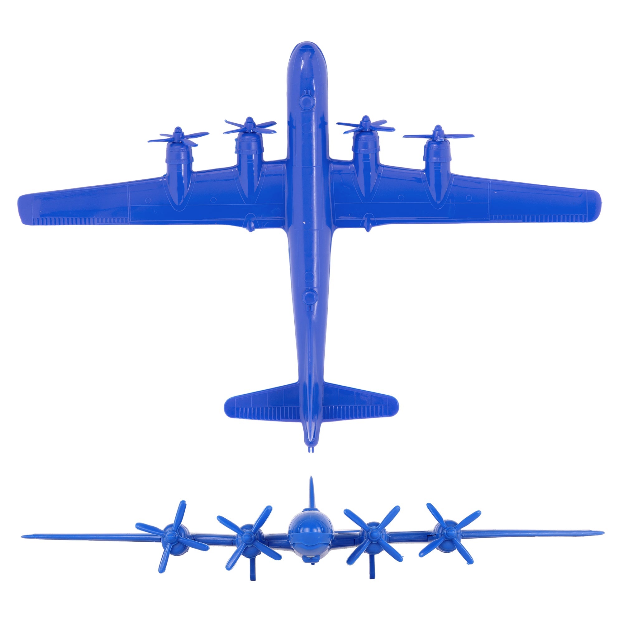 The Tim Mee Toy WW2 B-29 Superfortress Bomber Plane is ready for any Battle mission from your living room to the backyard. These aircraft are proudly manufactured in the United States. The airplanes are approximately 1:125 scale and measure 9.75 inches long with 13.75 inch wingspans and features propellers that spin. Made from slightly stiff blue color HDPE plastic with a medium amount detail and optional sticker sheet. These are modeled after the 1942 B-29 Superfortress Plane used in WW2 and the Korean War. These toy versions were first produced around 1965 by Processed Plastic Co. (Tim Mee Toy's parent company at the time) and were modified in 1975 to simplify production and assembly. This is the first time these have been produced in many decades. These are real American Made toys, meant to be set up, knocked over, picked up and played with for years to come. Packed in plain clear bag and includes option sticker sheet. Recommended for ages 5 and up.