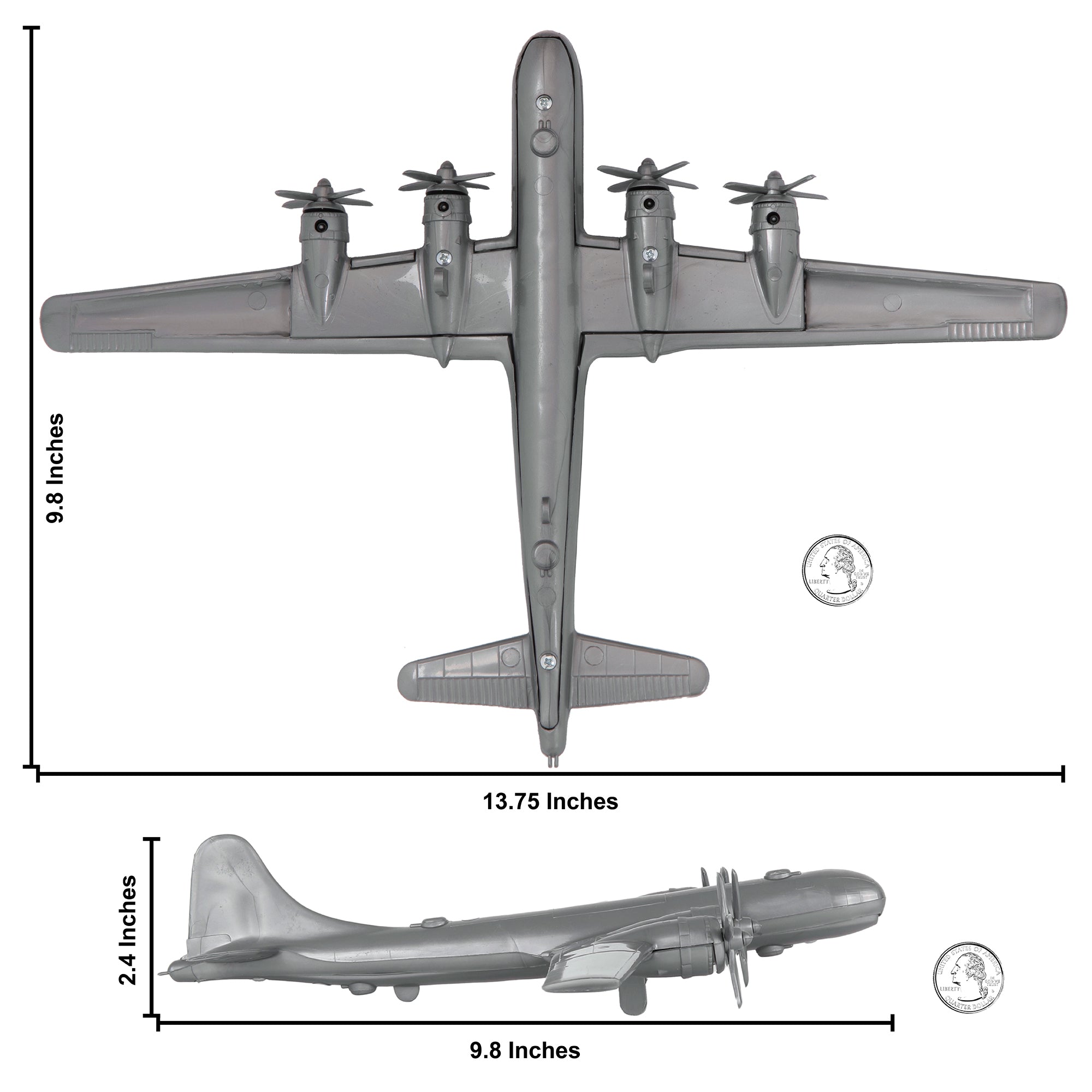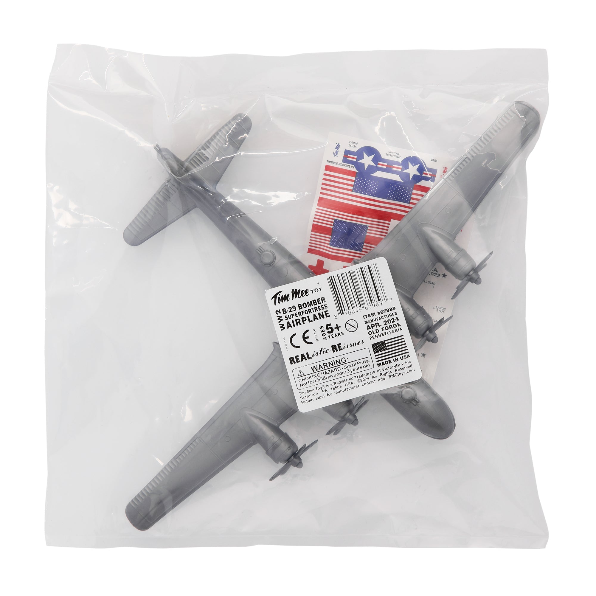 The Tim Mee Toy WW2 B-29 Superfortress Bomber Plane is ready for any Battle mission from your living room to the backyard. These aircraft are proudly manufactured in the United States. The airplanes are approximately 1:125 scale and measure 9.75 inches long with 13.75 inch wingspans and features propellers that spin. Made from slightly stiff silver-gray color HDPE plastic with a medium amount detail and optional sticker sheet. These are modeled after the 1942 B-29 Superfortress Plane used in WW2 and the Korean War. These toy versions were first produced around 1965 by Processed Plastic Co. (Tim Mee Toy's parent company at the time) and were modified in 1975 to simplify production and assembly. This is the first time these have been produced in many decades. These are real American Made toys, meant to be set up, knocked over, picked up and played with for years to come. Packed in plain clear bag and includes option sticker sheet. Recommended for ages 5 and up.