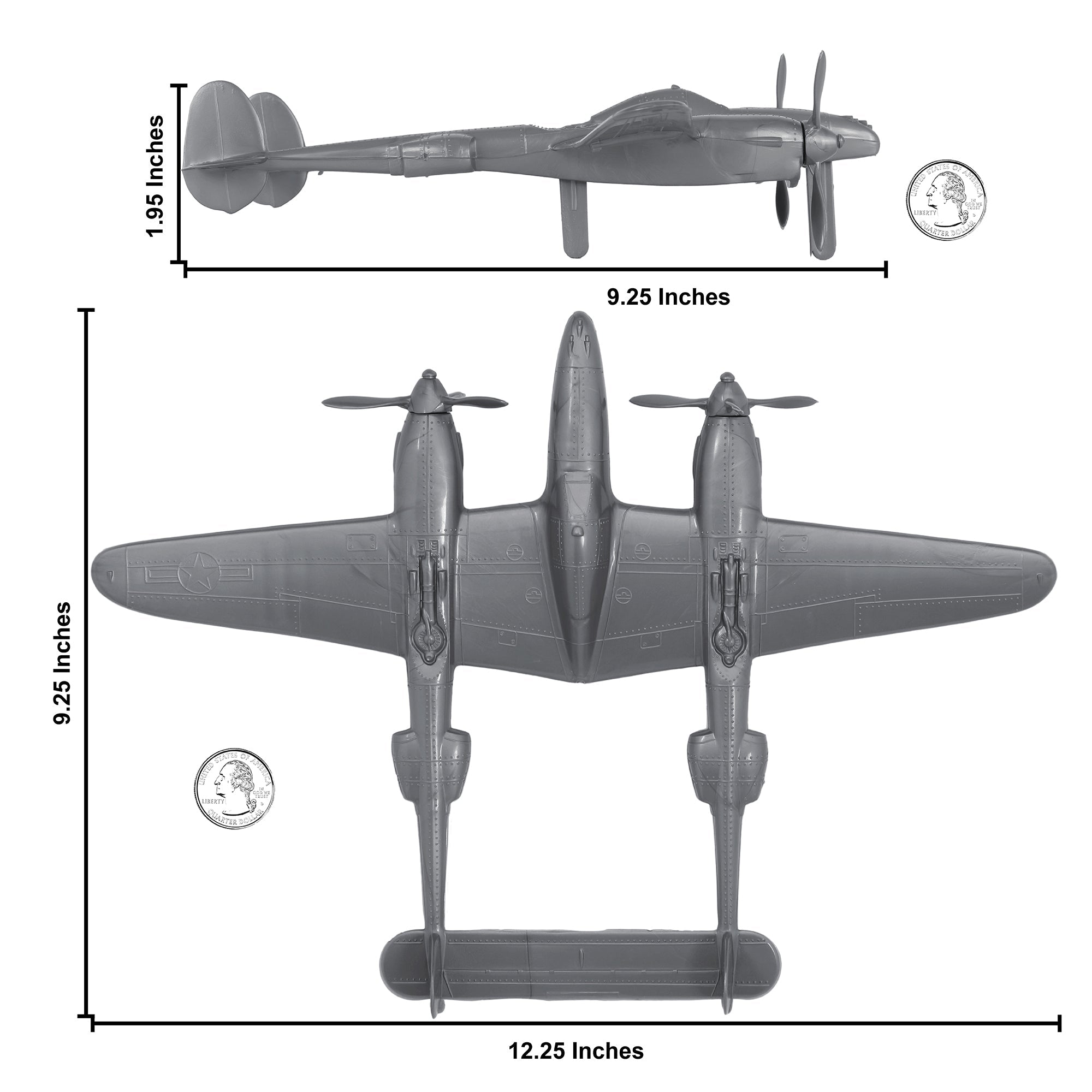 The Tim Mee Toy WW2 P-38 Lightning Fighter Planes are ready for any plastic Army dogfight. These aircraft are proudly manufactured in the United States and offered as a 2 piece Set. The airplanes are approximately 1:50 scale and measure 9.25 inches long with 12.25 inch wingspans and features propellers that spin. Made from slightly stiff silver-gray color HDPE plastic with a medium amount detail and optional sticker sheet. These are modeled after the 1939 WW2 Lockheed P-38 Lightning Fighter Plane. These toy versions were first produced around 1967 by Processed Plastic Co. (Tim Mee Toy's parent company at the time) and were modified in 1975 to simplify production and assembly. This is the first time these have been produced in many decades. These are real American Made toys, meant to be set up, knocked over, picked up and played with for years to come. Packed in plain clear bag and includes option sticker sheet. Recommended for ages 5 and up.