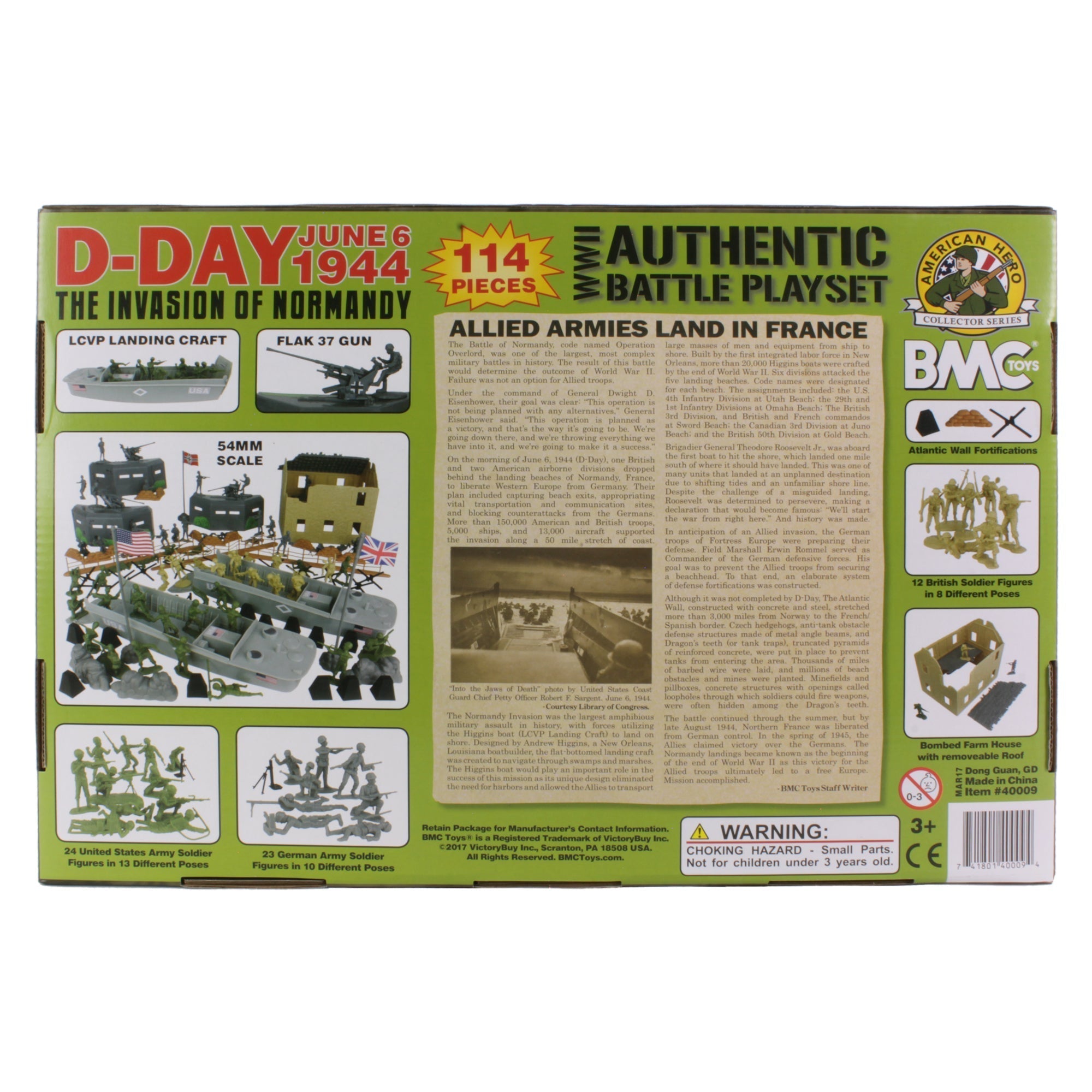 From the BMC Toys American Hero Collector Series, the greatest invasion in military history: The D-Day Invasion of Normandy 114 piece Plastic Army Men Playset contains 59 soldier figures. The troops include 24 American GIs in OD-Green, 23 German Soldiers in gray, and 12 British Tommies in tan. The figures feature Brigadier General Teddy Roosevelt Jr., Brigadier Lord Lovat, Sergeant Harrison Summers, and Field Marshal Erwin Rommel. The Set also includes 2 Higgins Boat LCVP Landing Craft with working ramps, 3 German Pillbox Bunkers with mounted Flak 37 Artillery, and a Bombed French Farmhouse with removable partial roof. Atlantic wall accessories include 3 Barbed Wire Fence sections, 12 Sandbag Stacks, 12 Dragon's Teeth Tank Traps, 12 Czech Hedgehogs, and 4 mortars. All pieces are about 1:32nd scale and made from fairly stiff, very durable, polypropylene or ABS plastic with medium detail and very little flashing. Figures stand up to 2.45 inches tall. The bunker measures 7.62 x 2.75 x 3.1 inches tall, not including the barrel which measures 5 inches long. The landing craft boat measures 12.8 x 3.9 x 3.25 inches tall. The farm house measures 8 x 5.75 x 7.25 inches tall and features Battle damage and snap together assembly. BMC Toys was founded by Bill McMaster in 1991 and specializes in producing historically accurate Plastic Army Men figures, Playsets and accessories in the classic realistic style of the 1950s and 1960s. Packaged in an a tray style storage box that features the history of DDay and biographies of the four character figures. Recommended for ages 5 and up. Adult assembly Recommended for farm house. The 2017 release features an improved farm house with reinforced walls in Light-Tan ABS plastic, new flags and rocks, and all new package art and sticker sheets.