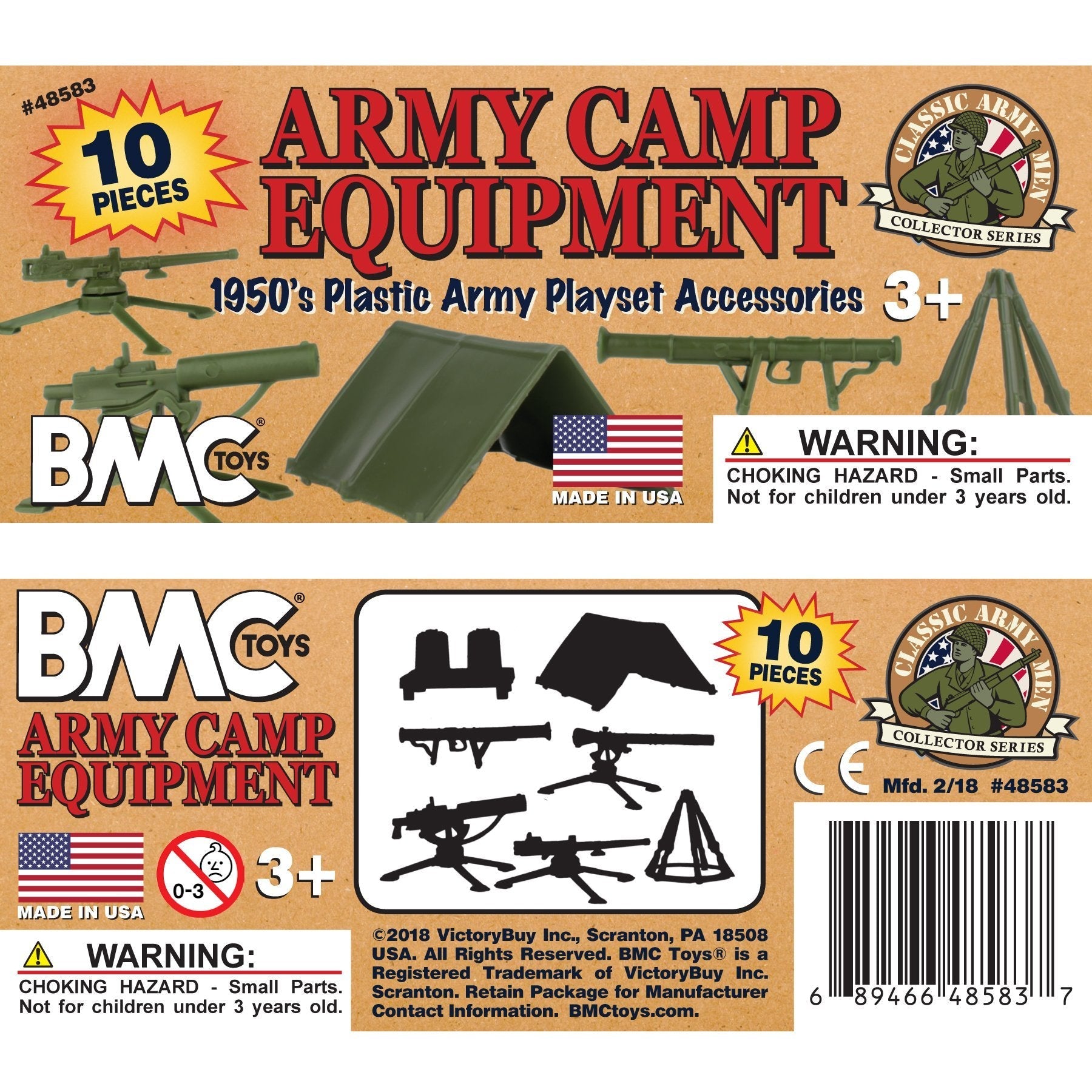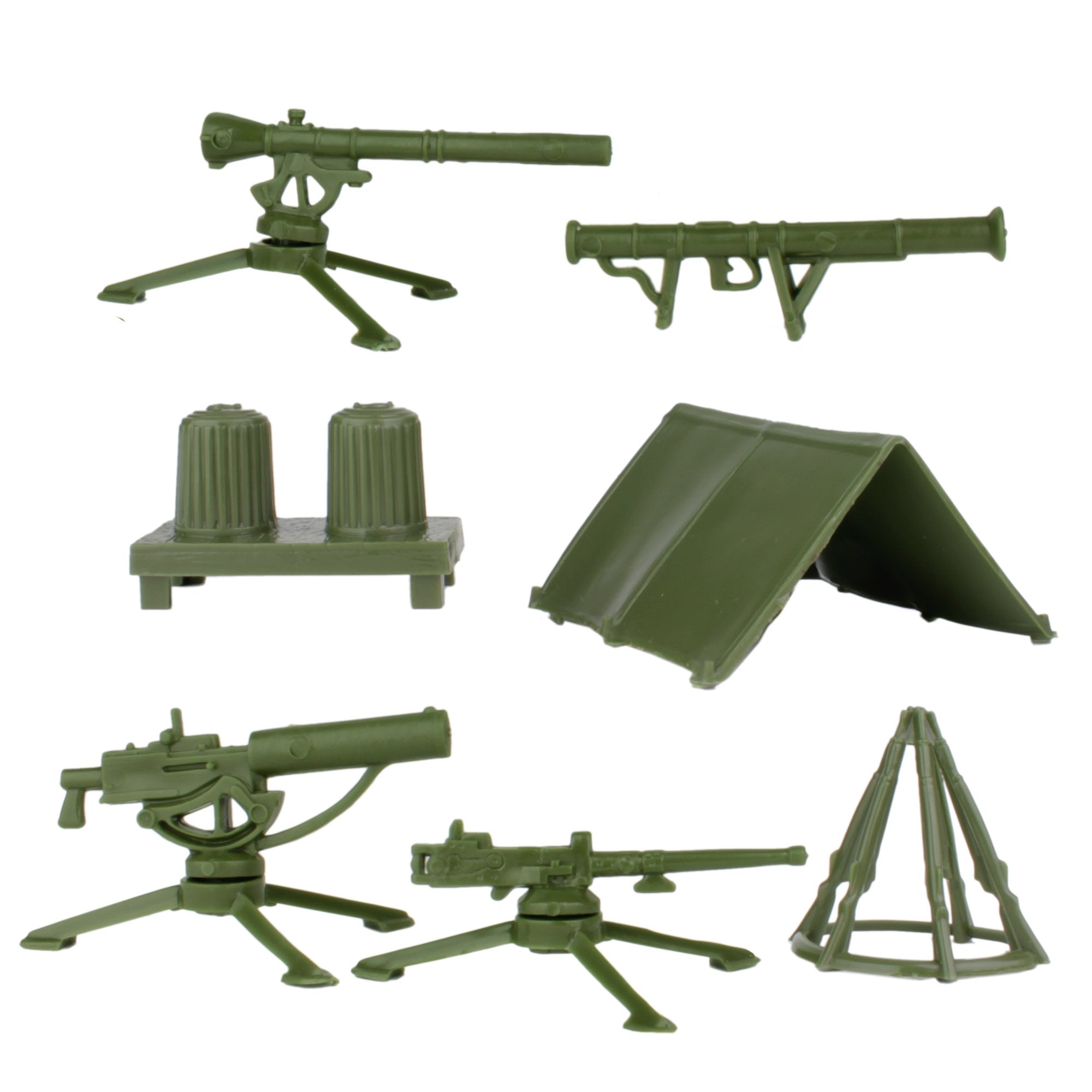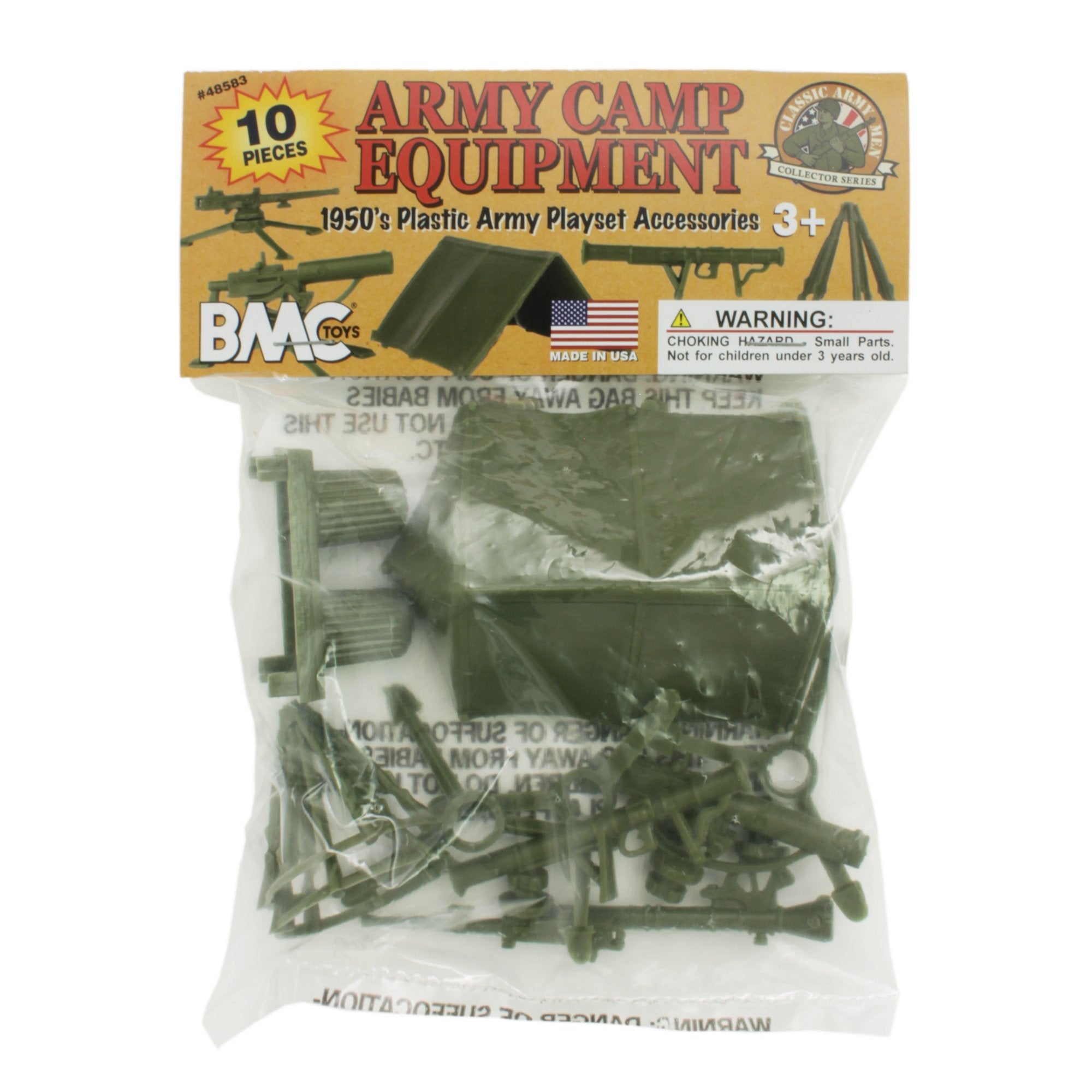 From the Classic Army Men Collector Series, BMC Toys brings back another American toy from yesteryear. This bag of 10 Olive-Green Army CAMP EQUIPmenT is proudly manufactured in the United States. The Set features 10 pieces and includes 3 Pup Tents, 2 Rifle Stacks rifle stacks with five M1 Garands each, Trash Cans on Platform, M9A1 Bazooka, and tripod mounted M2 Browning50 Caliber Air-cooled MG, M1917 Browning Water-cooled MG, and M18 Recoilless Rifle. Pieces vary from approximately 1:24 scale to 1:30 scale and are made from slightly flexible HDPE plastic with medium detail and very little flashing. These pieces were originally produced in the 1950s by Louis Marx and Co. for the Army Training Center Playset and were included in numerous Marx Toys military Playsets spanning many years. They are often referred to as the Training Center Field Accessories and known as group PL-348. This is a Set of real American Made plastic toys, meant to be set up, knocked down, picked up and played with for many years to come. Little Green Army Men have even been inducted into the National Toy Hall of Fame. Packed in clear bag with header card and recommended for ages 5 and up.