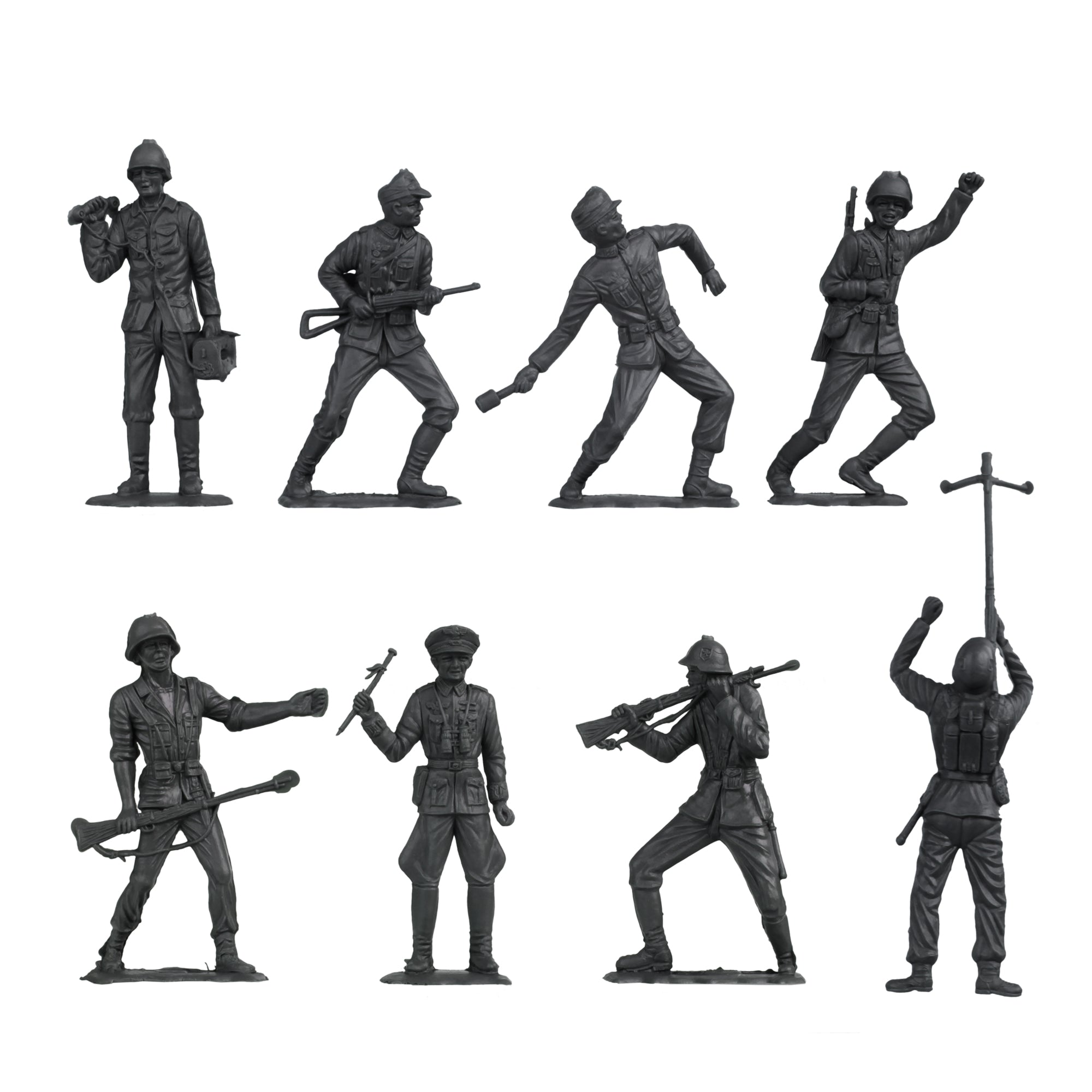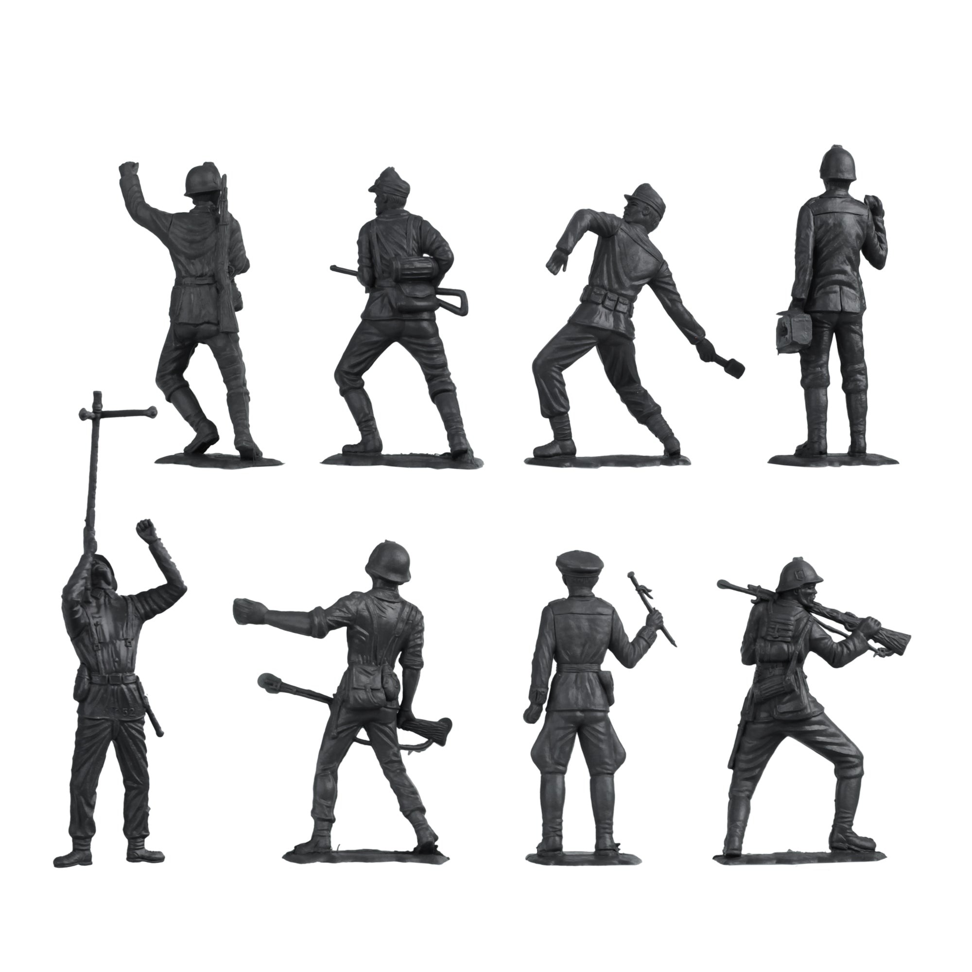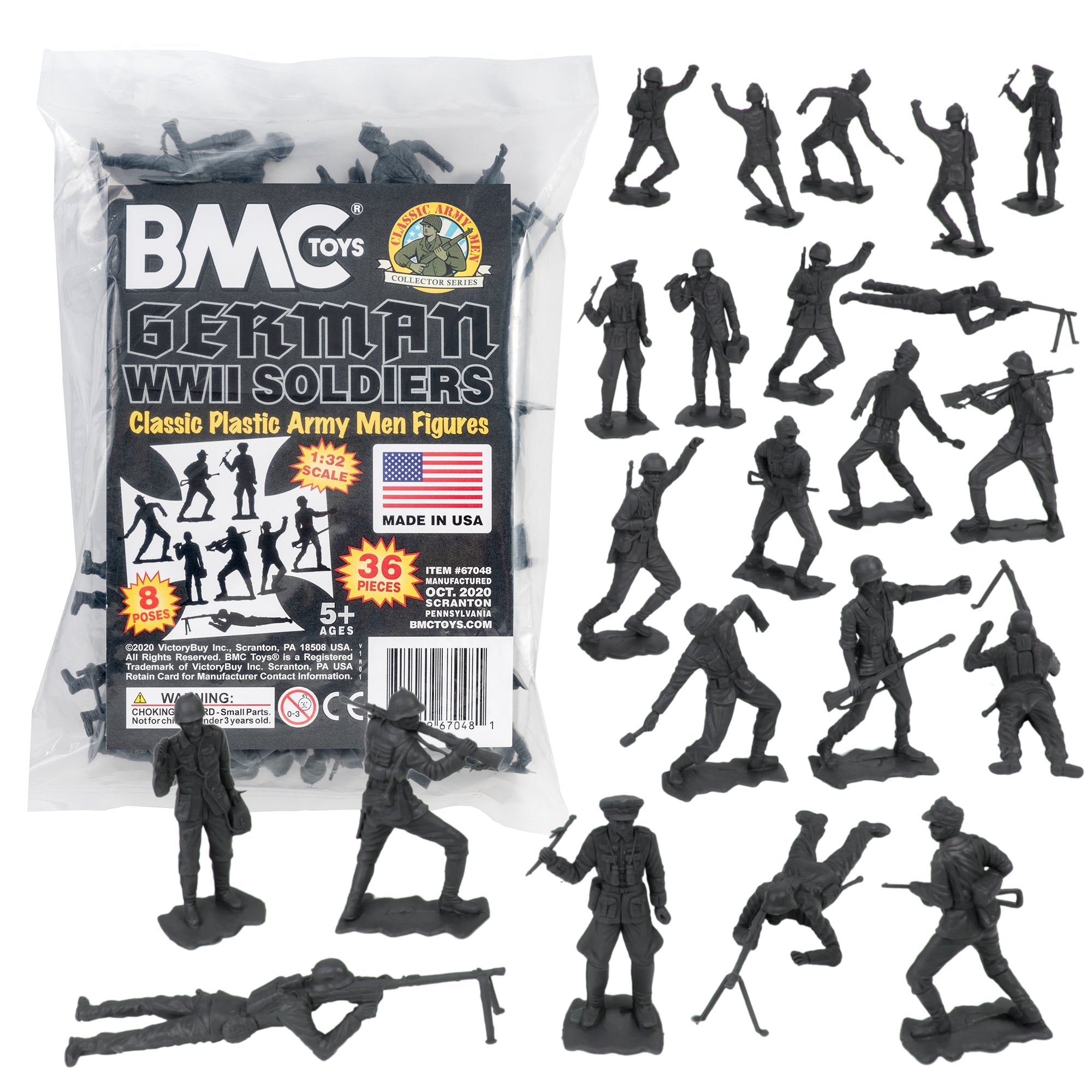 From the Classic Army Men Collector Series, BMC Toys brings back another classic Set of figures from the golden age of Army men. This bag of 36 Coal-Black German Plastic Army Men is proudly manufactured in the United States and features 8 different figures. The quantity of each figure pose will vary, but each package includes at least 2 of each figure. Troops are approximately 1:32 scale and stand up to 2.4 inches tall. Made from slightly flexible LDPE plastic with good details and some figures may have flashing due to the age of this plastic injection tool. These troops were originally introduced in the 1960s by MPC, also known as Multiple Toymakers, Multiple Products Corporation and Miner Industries. The figures originally had 1/4 inch holes in the bases that would plug into various accessories. For this reissue the holes have been closed up so they match other figures better. These were later produced by other companies and even included in a Marx Battleground Playset revival in the 1990s. These will make excellent troops for a variety of set ups for your WW2 Green Army men. This is a Set of real American Made plastic toys, meant to be set up, knocked down, picked up and played with for many years to come. Little Green Army Men have even been inducted into the National Toy Hall of Fame. Packed in clear bag with insert card and recommended for ages 5 and up.