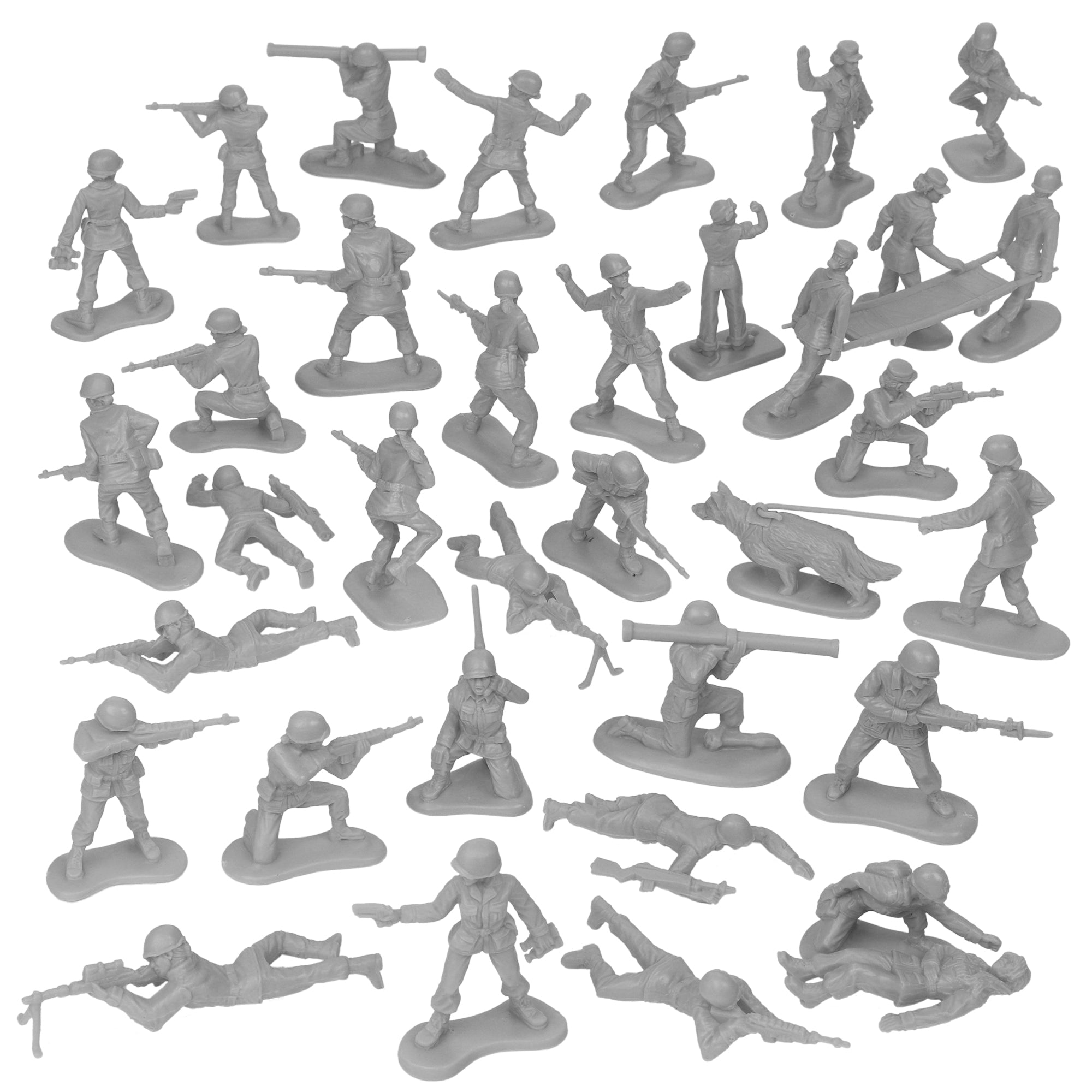 Introducing the Plastic Army Women Collector Series from BMC Toys. This all new Set of female figures is designed in the classic style of the best Plastic Army Men of the mid-20th century. The Set includes 36 pieces in 22 different poses along with a working dog with leash and stretcher accessories. The poses include Pathfinder Captain, Combat Pathfinder Captain, Standing Rifleman, Kneeling Rifleman, Prone Rifleman, Kneeling Sharpshooter, Prone Sharpshooter, Advancing with Bayonet, Grenadier, Bazooka Operator, Running Riflemen, Combat Medic, Low Crawling, Radio Operator, Wounded Soldier, Light MGner, Nurse, Corpsman, Mechanic, Military Working Dog, MWD Handler, and stretcher accessory. These troops stand up to 2.1 inches tall, are approximately 1:32 scale, and made from slightly flexible Gray color LDPE Plastic. The uniforms and equipment are modeled around the 1960 time period and fit with late Korean War and Early Vietnam War eras as well as training into the 1970s. The faces and figures are inspired by real Soldiers from the early 1900s to the present. This is a Set of real American Made plastic heroes, meant to be set up, knocked down, picked up and played with for years to come. Packed in clear bag with insert card and recommended for ages 5 and up.