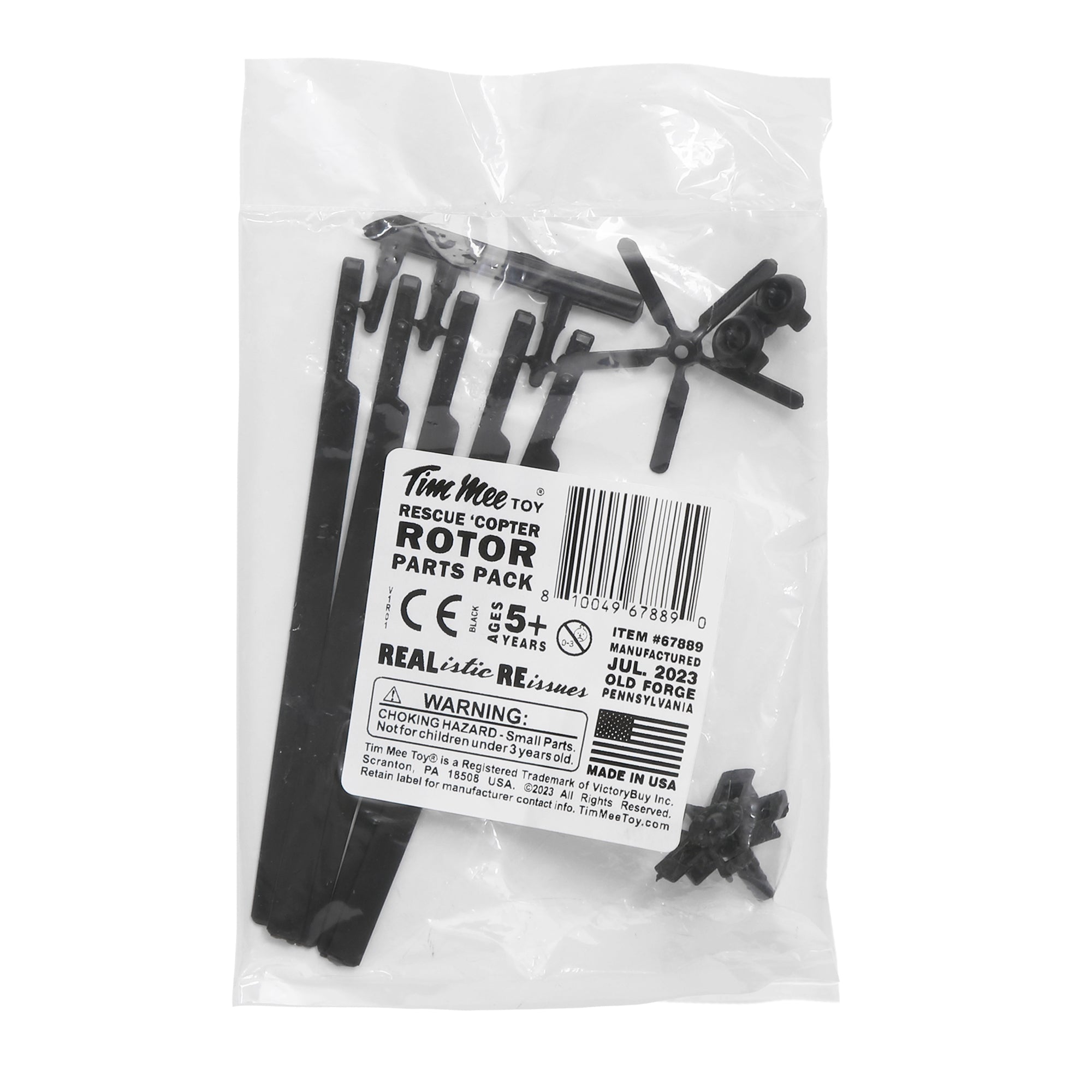 The Tim Mee Toy #7590 Sea King Military Rescue 'Copter has been in production since the 1970's. Many of these helicopters survived the decades of backyard battles, but are missing parts. Now now you can get your vintage Army Men aircraft back in top-top shape with this rotor parts pack. Parts include rotor hub, 5 rotor blades, tail rotor, and intake manifold, made from slightly stiff Black color HDPE plastic. These are real American Made toy parts, meant to be played with for years to come. Snap-together assembly requires some hand strength, so adult assembly is suggested. Recommended for ages 5 and up.